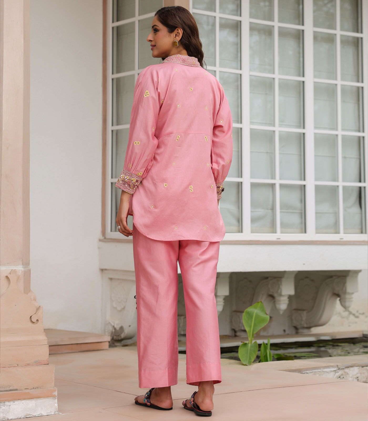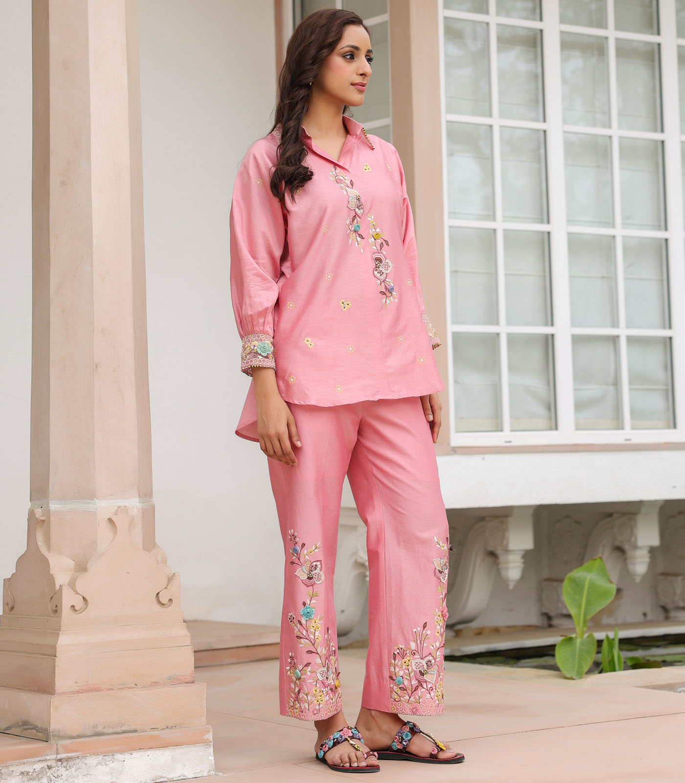 This co-ord set comes with floral threadwork embroidery enhanced with handmade 3d flowers and bead work on the collar and cuff of the shirt. It is paired with flared pants with heavy embroidery at the hem.