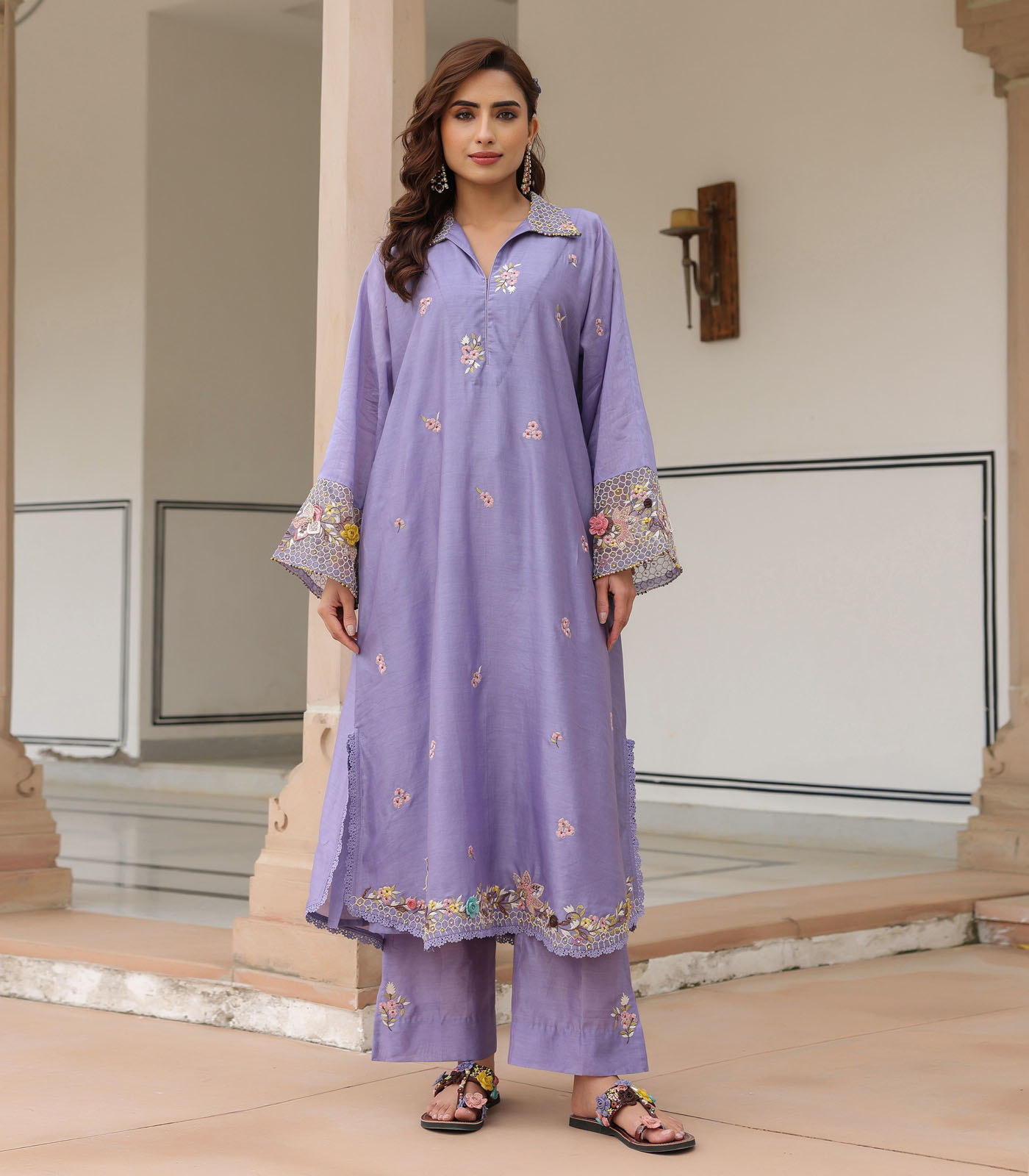 This 2 piece kurta set comes with floral thread work embroidery enhanced with handmade 3d flowers and bead work on the collar, sleeves and hem of the kurta along with butis spread all over. It is paired with embroidered pants.