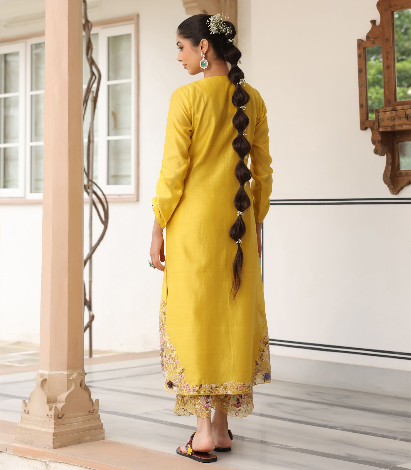 This 2 piece kurta set comes with heavy floral thread work embroidery enhanced with handmade 3d flowers and bead work on the neckline and hem of the kurta. It is paired with embroidered pants. Optional embroidered dupatta available on request.