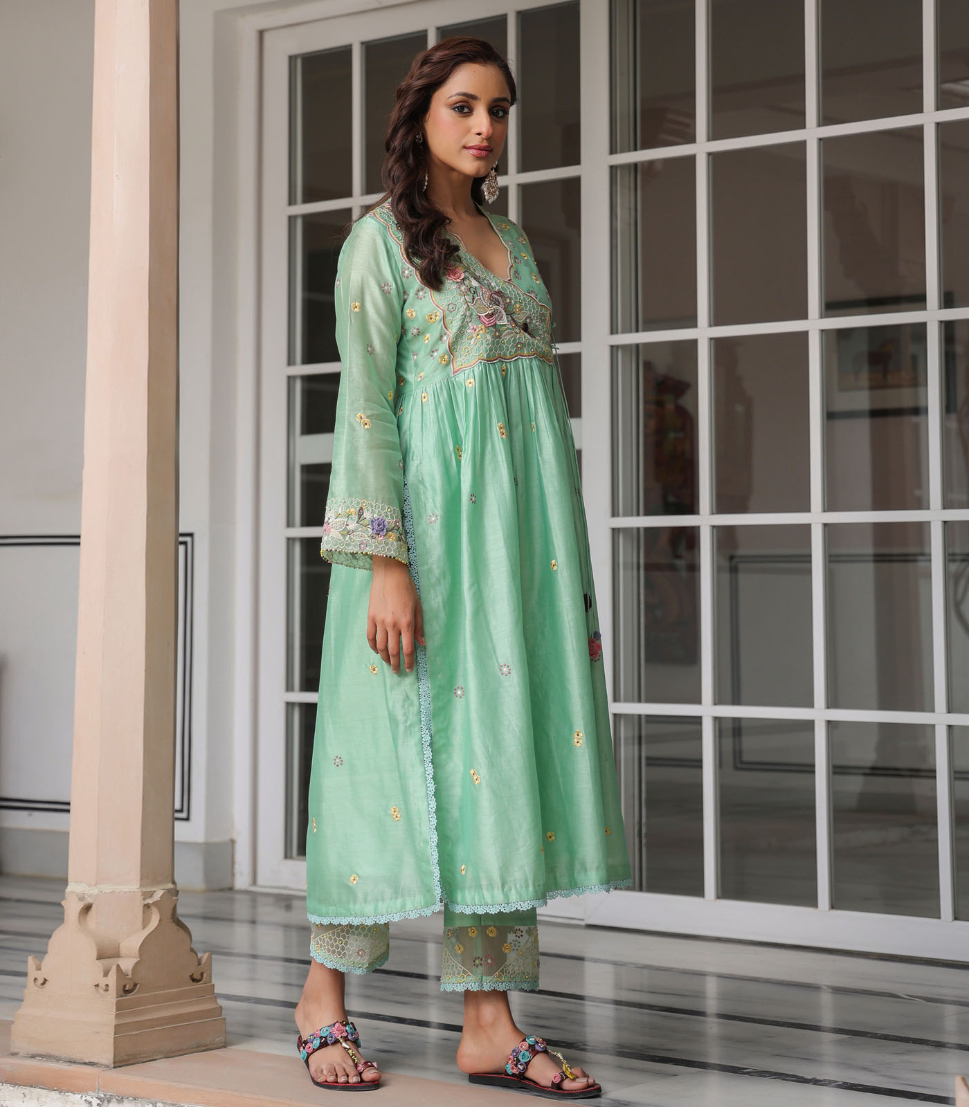 This 2 piece kurta set comes with heavy floral threadwork embroidery enahnced with handmade 3d flowers and bead work on the yoke, hem of the sleeves and butis spread all over the kurta. It is paired with embroidered pants. Optional embroidered dupatta available on request.
