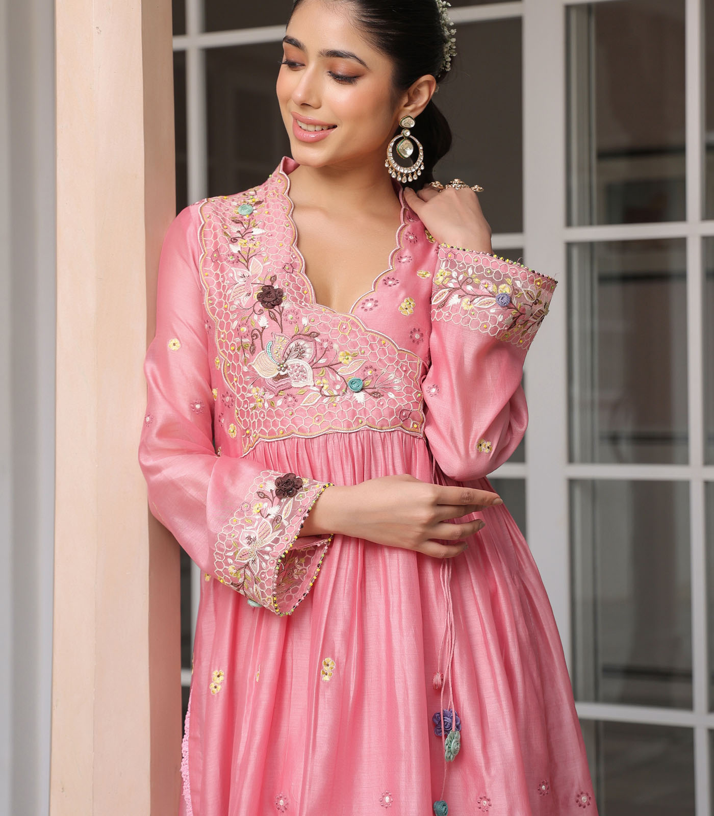This 2 piece kurta set comes with heavy floral threadwork embroidery enahnced with handmade 3d flowers and bead work on the yoke, hem of the sleeves and butis spread all over the kurta. It is paired with embroidered pants. Optional embroidered dupatta available on request.