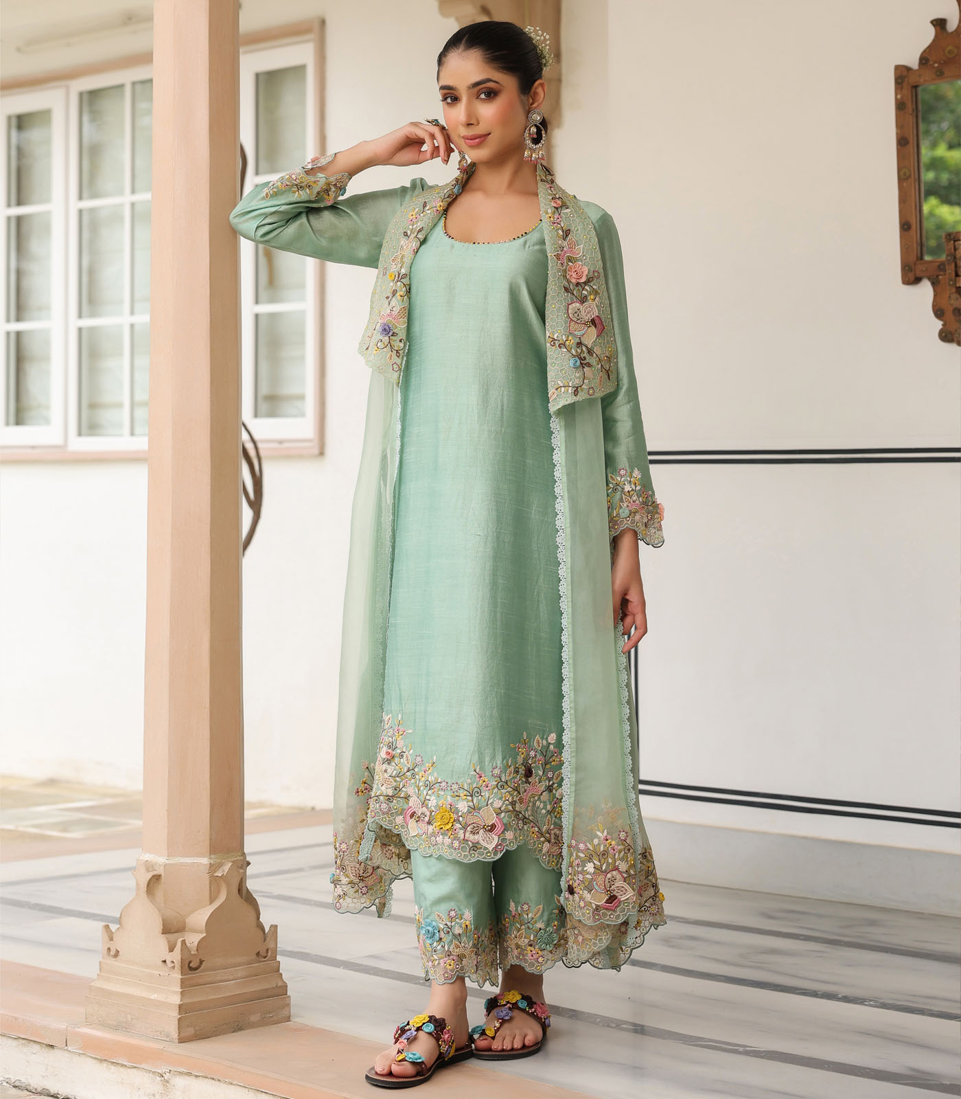 This 3 piece jacket style kurta set comes with heavy floral threadwork embroidery enhanced with handmade 3d flowers and bead work on the sleeves, hem of the kurta, collar and hem of the jacket. It is paired with embroidered pants.