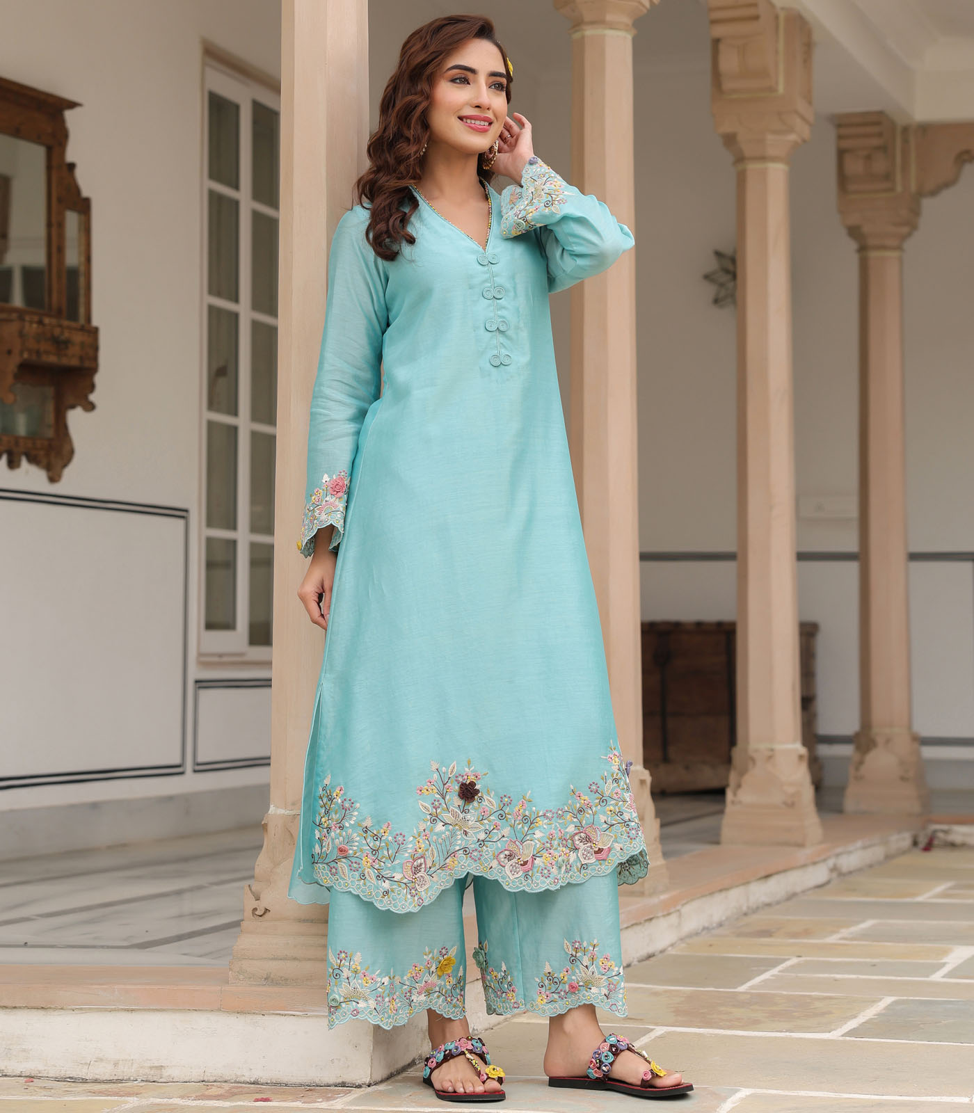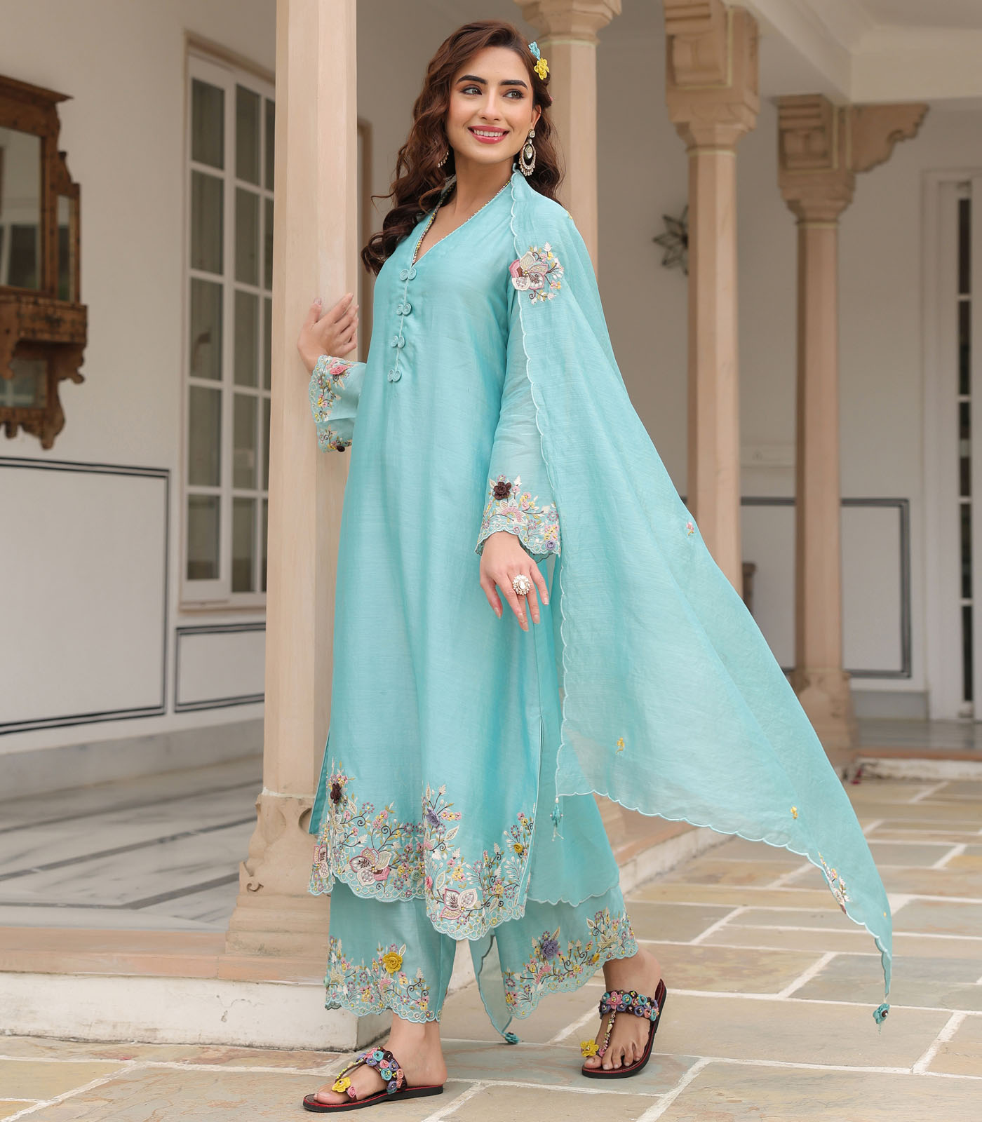 This 2 piece kurta set comes with heavy floral threadwork embroidery enahnced with handmade 3d flowers and bead work on the sleeves and hem of the kurta. It is paired with embroidered pants. Optional embroidered dupatta available on request.