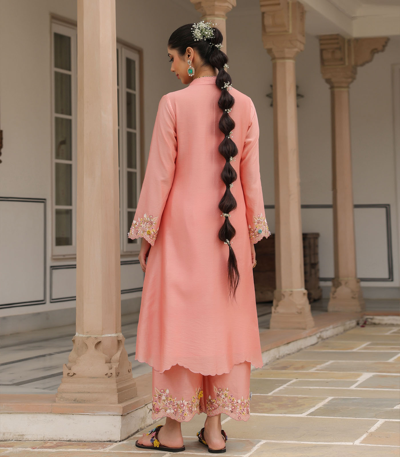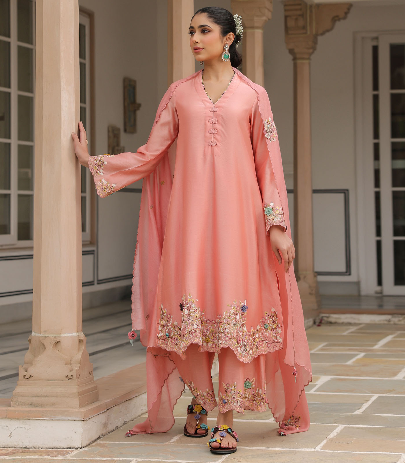 This 2 piece kurta set comes with heavy floral threadwork embroidery enahnced with handmade 3d flowers and bead work on the sleeves and hem of the kurta. It is paired with embroidered pants. Optional embroidered dupatta available on request.