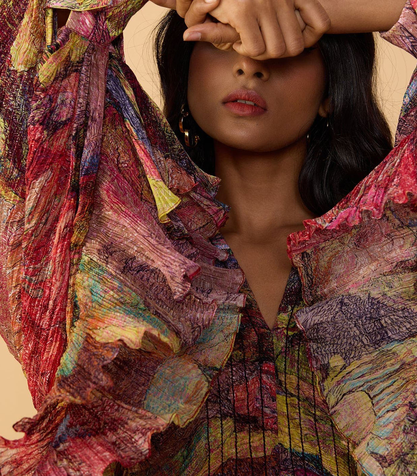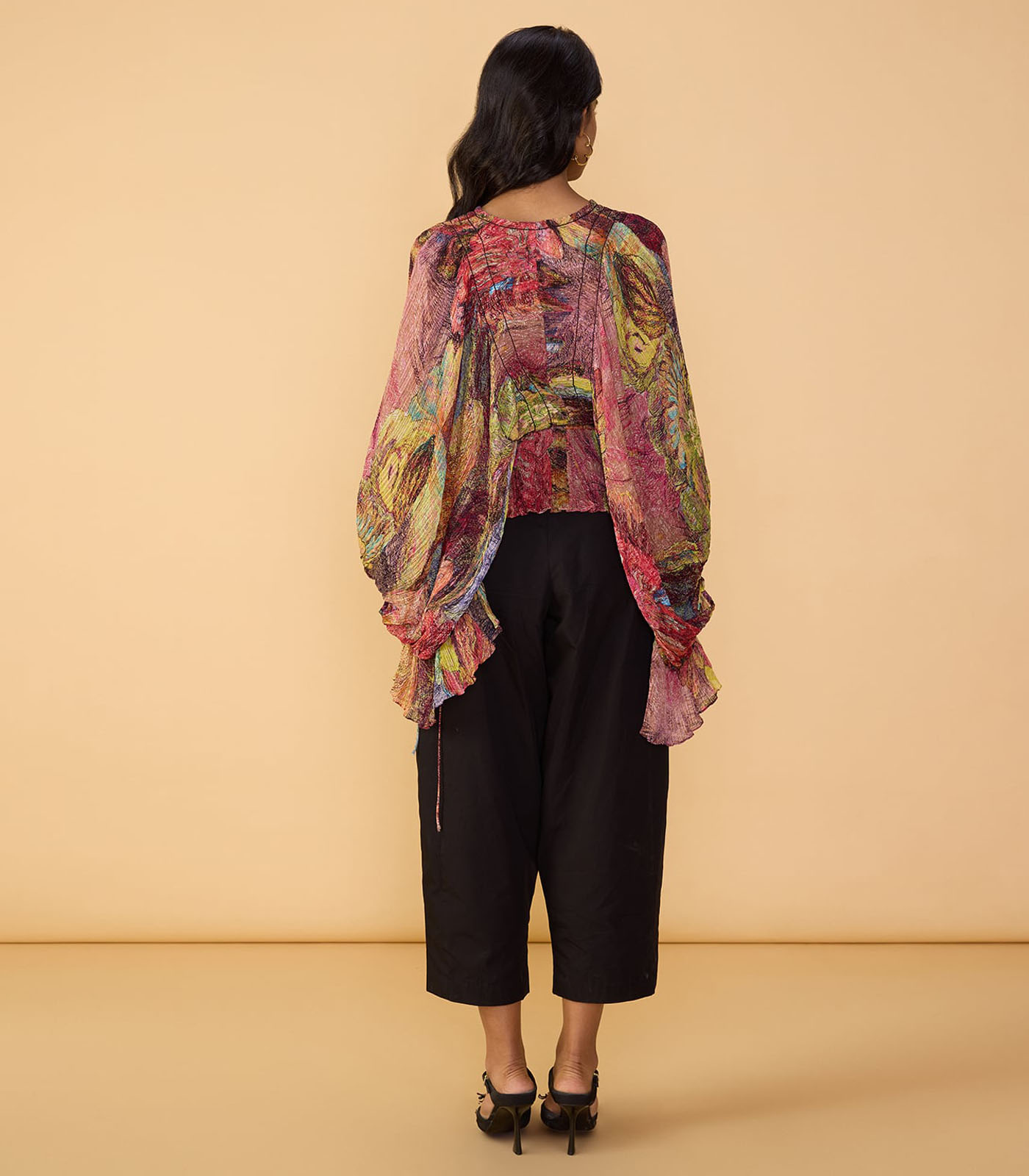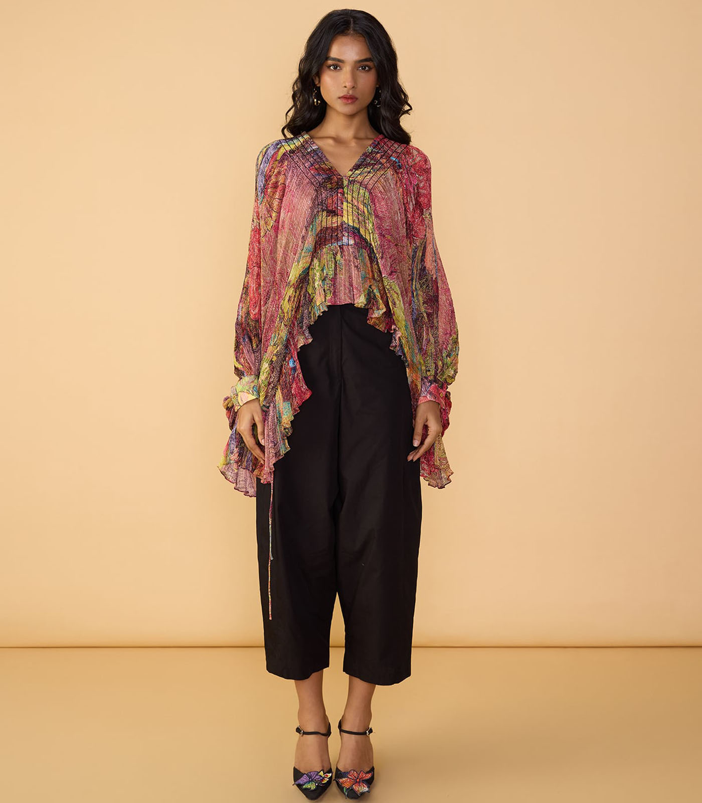 Blouse : Abstract floral print, hand micro pleated v neck, kaftan style blouse with stitch detailing and flared sleeves
