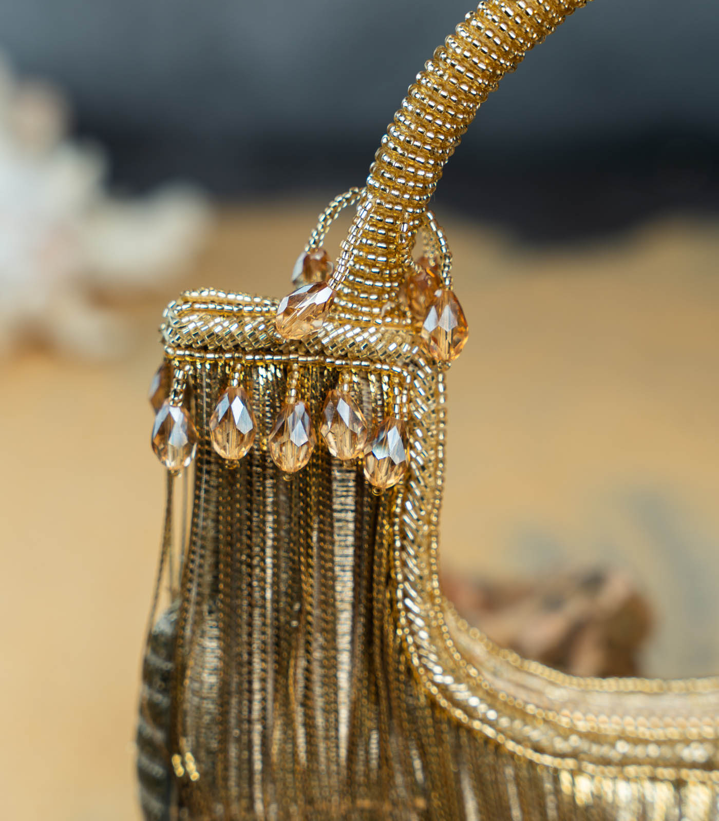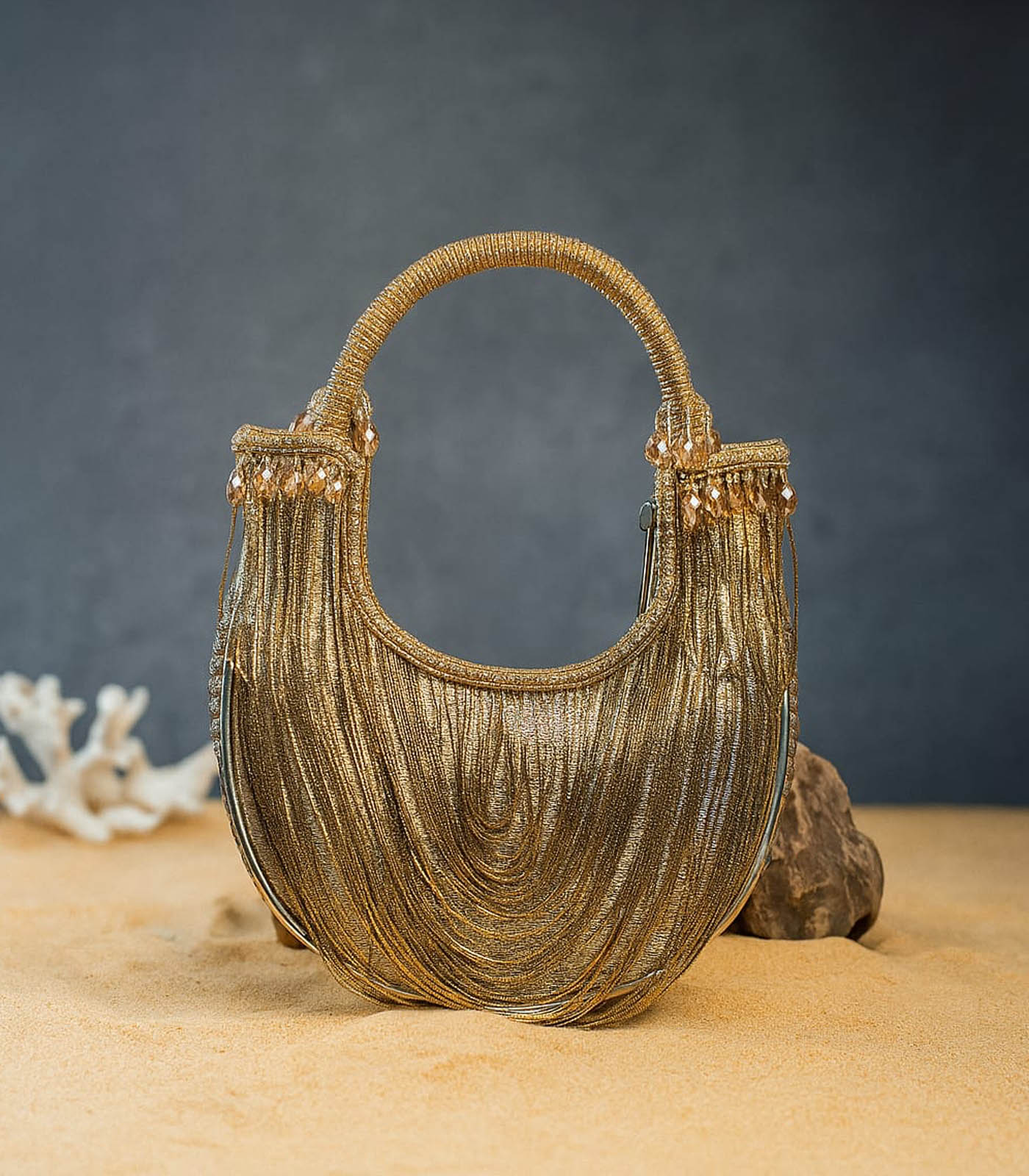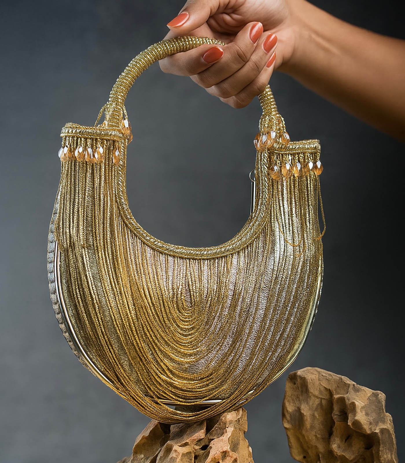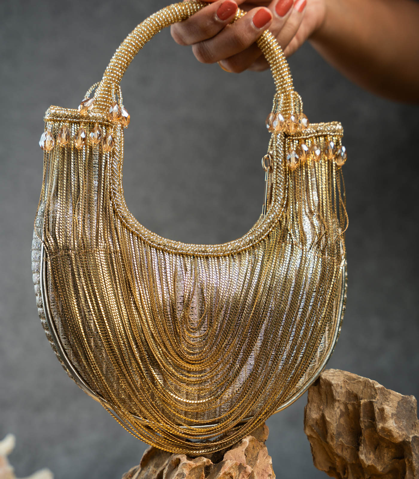 It doesn’t get more modish than this gold tasseled boat shaped bag accompanied with metallic chains throughout making it an “oh la la” addition to any contemporary fit. It works like a mini bag and comes with a dazzling beaded handle finish making it a convenient and fashionable addition. Whether you’re dressing for a wedding, festive celebration, or a formal evening, this Potli adds just the right amount of glamour—proof that sometimes, less truly is more.