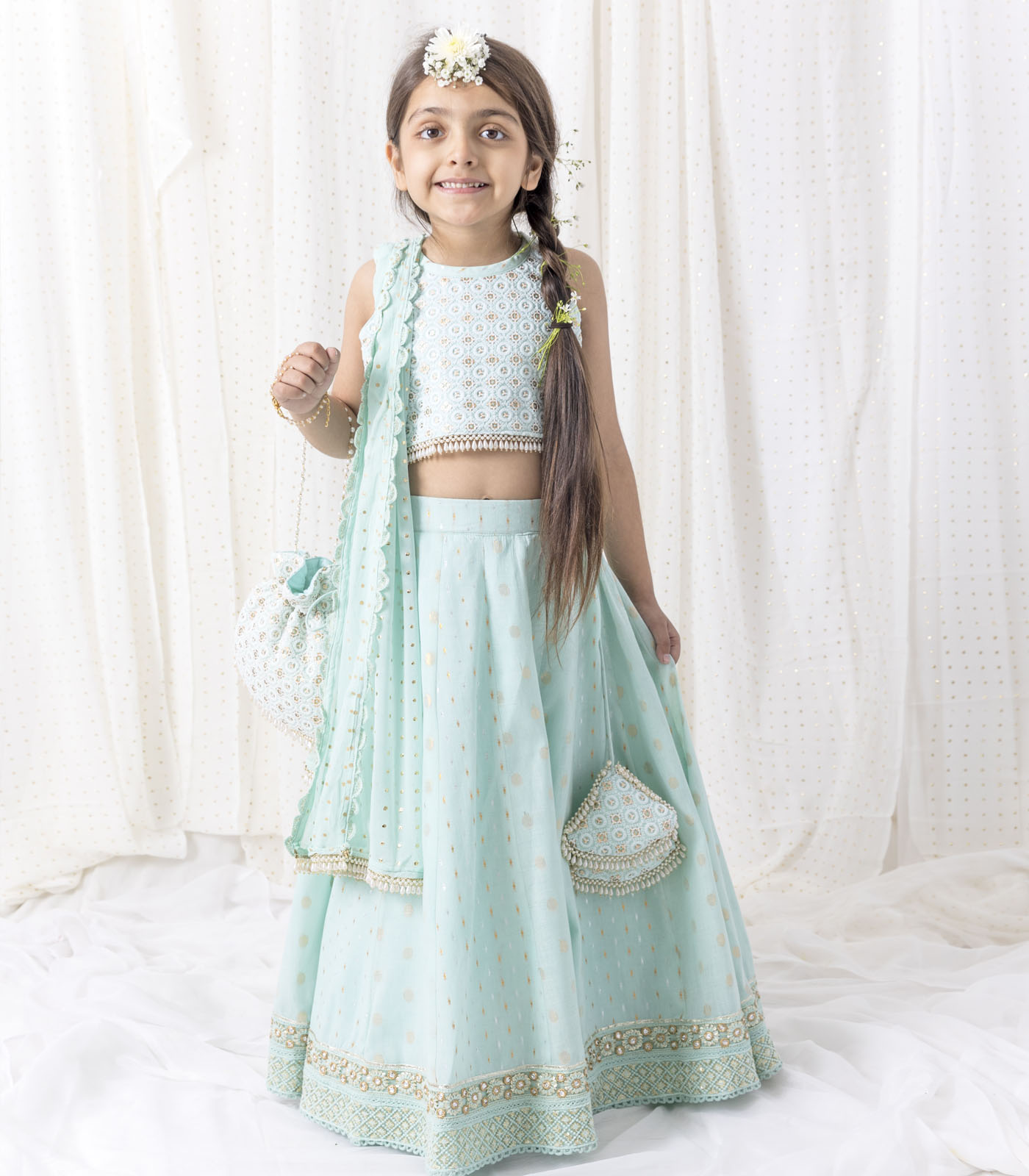 Lehnga is sold with thread work and sequence embroided top with pearl detailing and dupatta