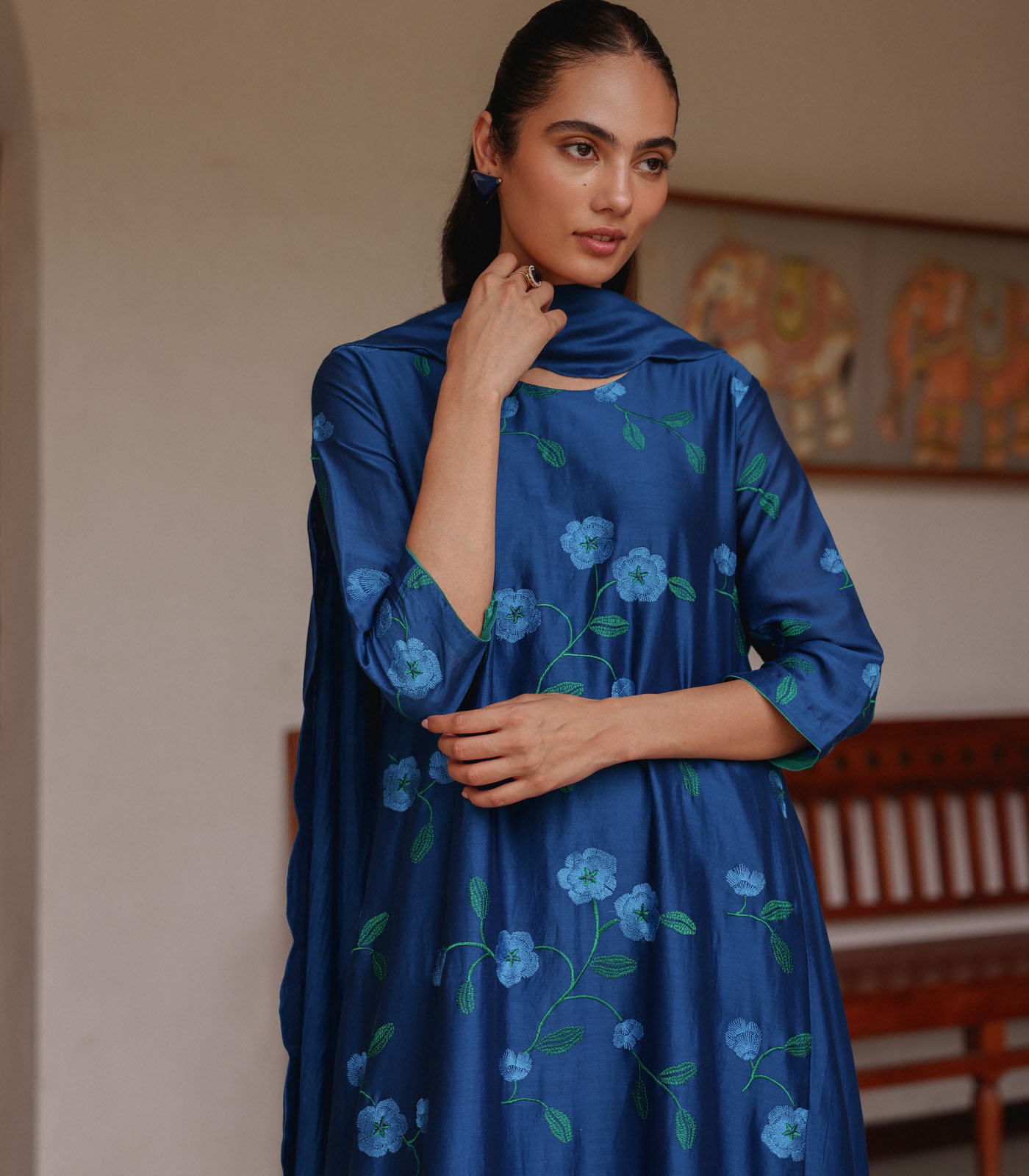Step into festive elegance with the Indigo Bloom Anarkali Set, crafted in a vibrant, deep shade that shines in every celebration. Its flowing silhouette sways with your every move, adorned with delicate floral embroidery and finished with a scalloped-edge dupatta.