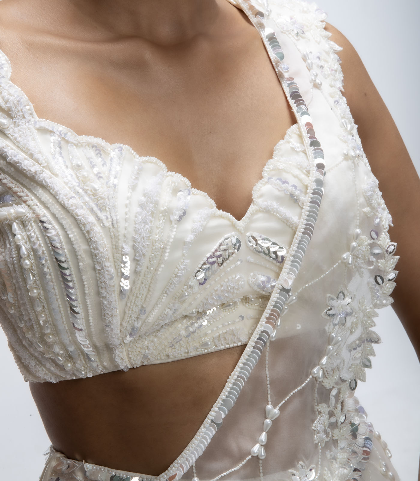 Featuring an ivory illume draped saree in pure silk organza and pure georgette base with cutdana, sequins, french-cut and moti embellishments. It is paired with an embellished blouse. Accentuate it with zircon jewellery, a clutch and block heels for a wedding, sangeet or engagement ceremonies.