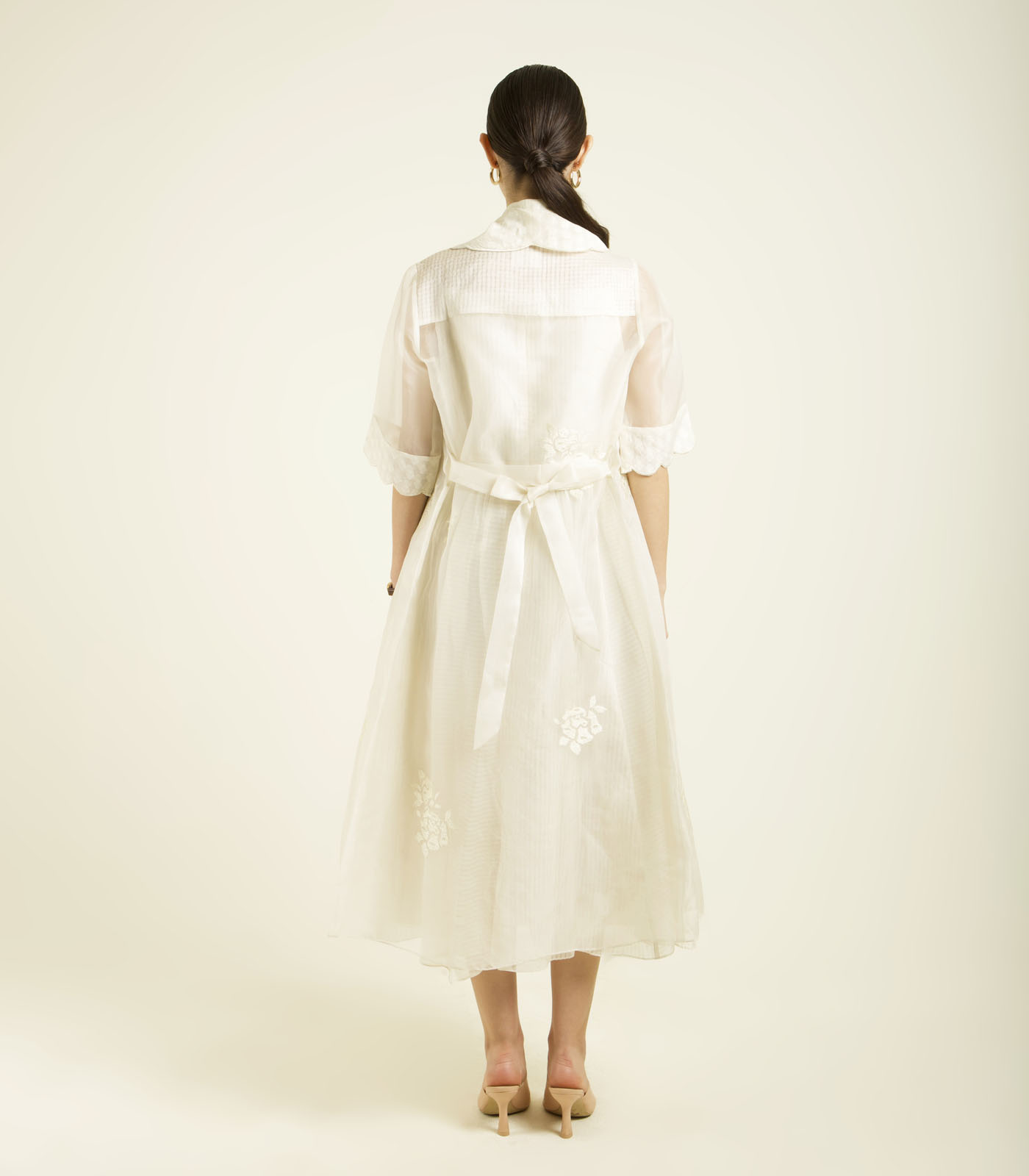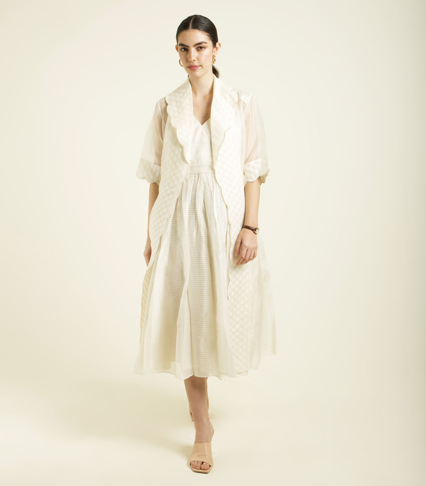 IVORY ORGANZA JACKET WITH EMBROIDERY AND STRAP DRESS IN STRIPE ORGANZA