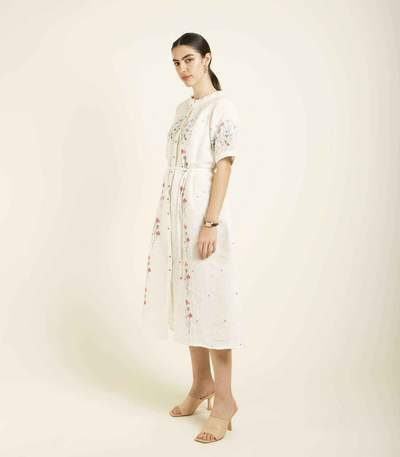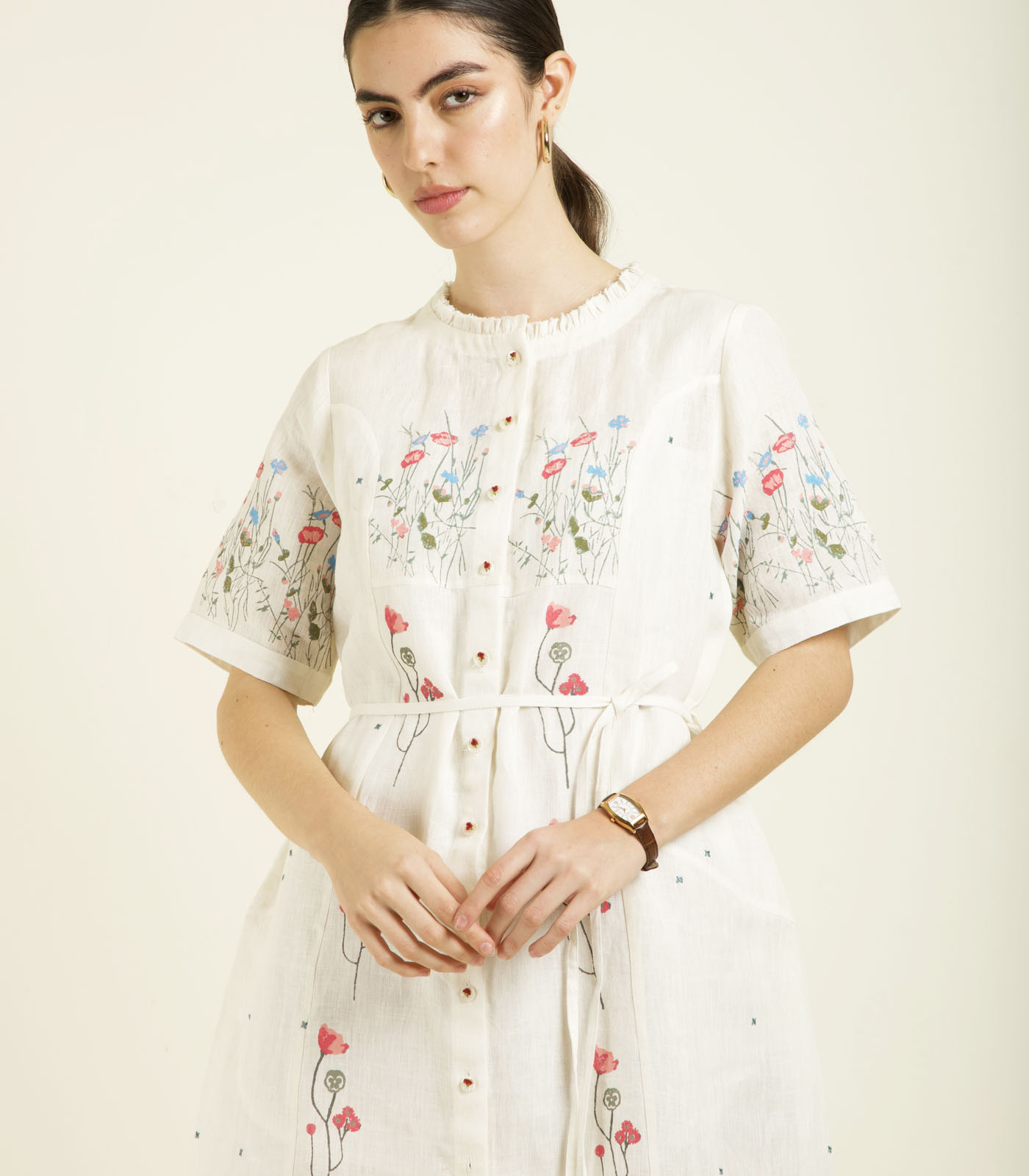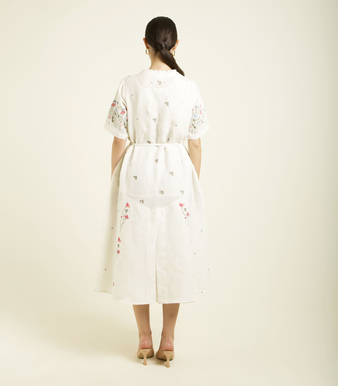 IVORY PRINTED A-LINE DRESS IN LINEN