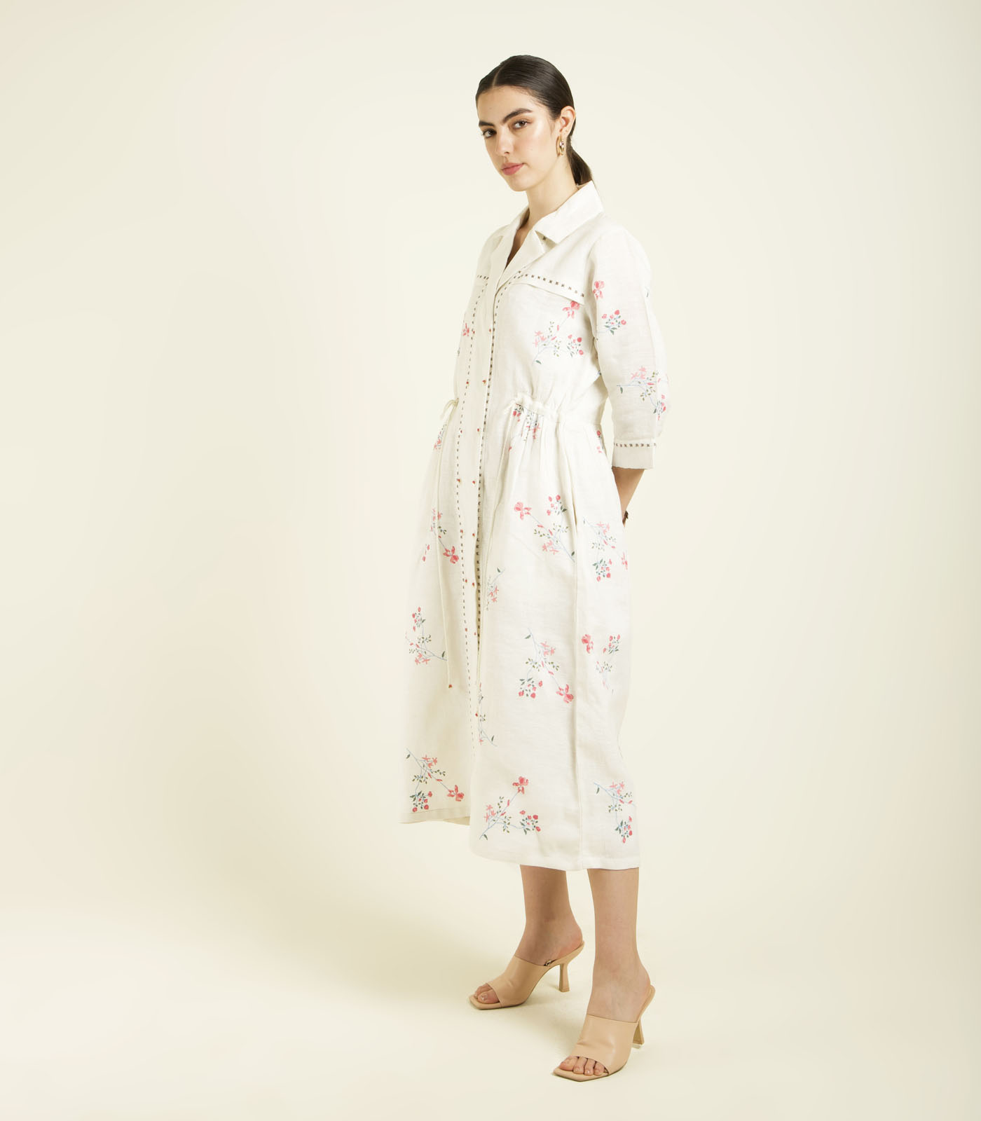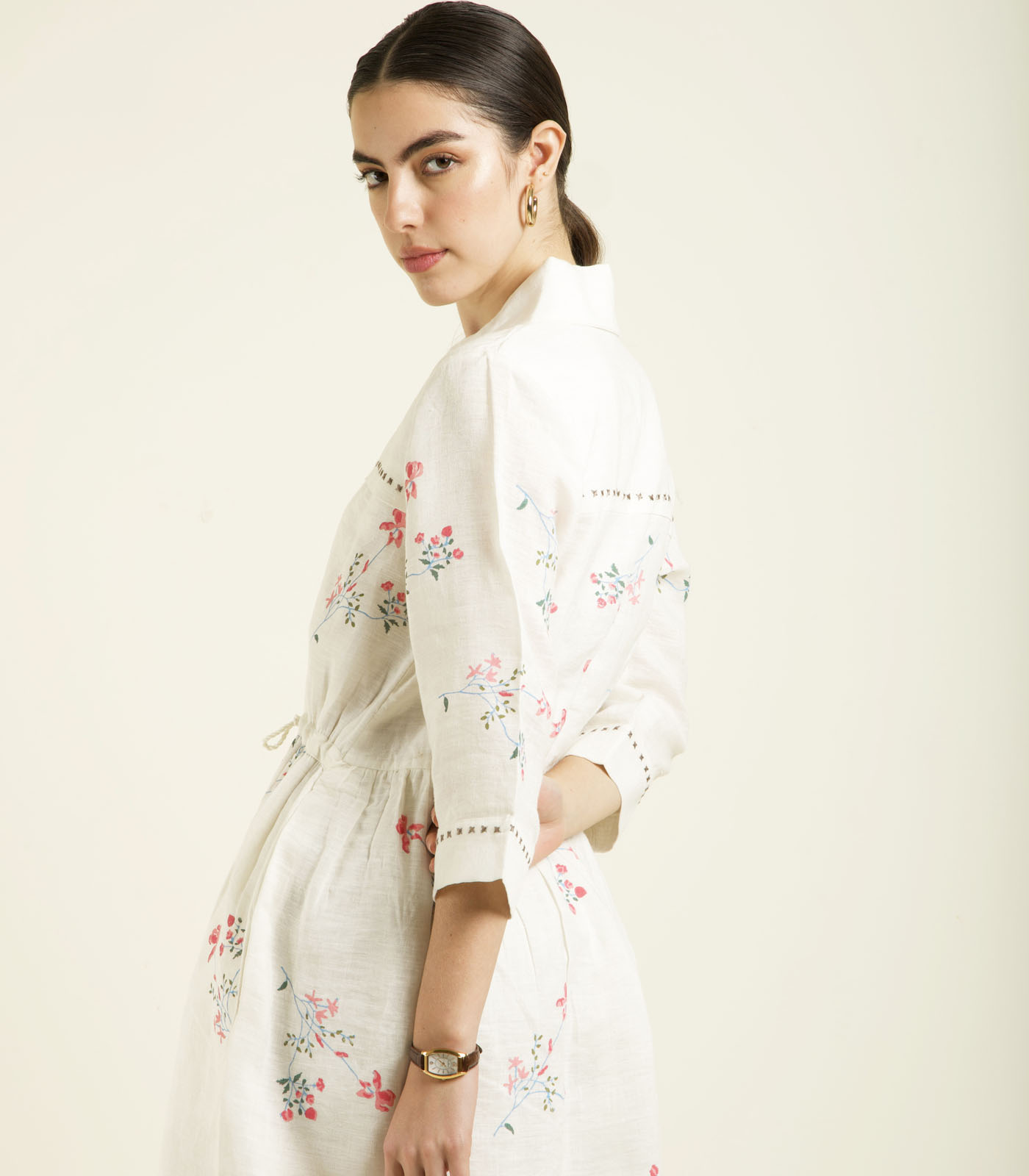 IVORY PRINTED SIDE GATHERED SHIRT DRESS IN LINEN