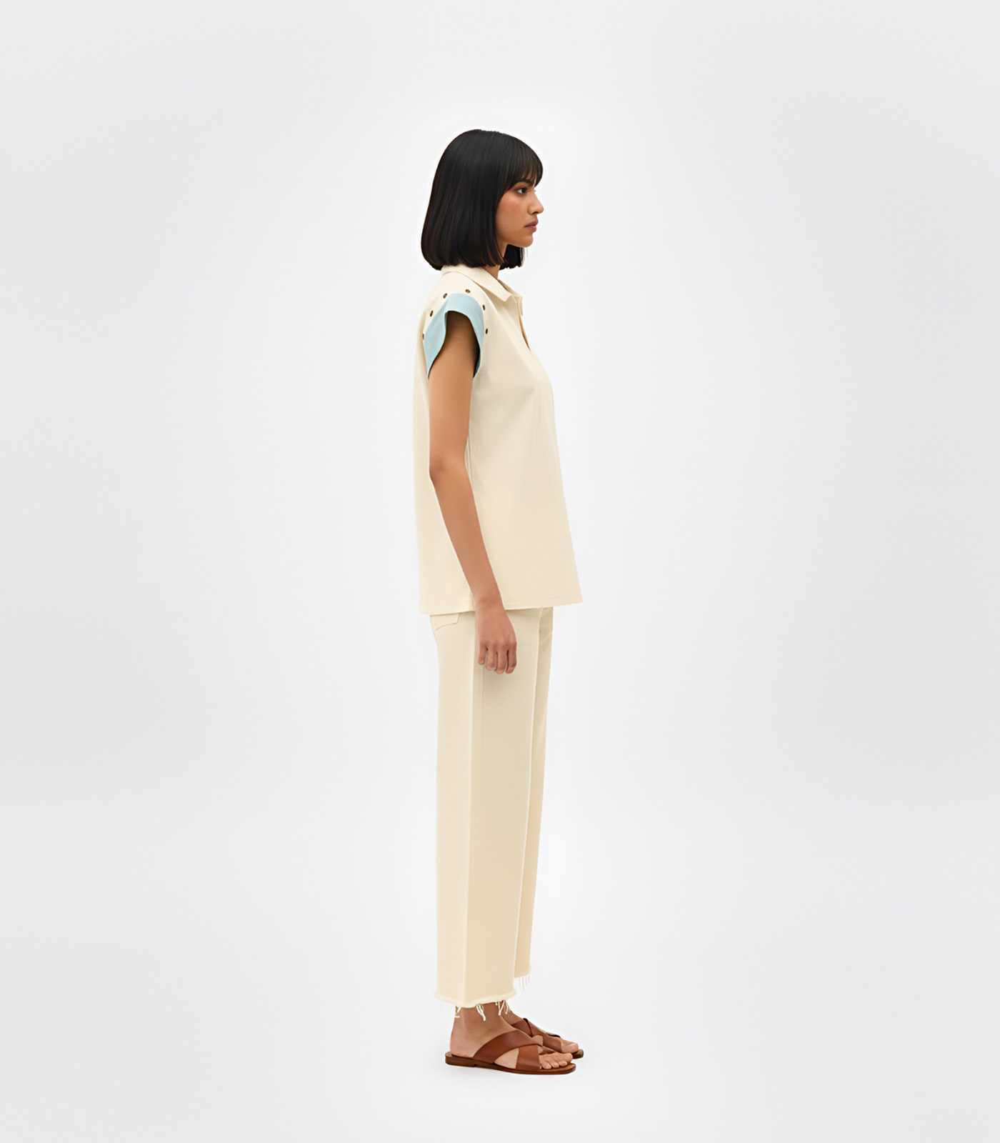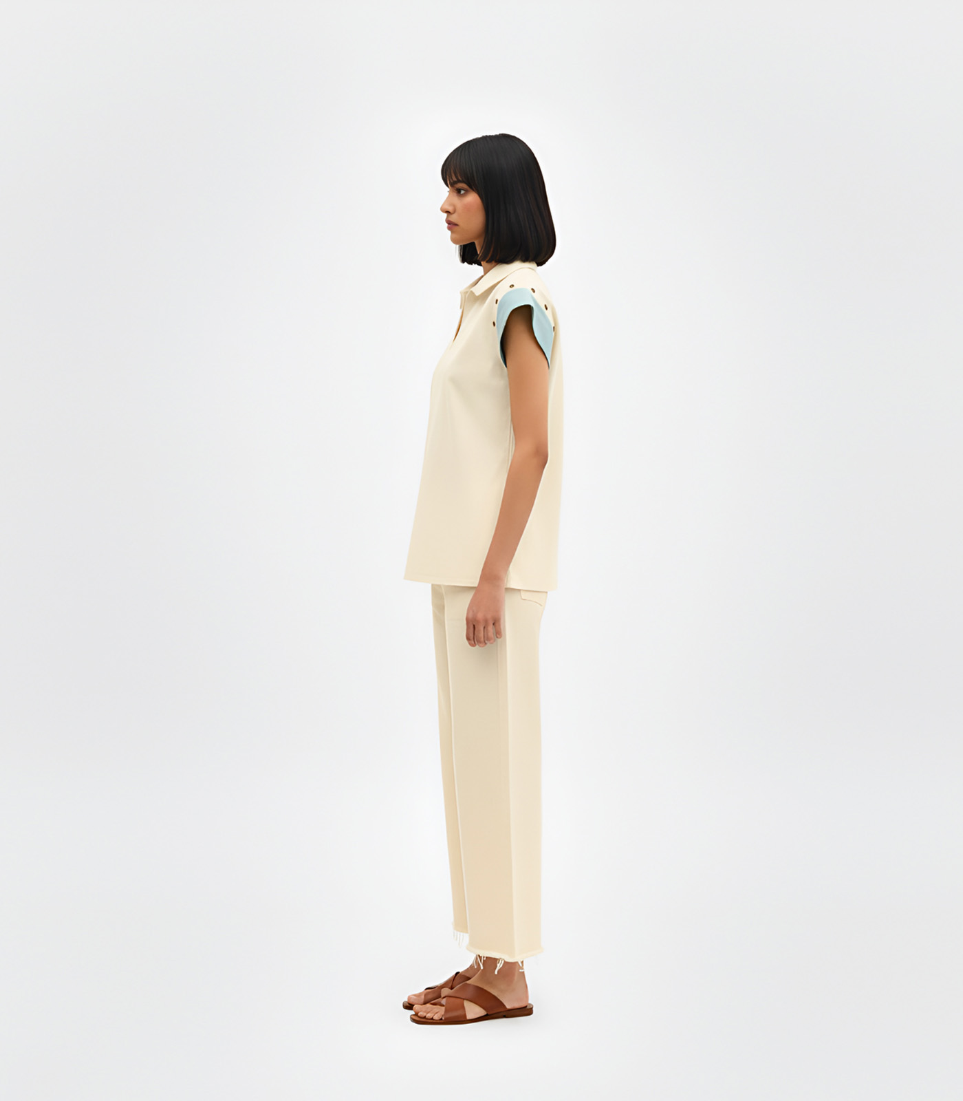 This elegant co-ord set in ivory-tiffany blue features a patch detail on the sleeves with a wooden button detail, showcasing craftsmanship. Paired with matching pants with wooden button detail on the hem adnd are rugged at the bottom and the back has also wooden buttons detail in the centre of the top, the set exudes a harmonious blend of style and comfort. Perfect for making a seamless transition from day to night.