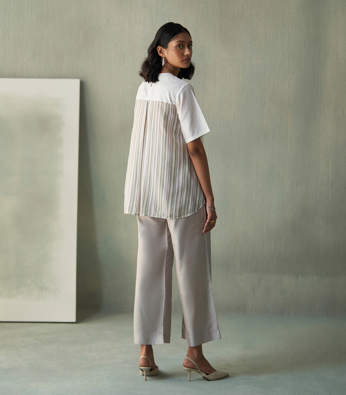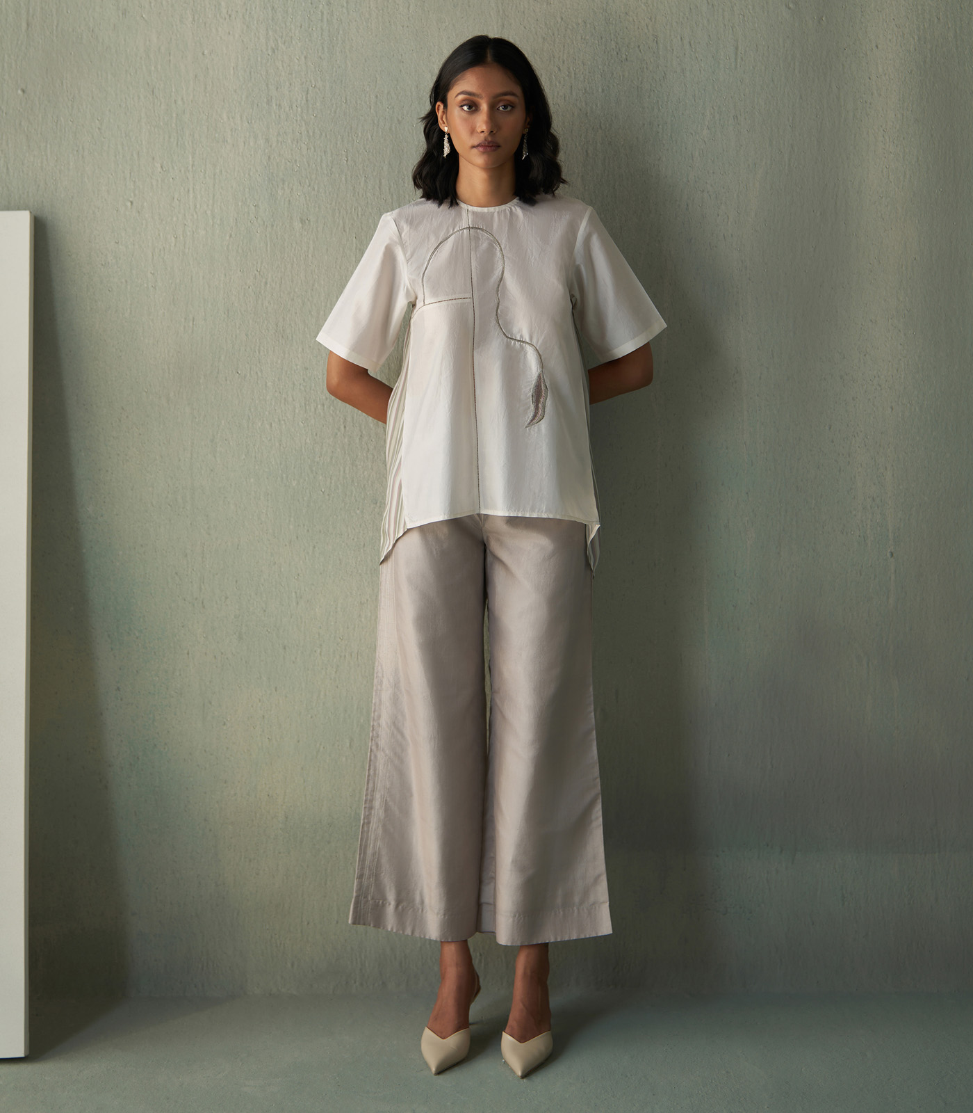 Crafted in soft silk, this asymmetric ivory top blends structure with subtle whimsy. The front features abstract leaf embroidery in muted tones, while the back unfolds into a panel of pastel stripes that add unexpected movement and charm. Relaxed yet refined, it’s a versatile top that pairs best with our grey Native Silk Trousers for an effortless everyday look.