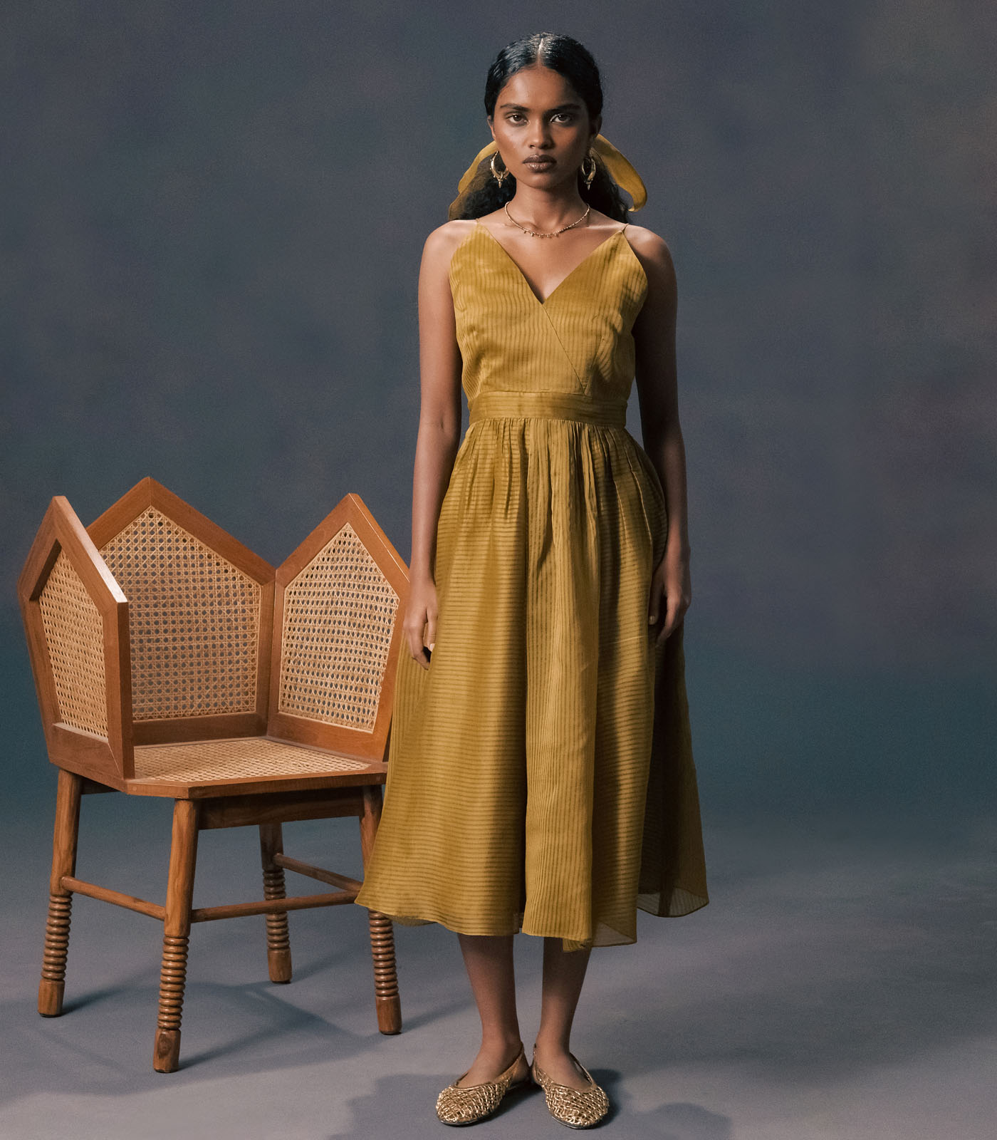 MOSS GREEN ORGANZA JACKET WITH EMBROIDERY AND STRAP DRESS IN STRIPE ORGANZA
