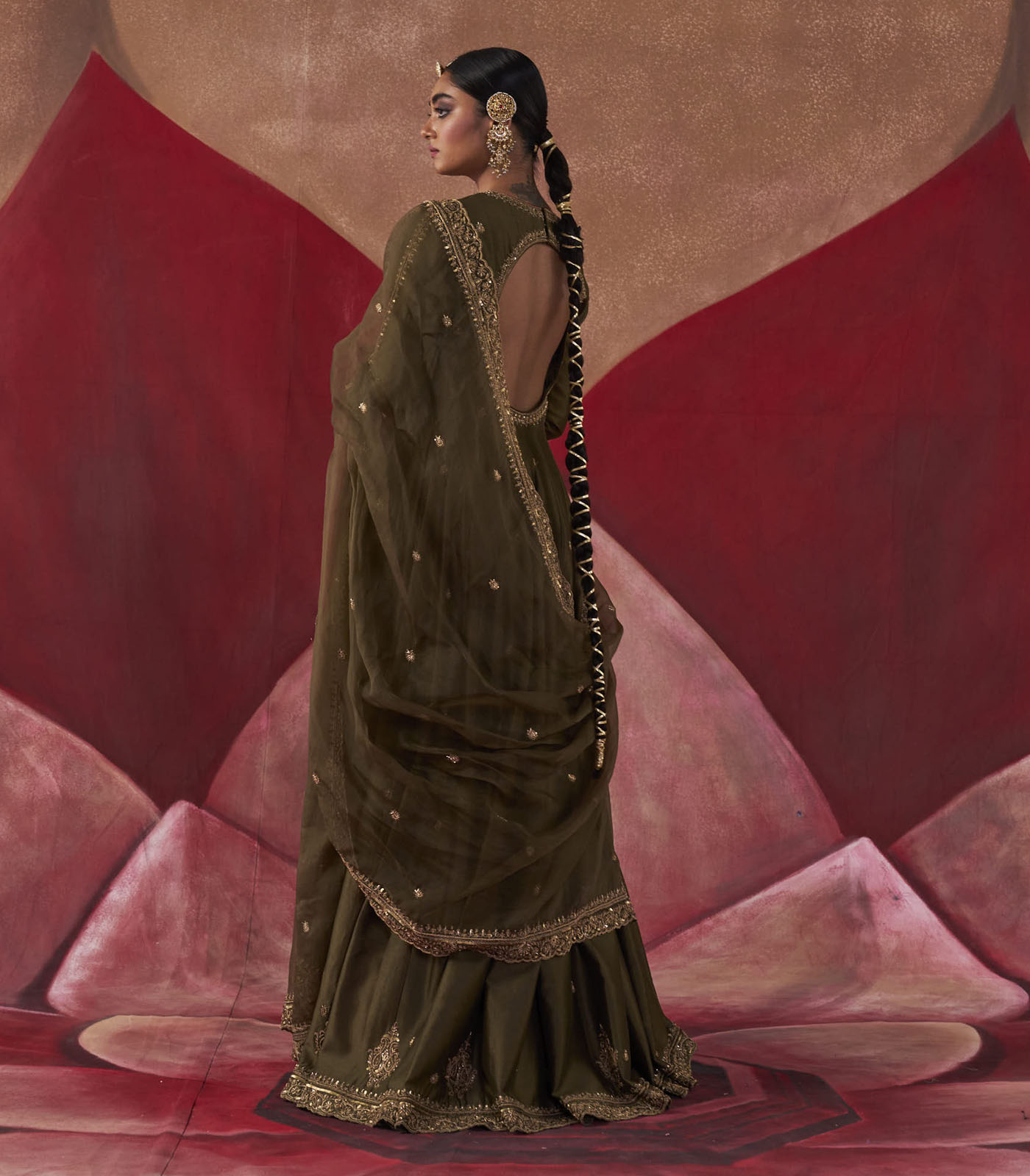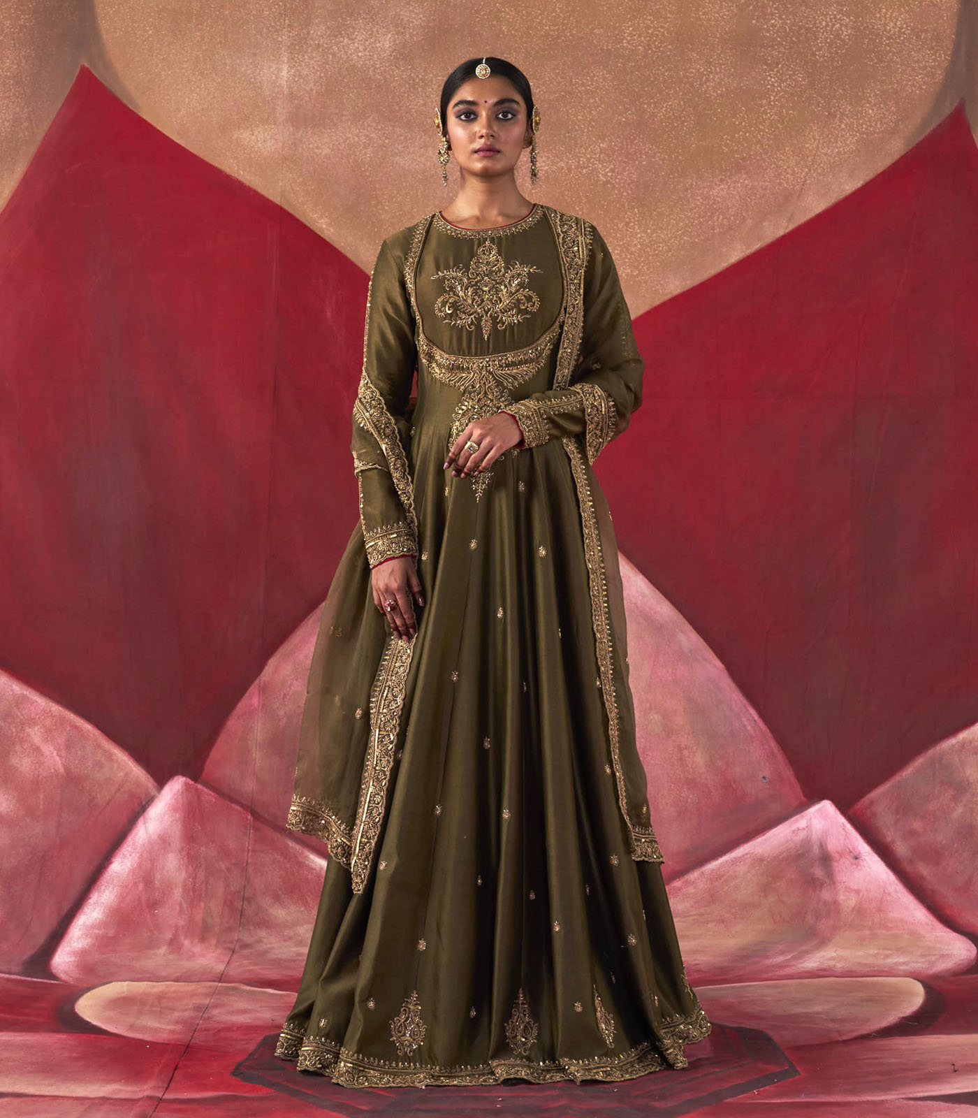 Featuring an Olive chanderi silk anarkali set paired with an organza base dupatta with antique gold dori and embellished hand embroidery.