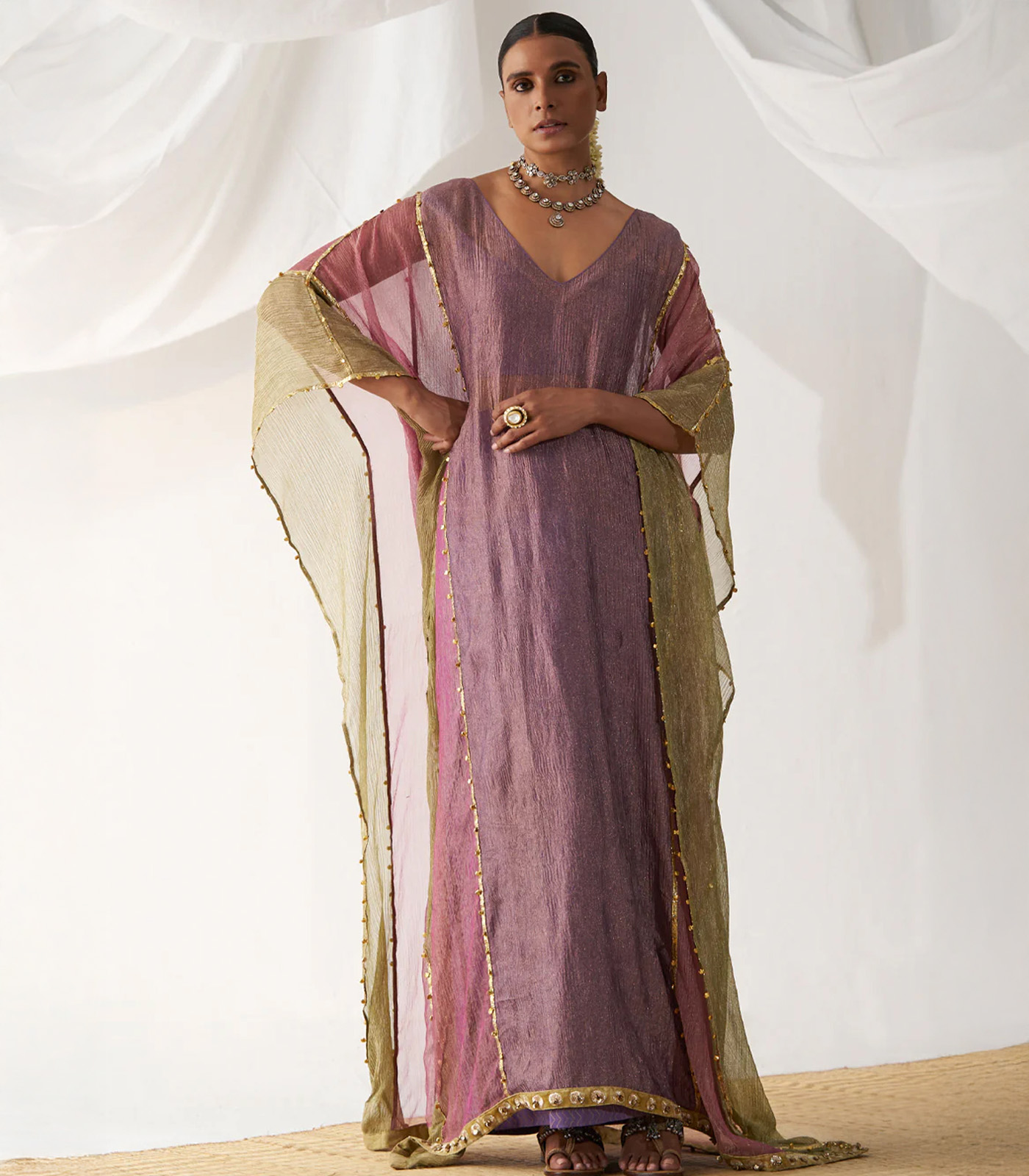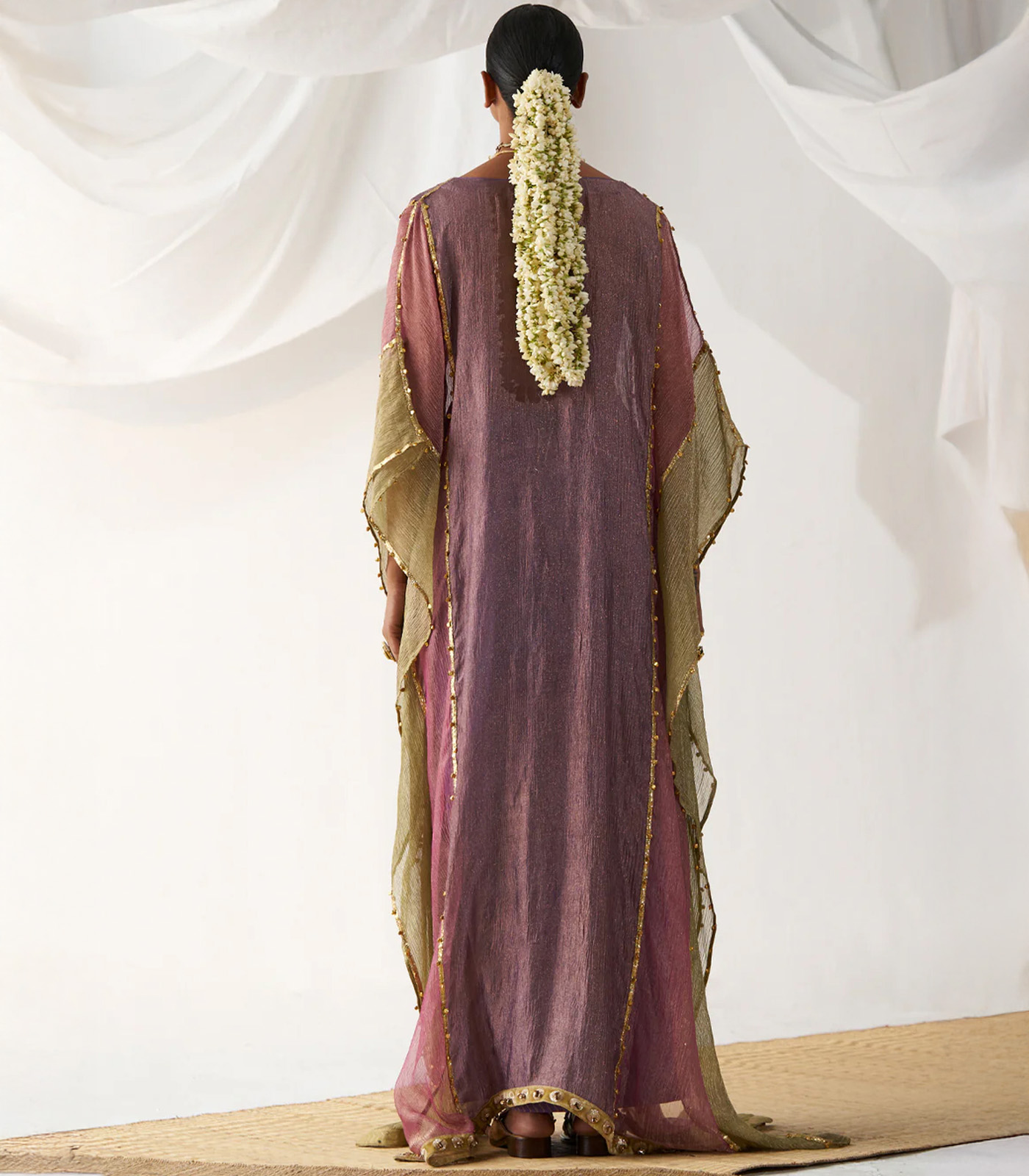 Color blocked kaftan with ghunghroo and vertical gota stripes detailing