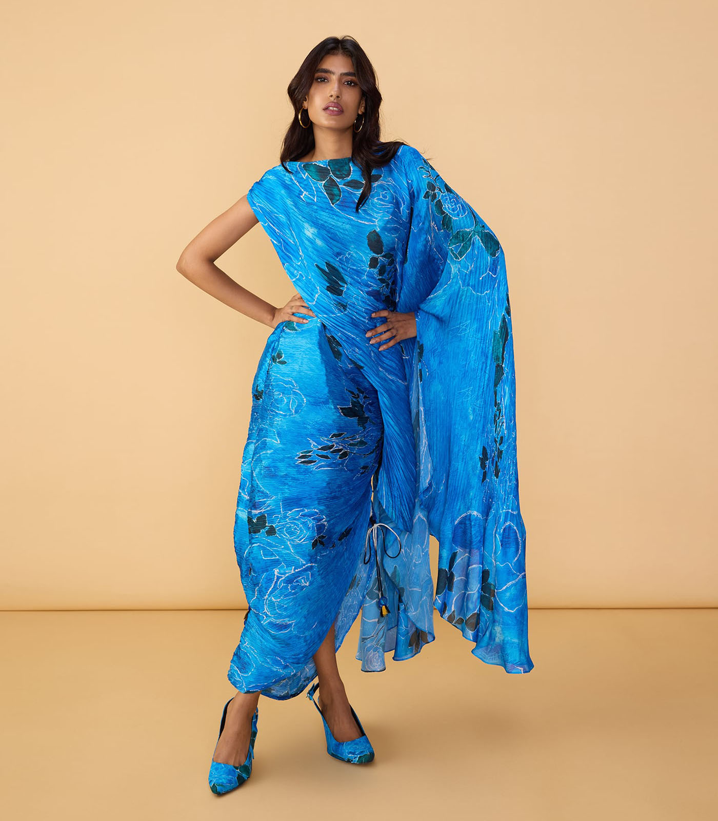 Rose print hand micro pleat kaftan style dress with adjustable drawstring length, and off shoulder trail
