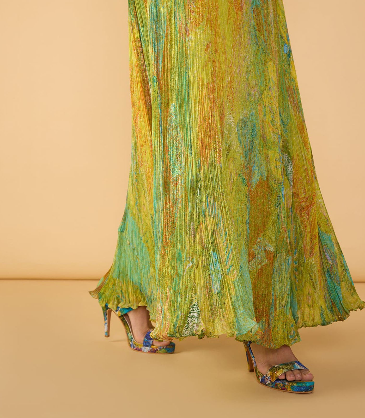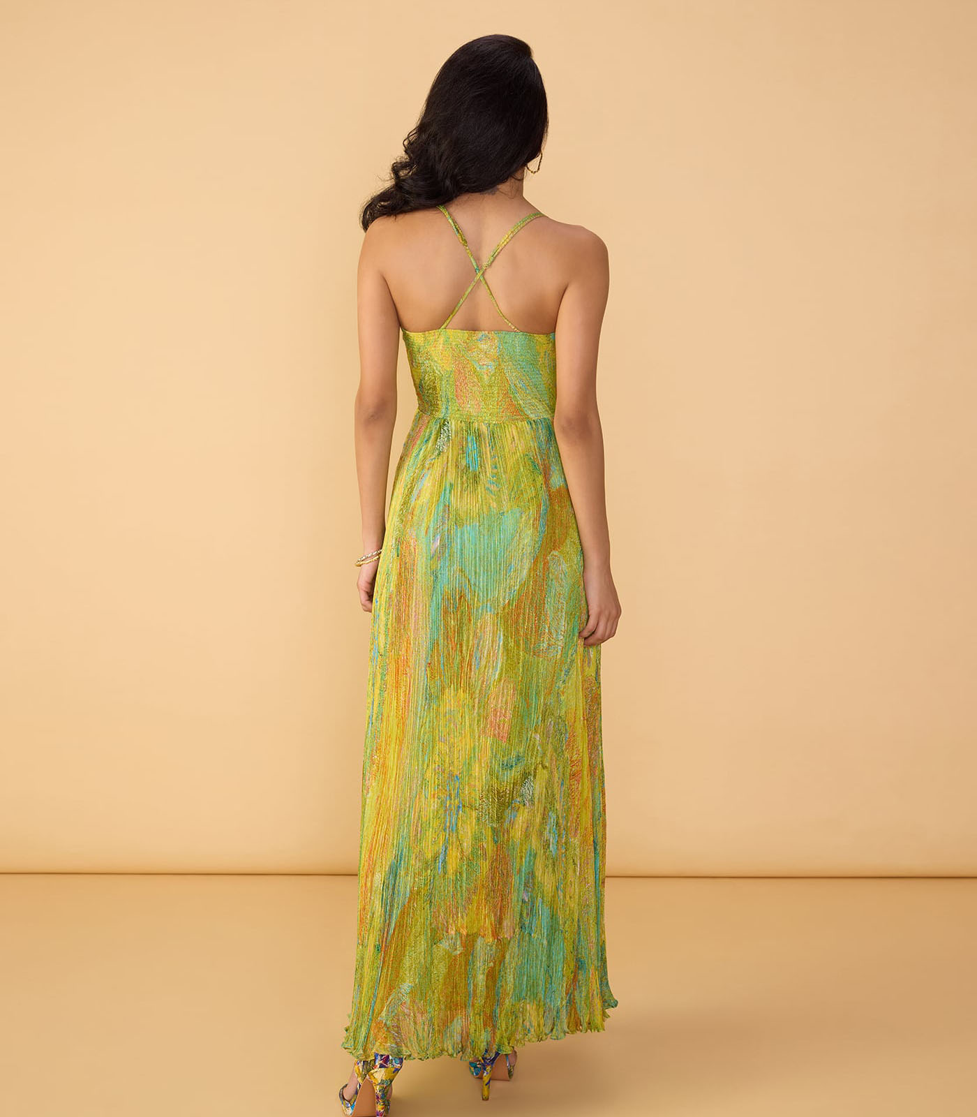 Abstract floral print, hand micro pleat maxi dress with adjustable straps