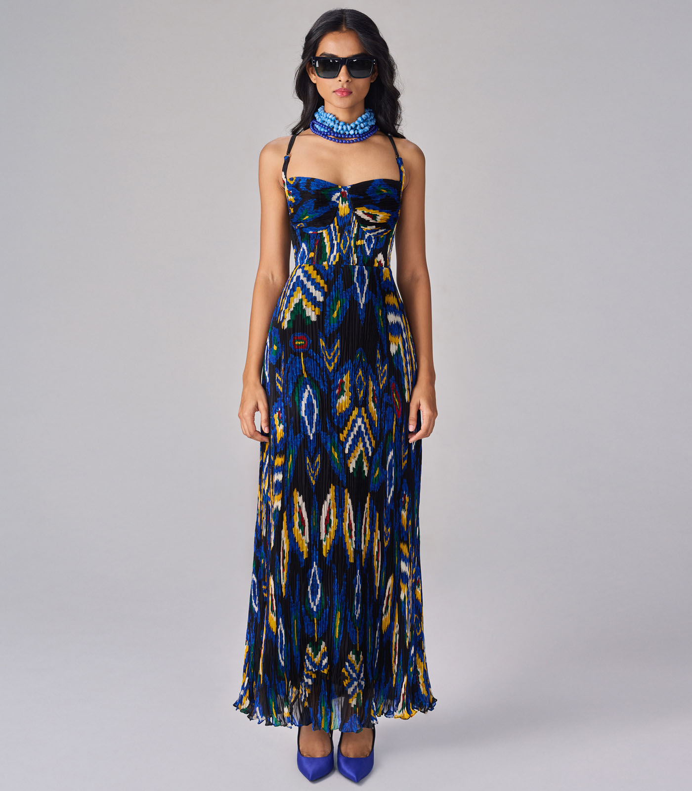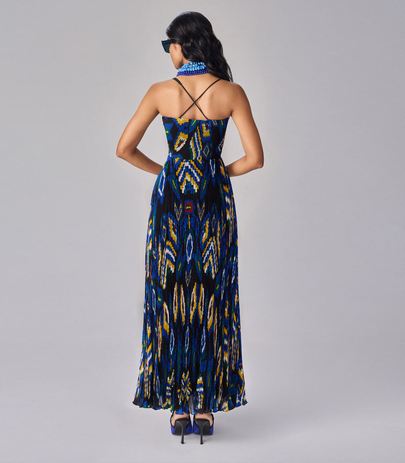 Aztec print, hand micro pleat maxi dress with adjustable straps
