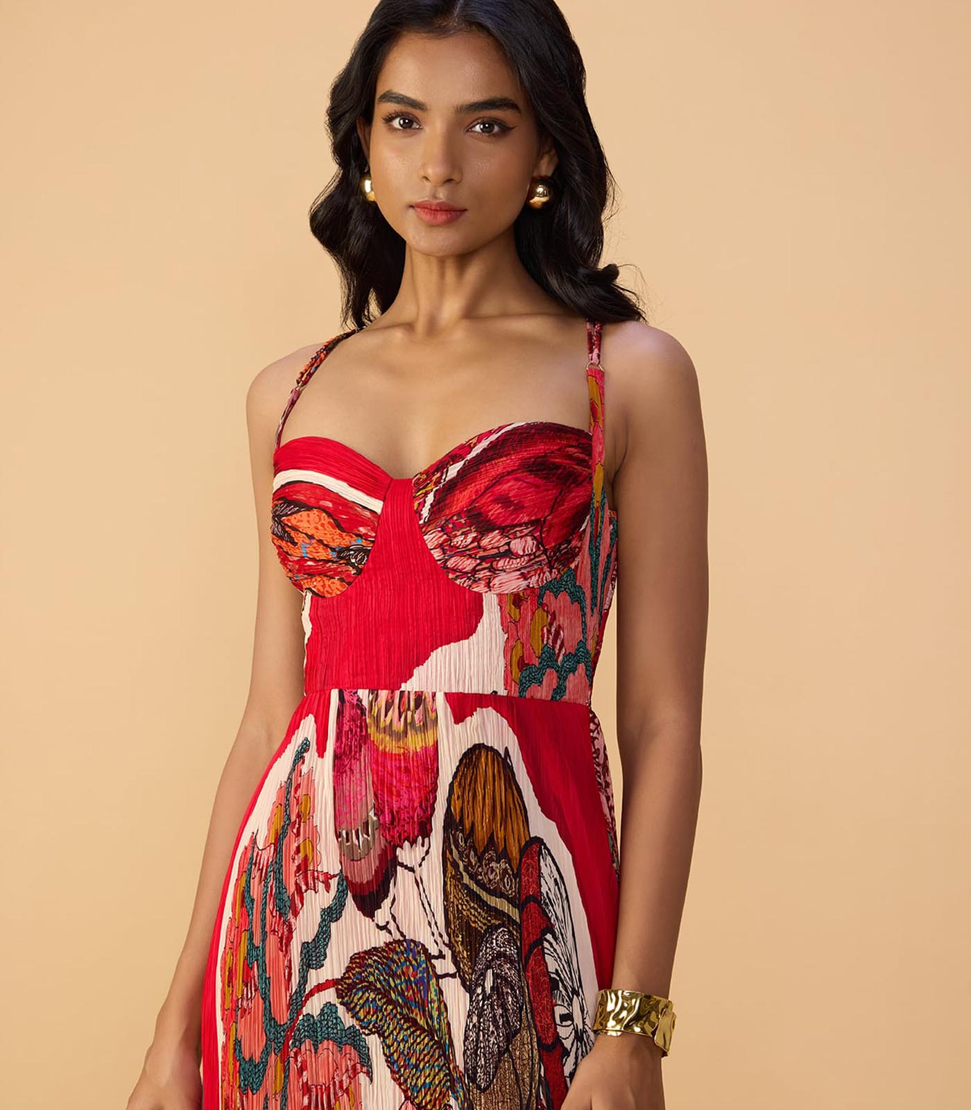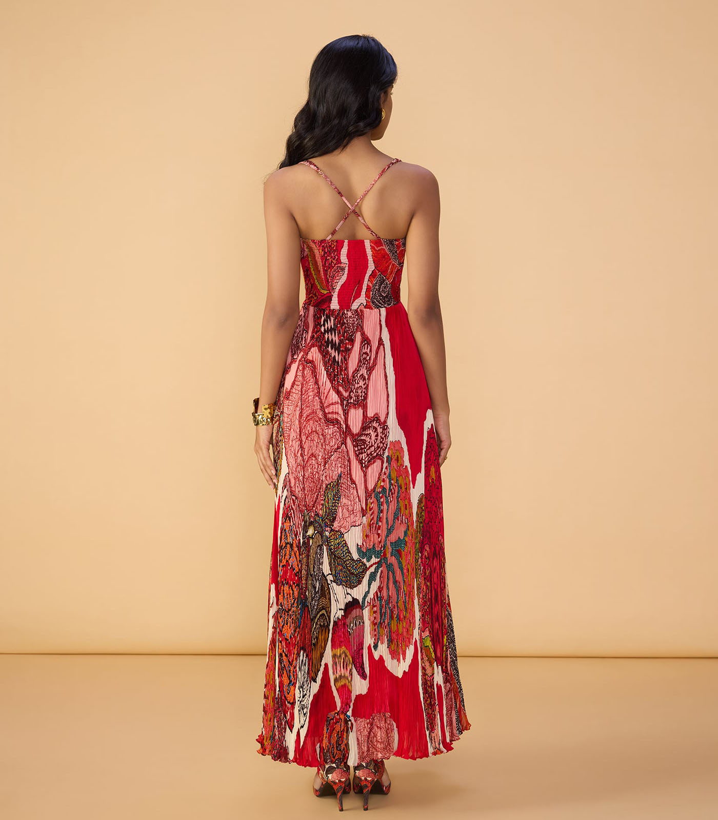 Abstract print, hand micro pleat maxi dress with adjustable straps