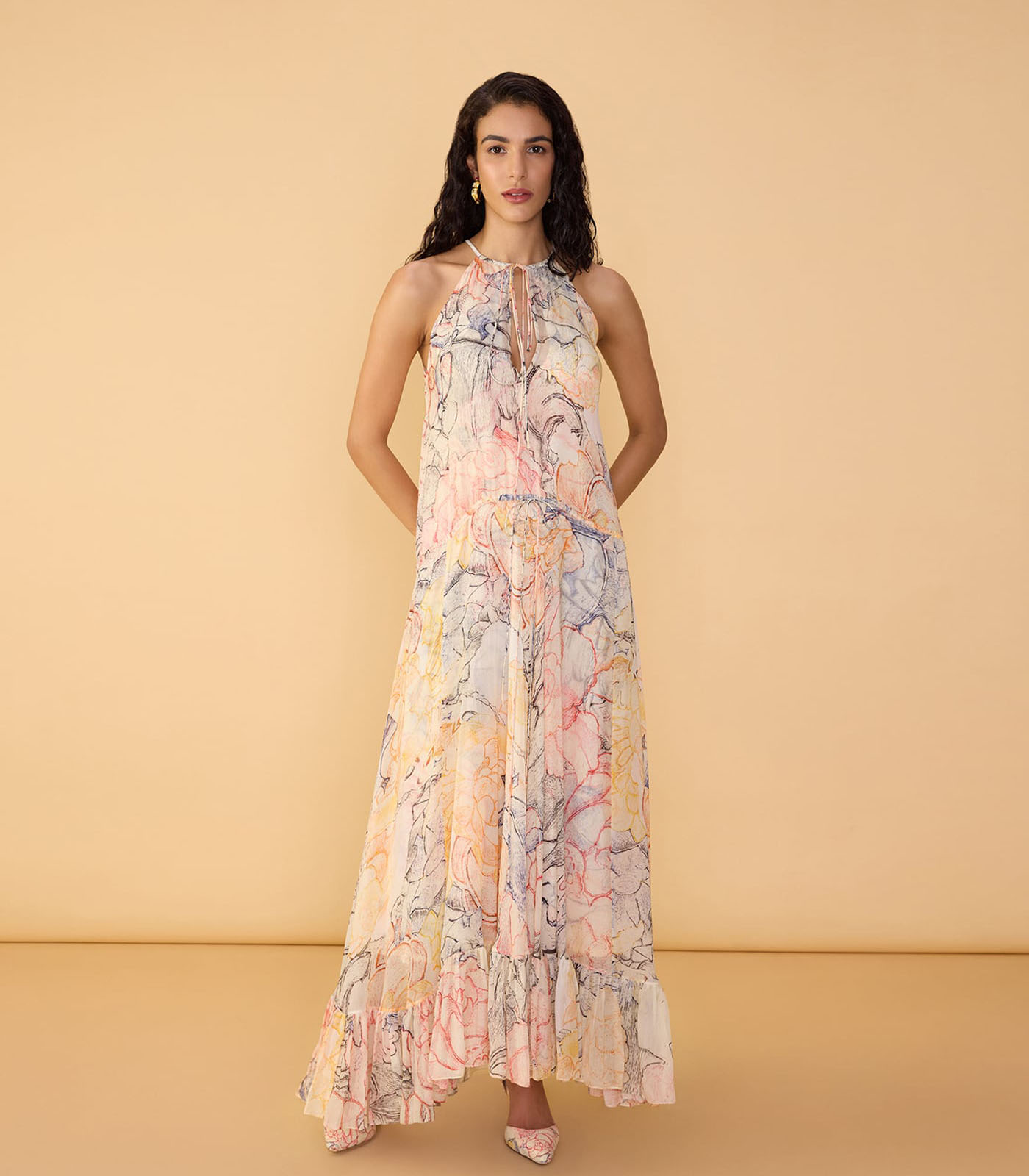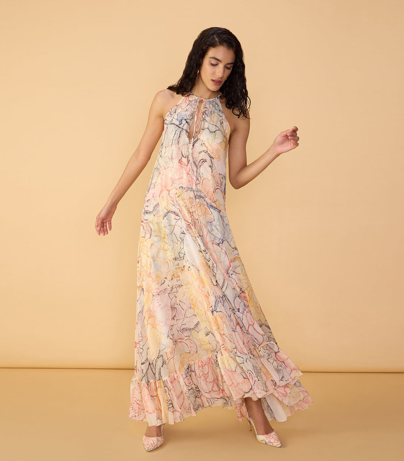 Abstract floral print halter neck maxi dress with tie up neckline and drawstring waist