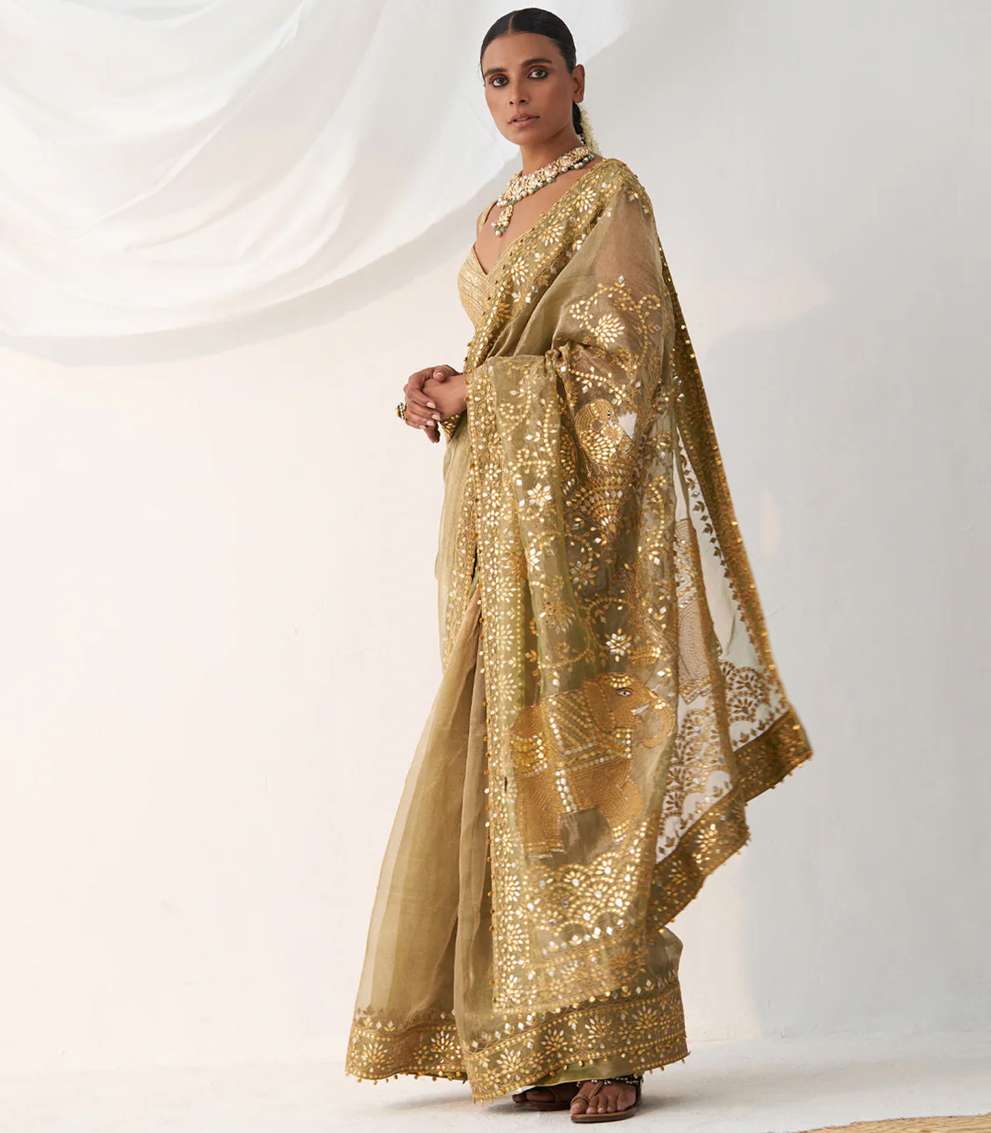 Gold lampi blouse paired with mint green regular saree which has broad gota patti and ghunghroo embroidered border, moreover palla has filled with animal figures intricated embroidery