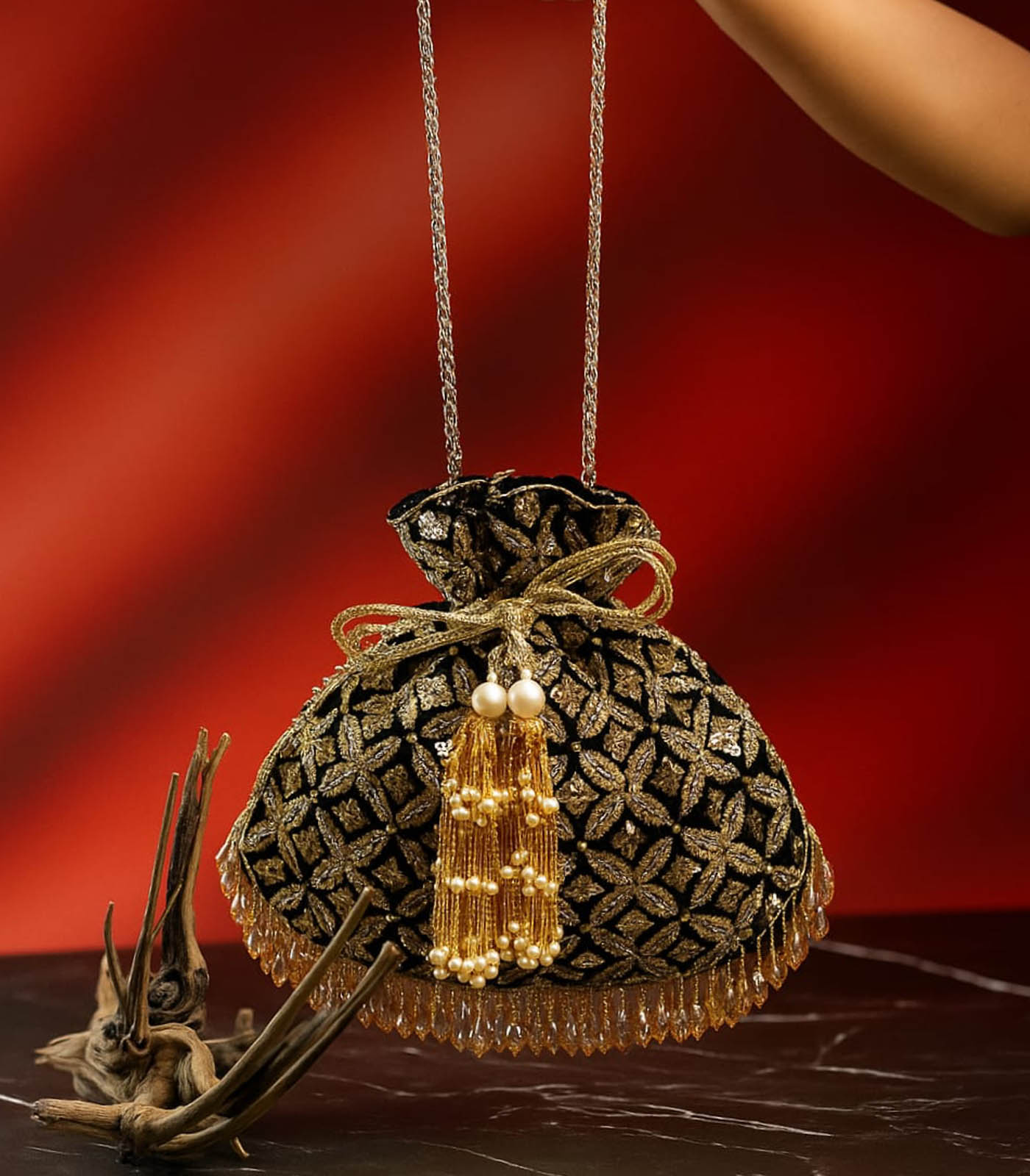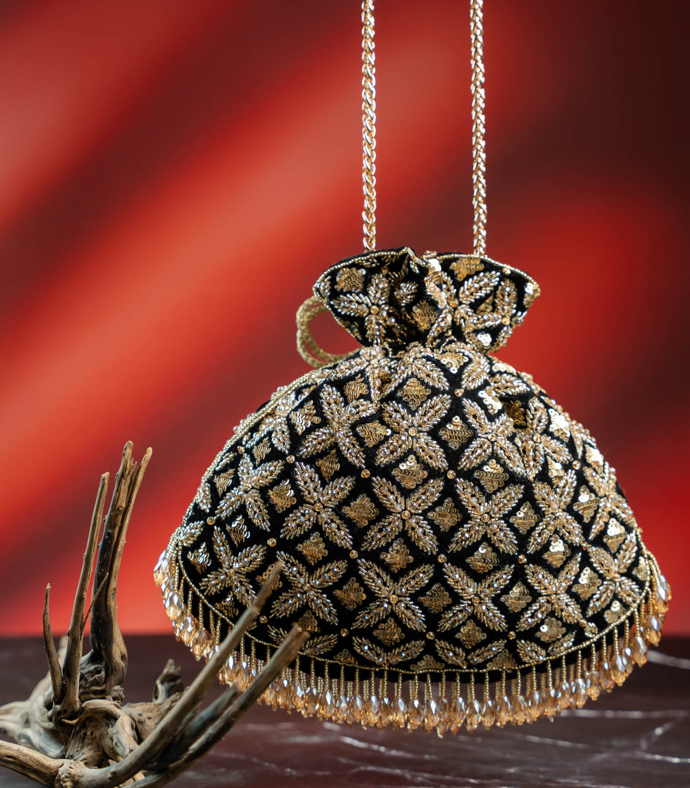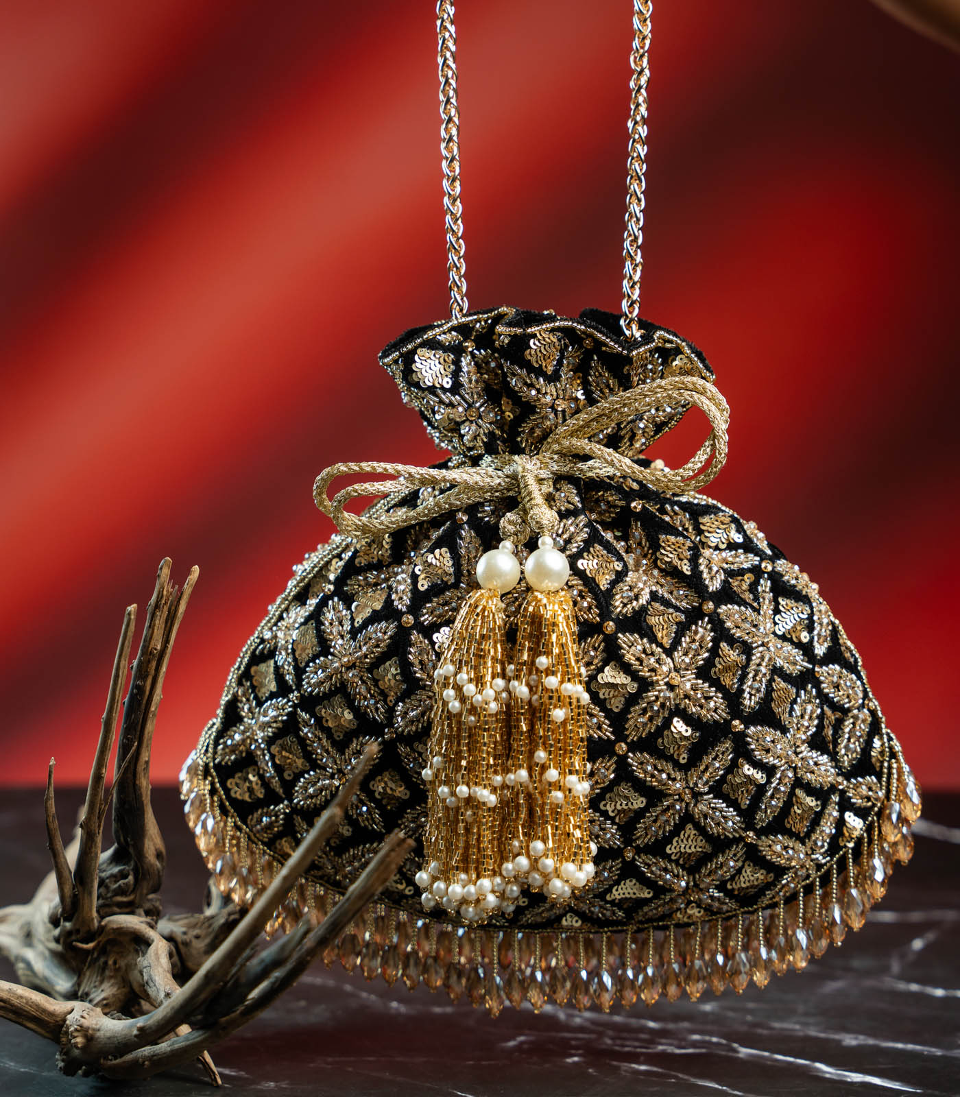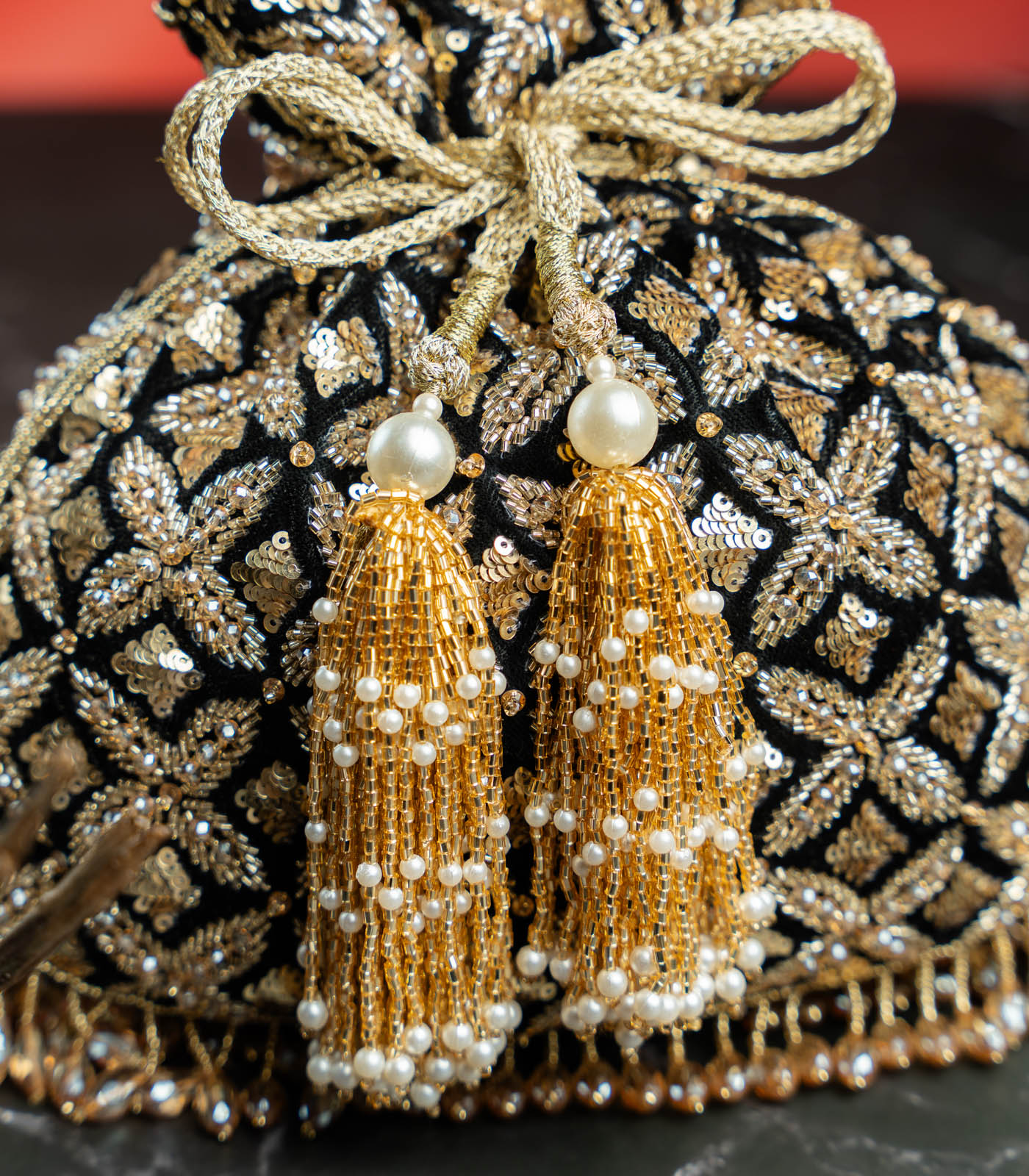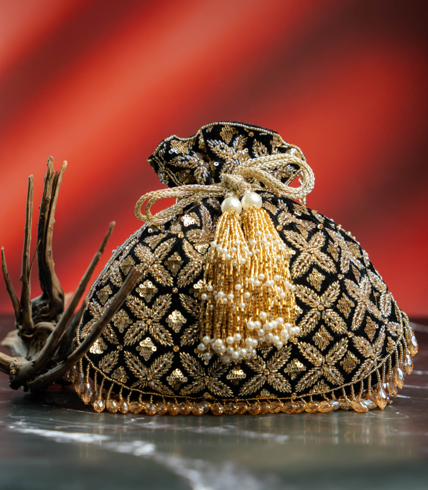A perfect blend of old-world charm and modern glam, this Black & Antique Gold Potli is crafted to make a statement. The rich velvet base is intricately hand-embroidered with traditional motifs in metallic thread, creating a regal lattice of gold that catches the light beautifully. It features opulent handcrafted tassels adorned with pearls and golden beads, a glimmering drawstring tie, and a crystal drop fringe that adds a playful sparkle with every move. Elegant yet striking, it’s ideal for wedding soirées, sangeet nights, or festive evenings when you want your accessory to do the talking.
