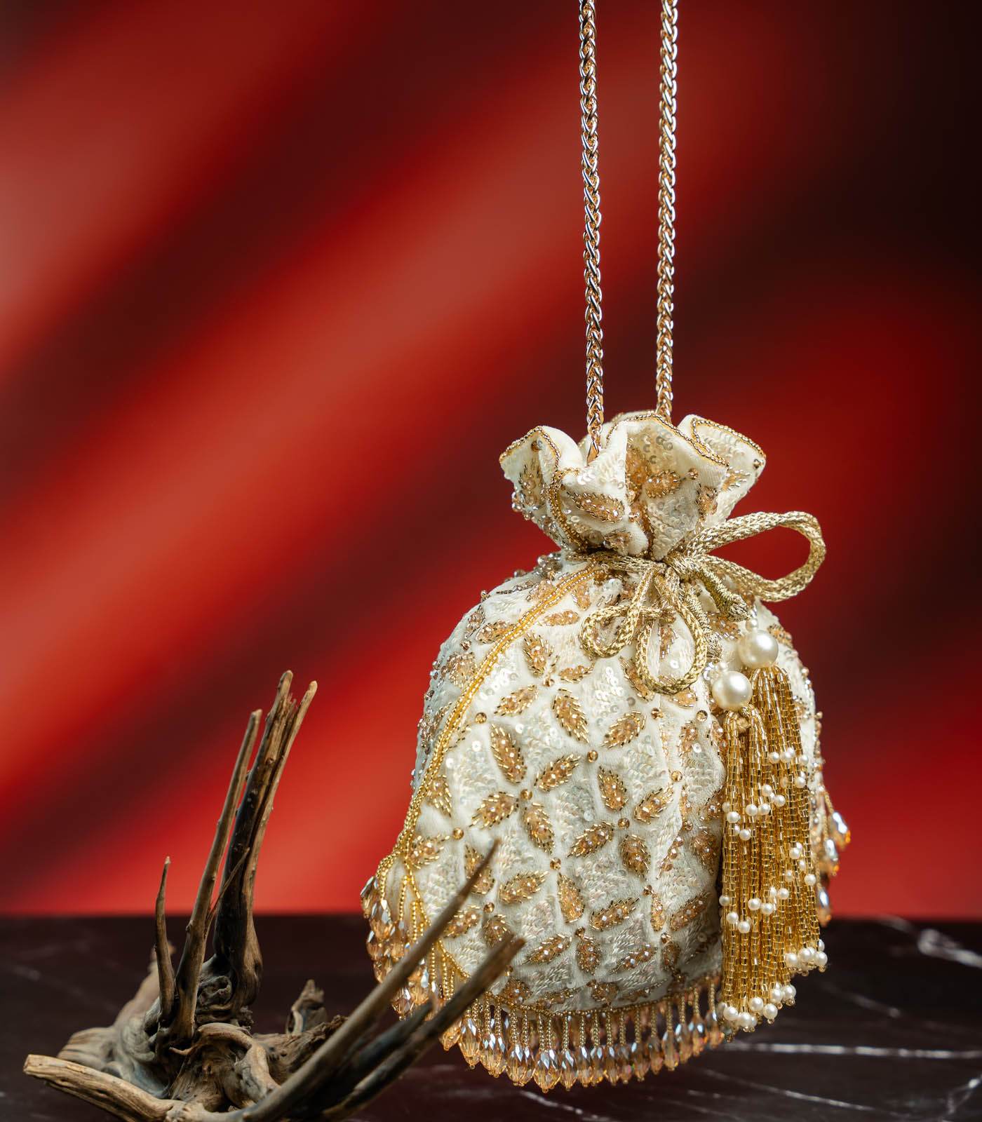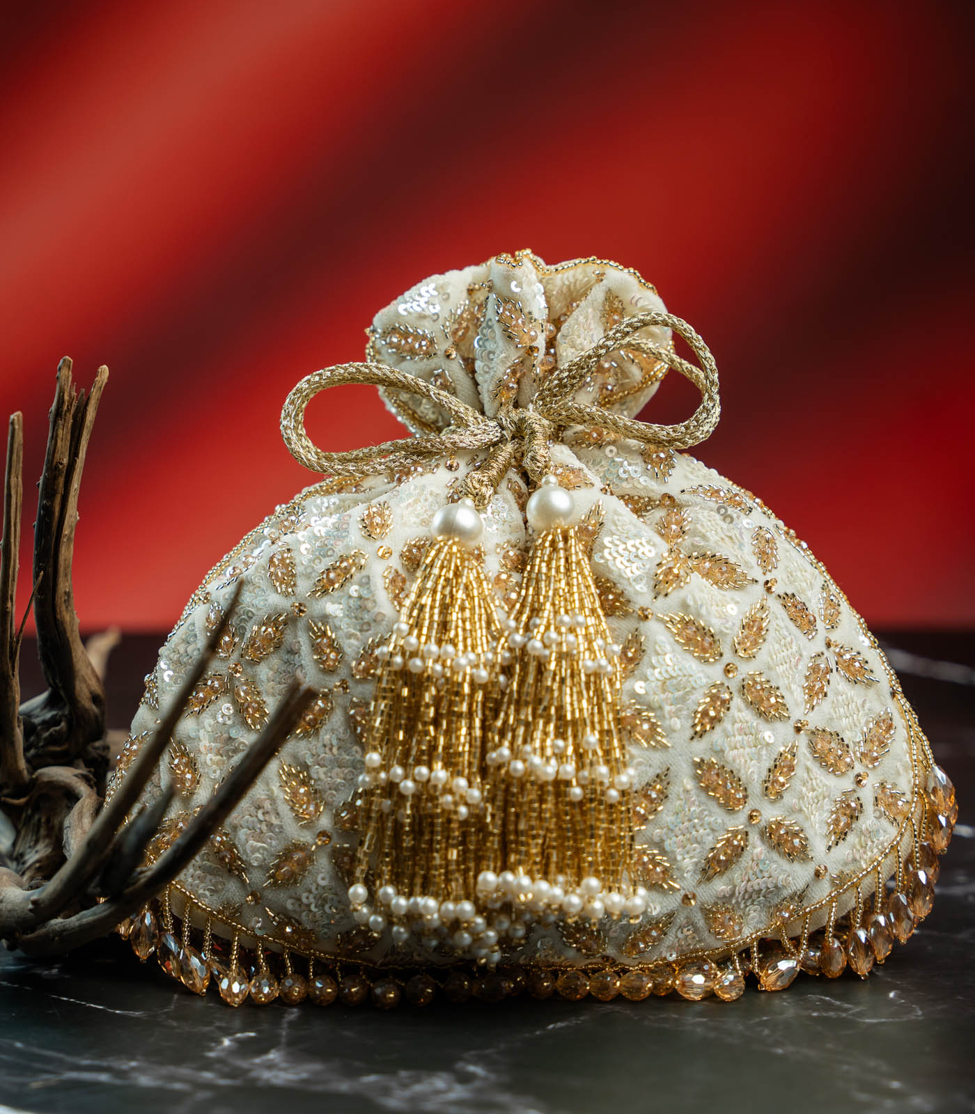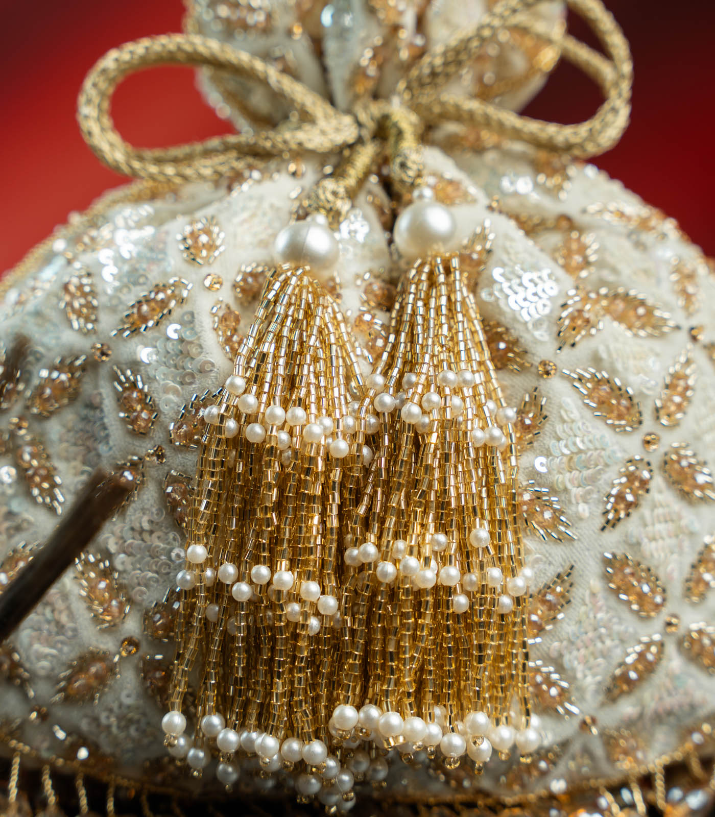 Elegant and ethereal, this Ivory & Gold Potli is the epitome of understated glamour. Crafted on a rich velvet base, it features intricate gold thread embroidery and shimmering sequin work that lends it a soft, luminous glow. The round silhouette is complemented by handcrafted tassels with pearls and golden beads, while a scalloped crystal fringe adds a sparkling finish. With its dreamy palette and luxe detailing, this potli is perfect for bridal looks, reception nights, or any occasion that calls for a hint of sophistication.