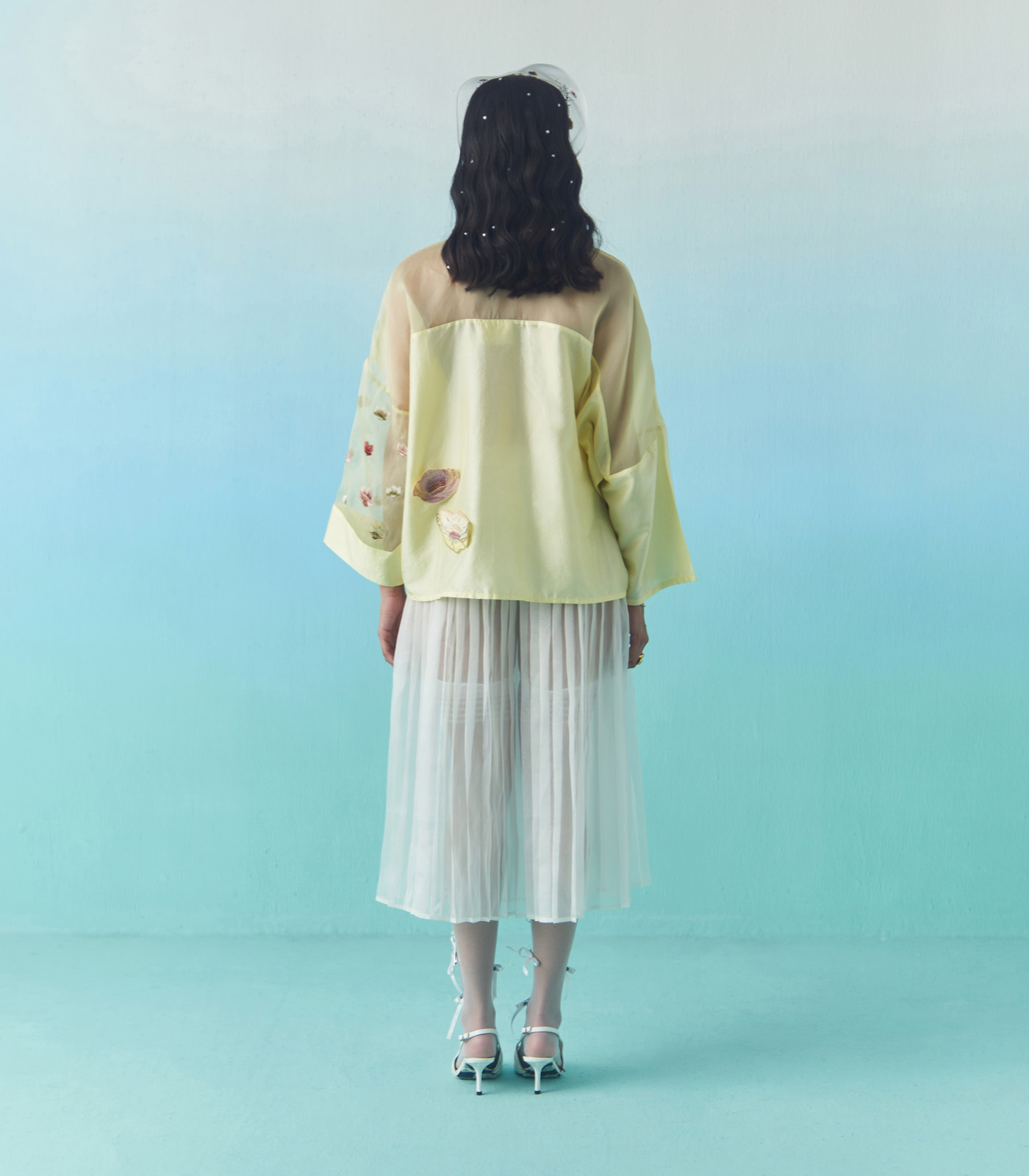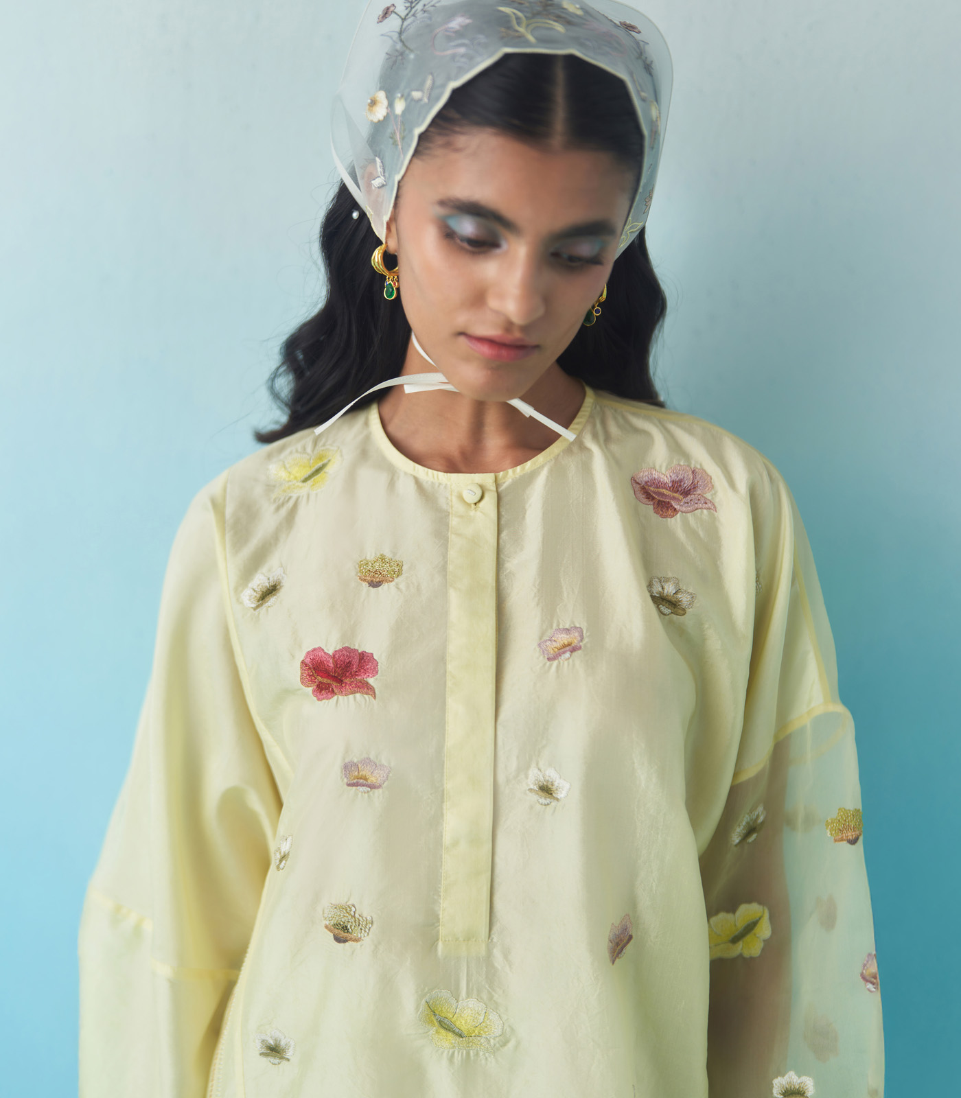 A breezy wardrobe staple, the anti-fit top in lemon has been intricately embellished with poppy motifs with pastel threads.