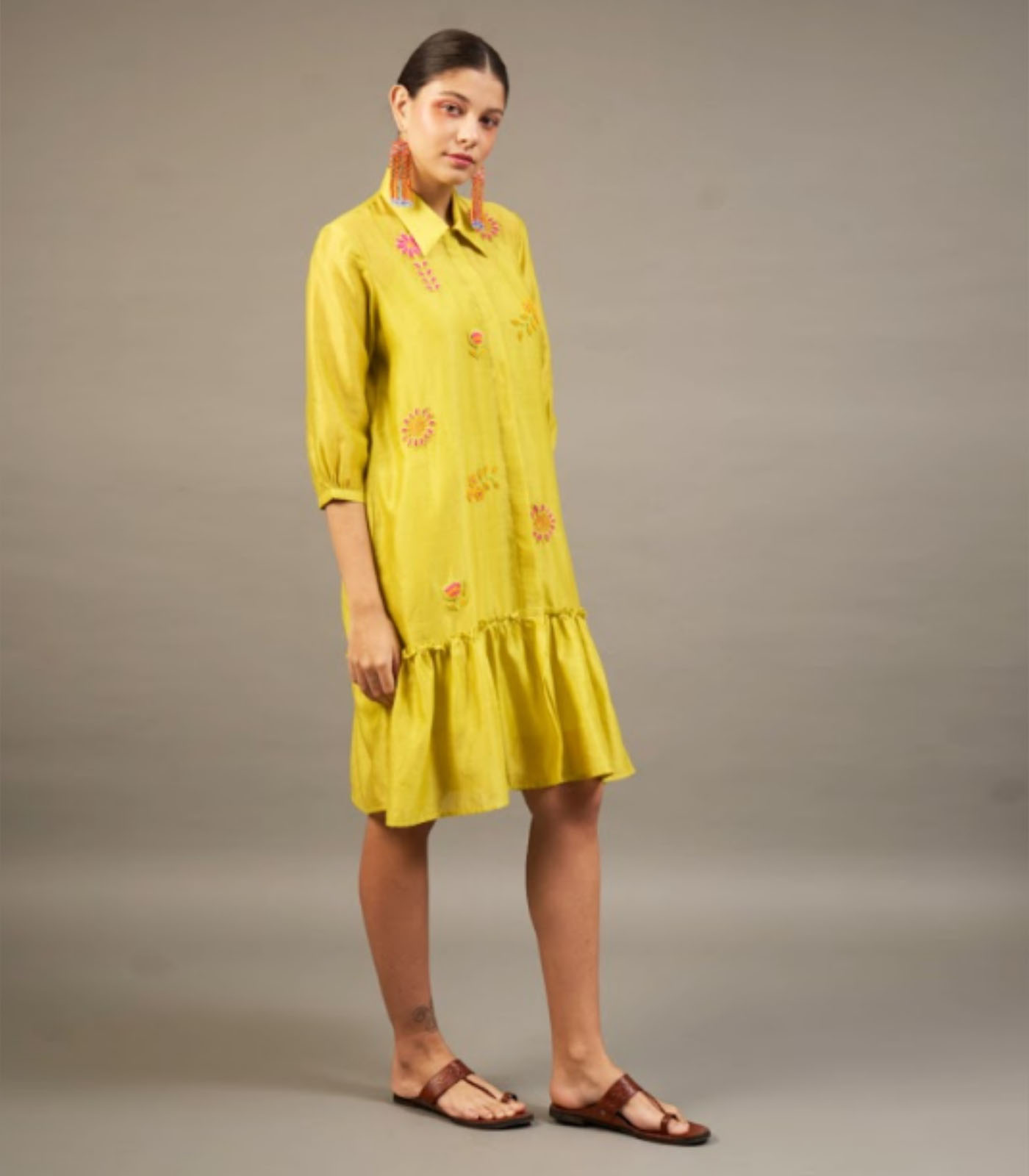 Lime Silk Chanderi Short Dress with Bead Embroidered Florals
