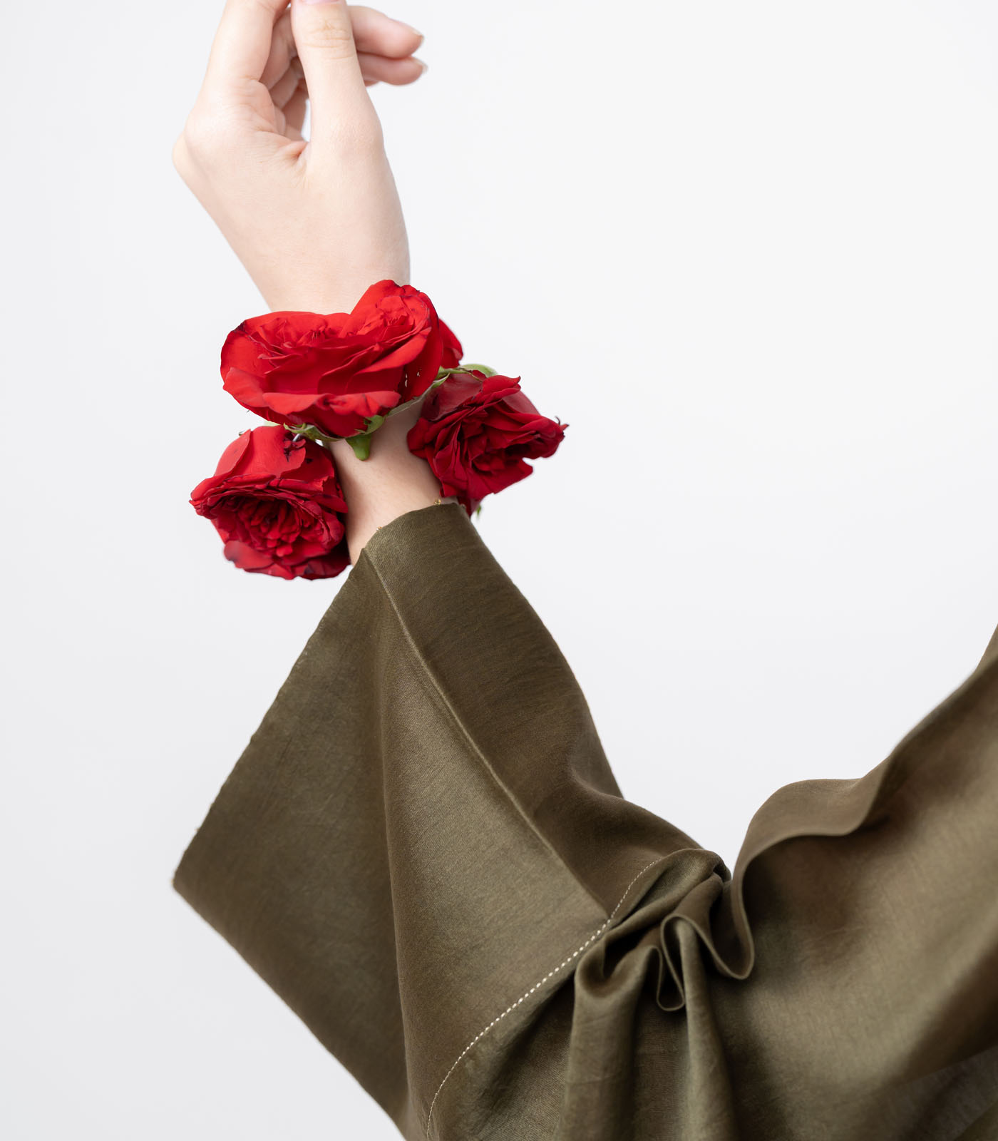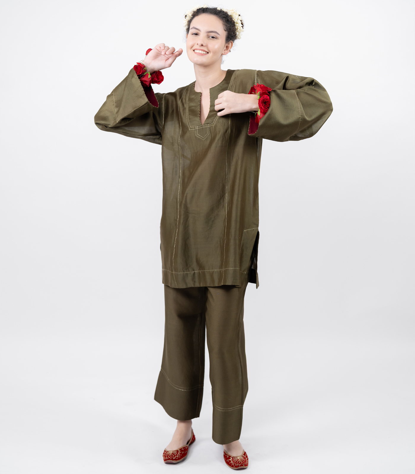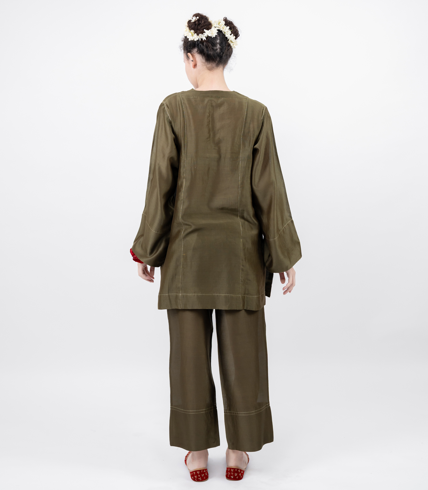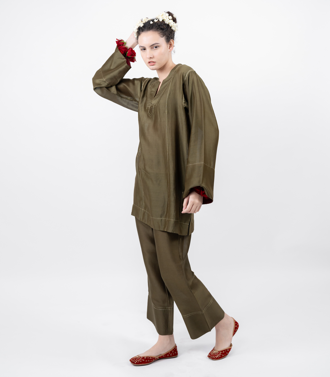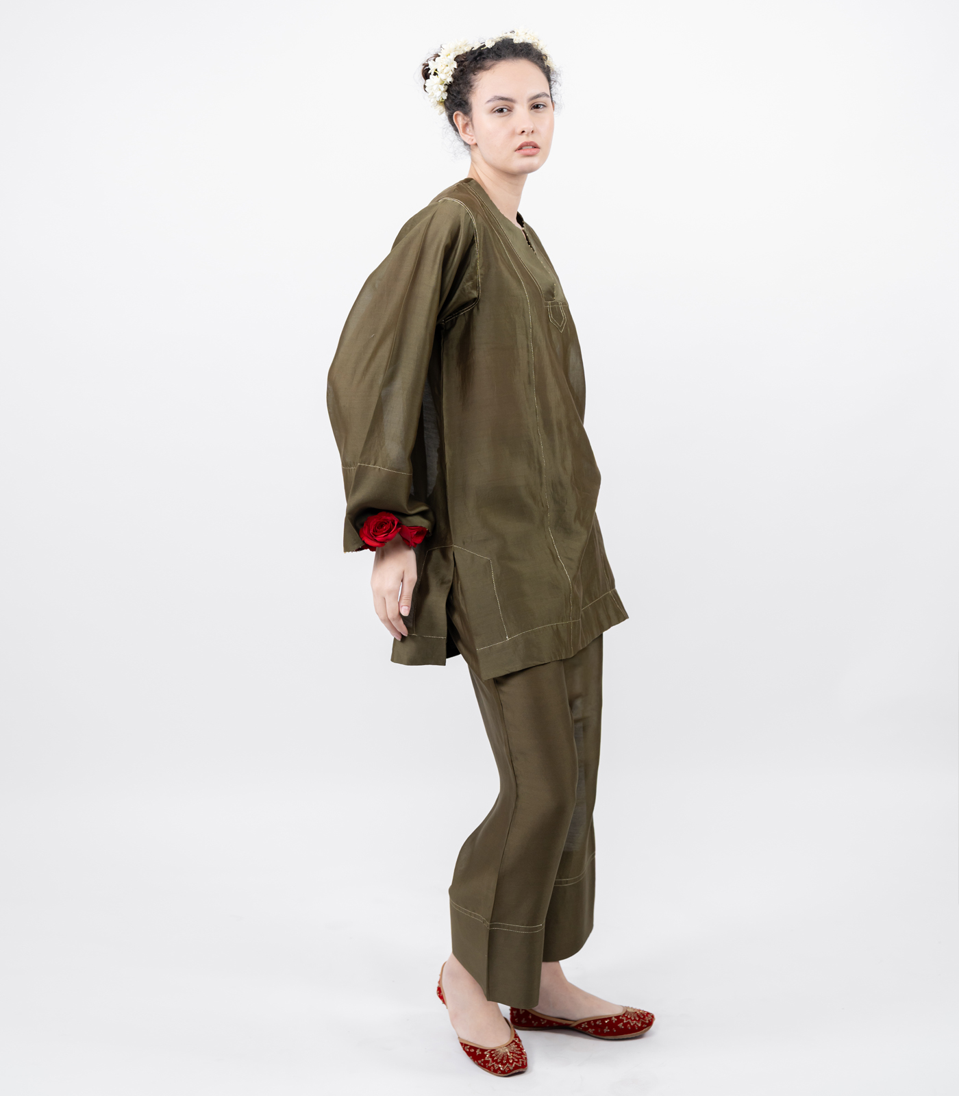 Paired with loose fit ankle lenght pants featuring understated zari detailing the ensemble flows effortlessly – minimal yet festive, bold yet graceful.