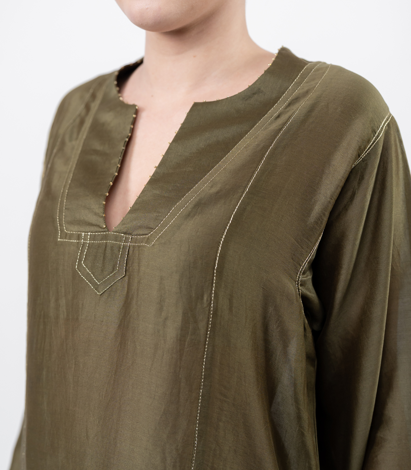 A celebration of light and movement, this co-ord set is crafted in pure chanderi fabric, soft yet lustrous. The bell sleeves are adorned with delicate moti work and subtle zari lines, echoed acthe neck and bodice catching every shimmer of the light.