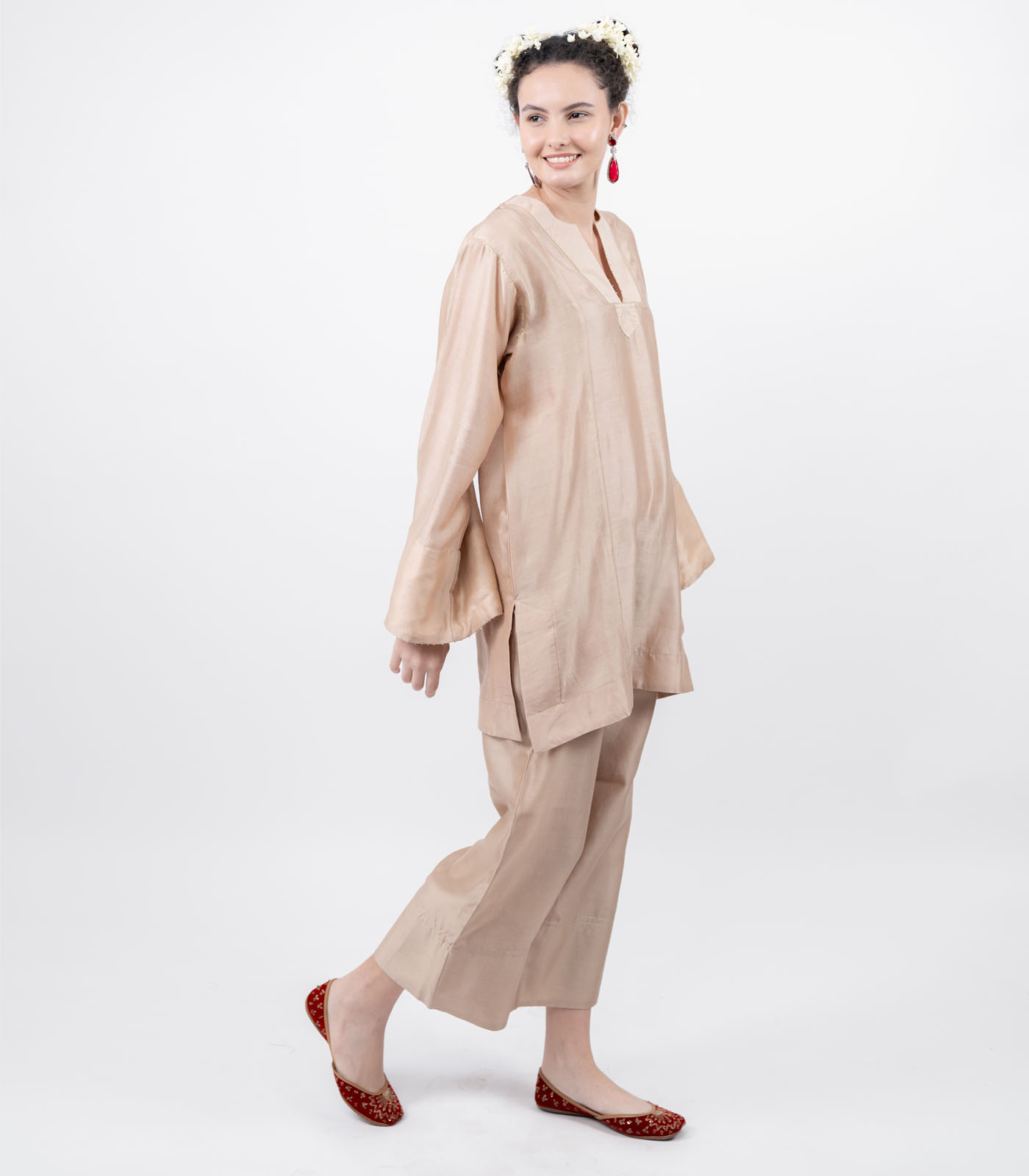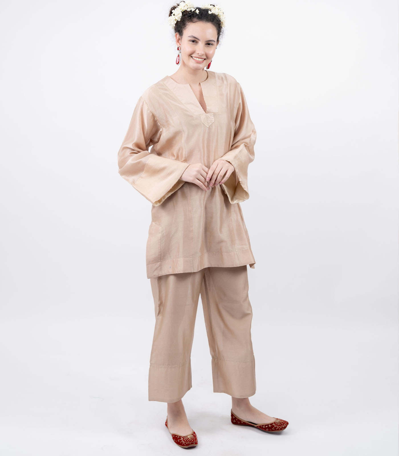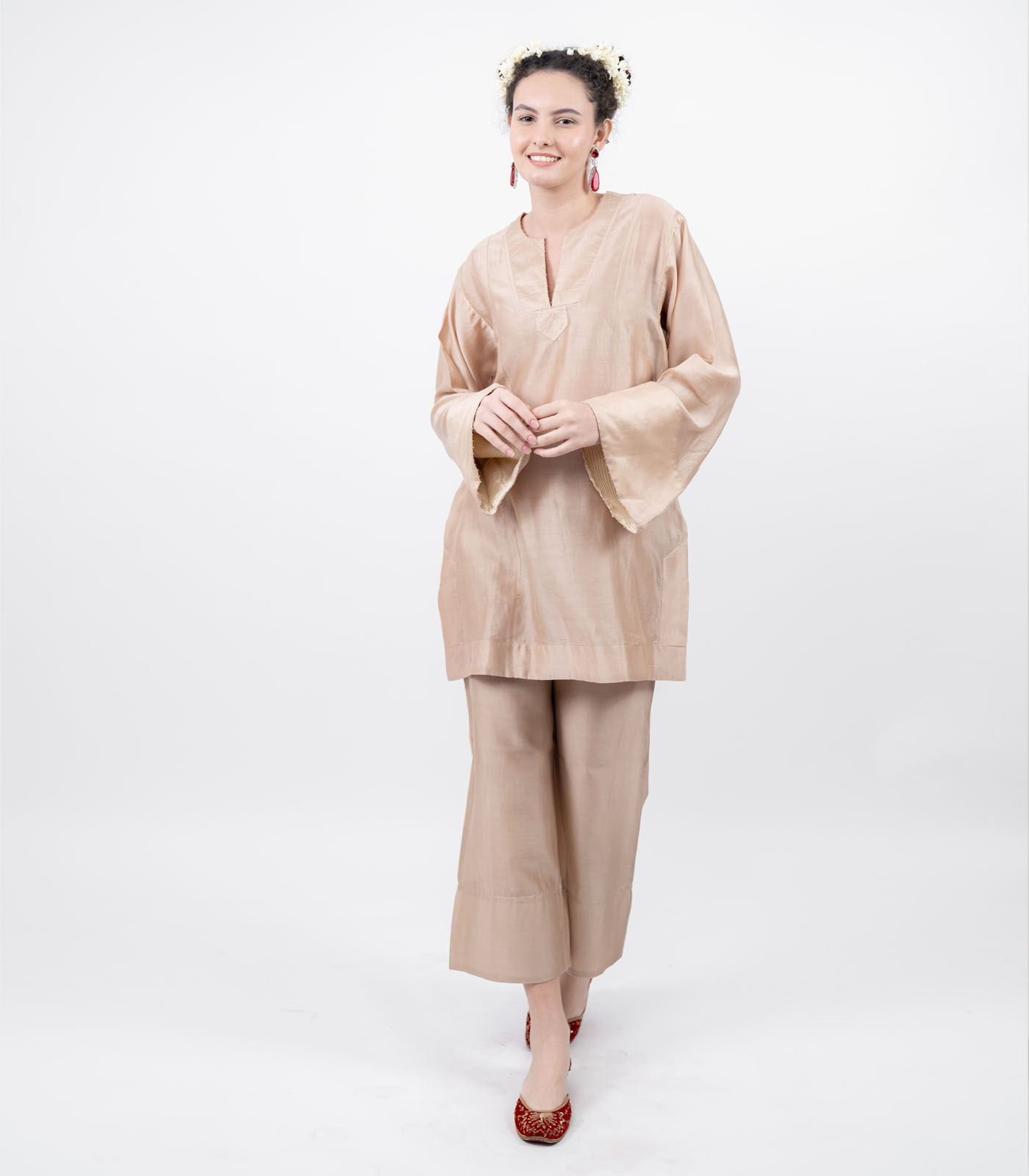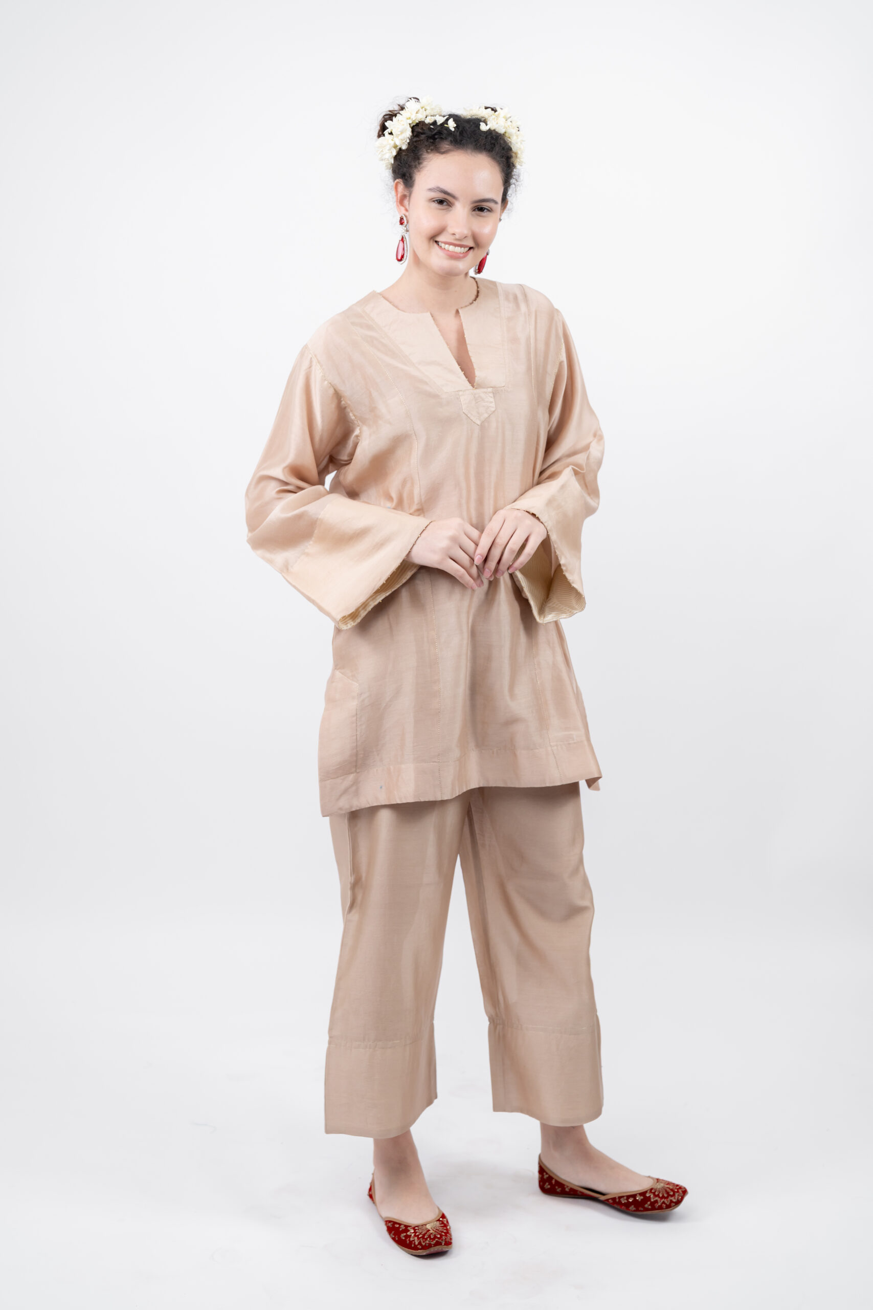 A celebration of light and movement, this co-ord set is crafted in pure chanderi fabric, soft yet lustrous. The bell sleeves are adorned with delicate moti work and subtle zari lines, echoed acthe neck and bodice catching every shimmer of the light.