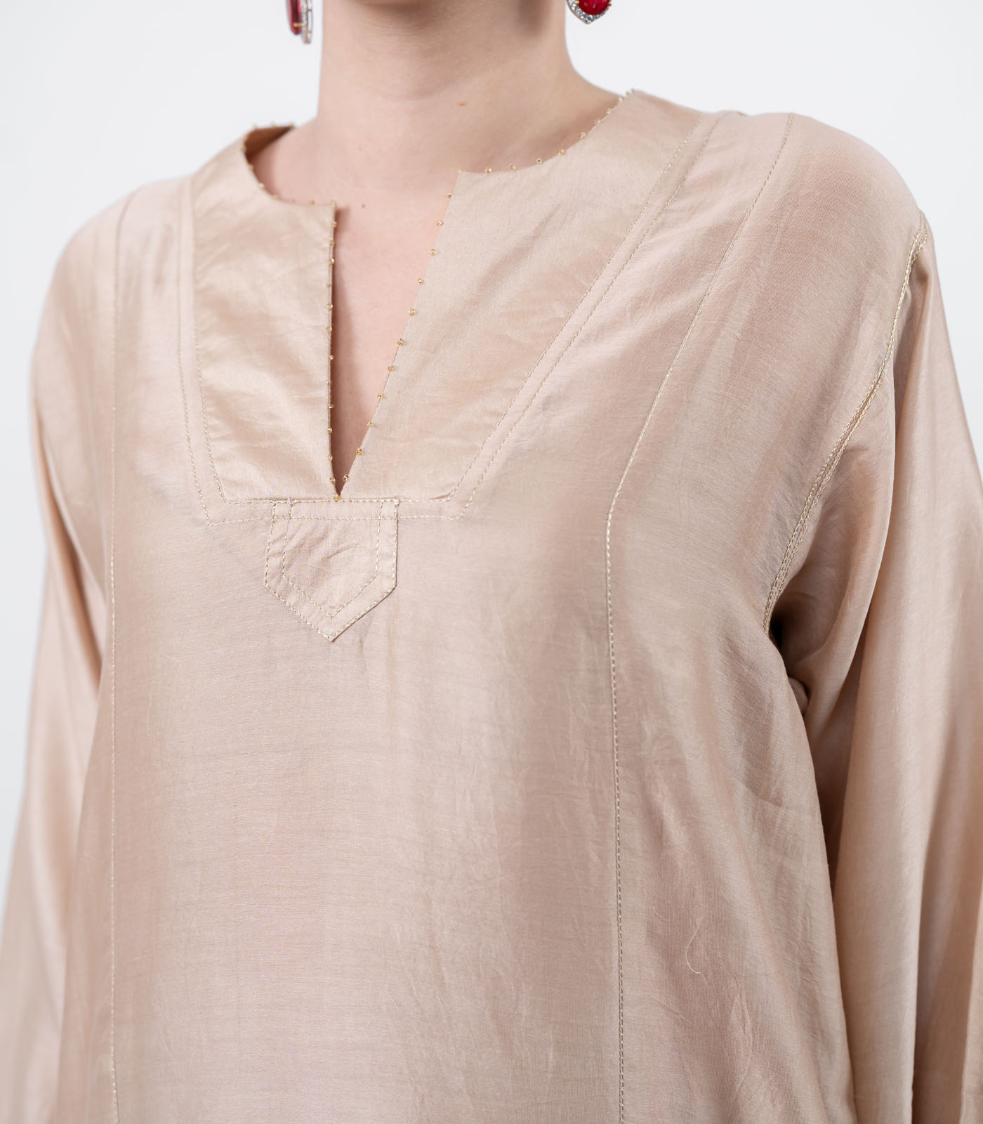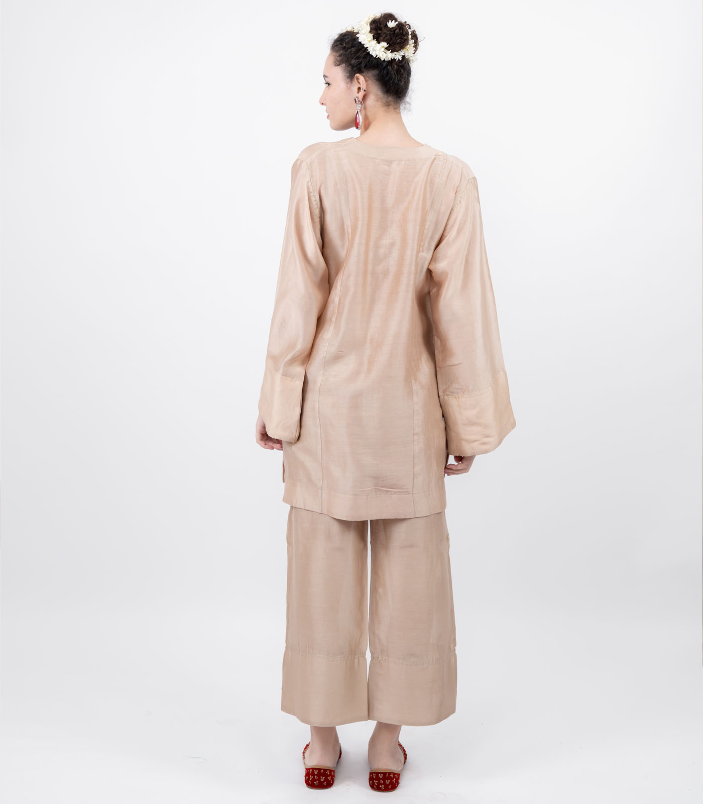 Paired with loose fit ankle lenght pants featuring understated zari detailing the ensemble flows effortlessly – minimal yet festive, bold yet graceful.