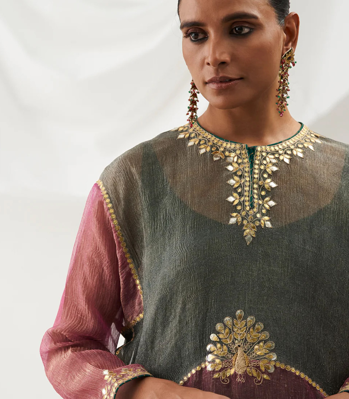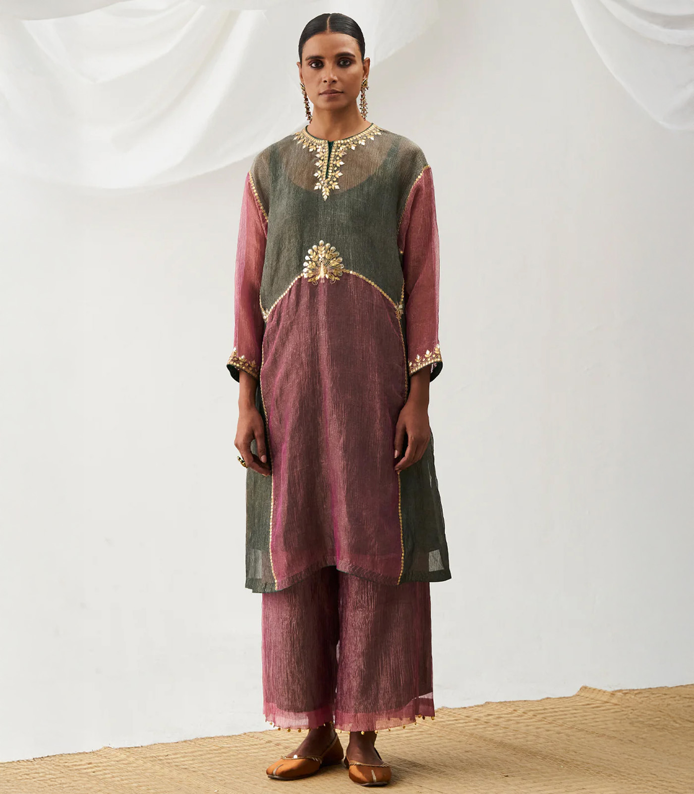 Free style kurta with intricated gota patti embroidery on neckline, bodice and sleeve’s hem, paired with culotte pants