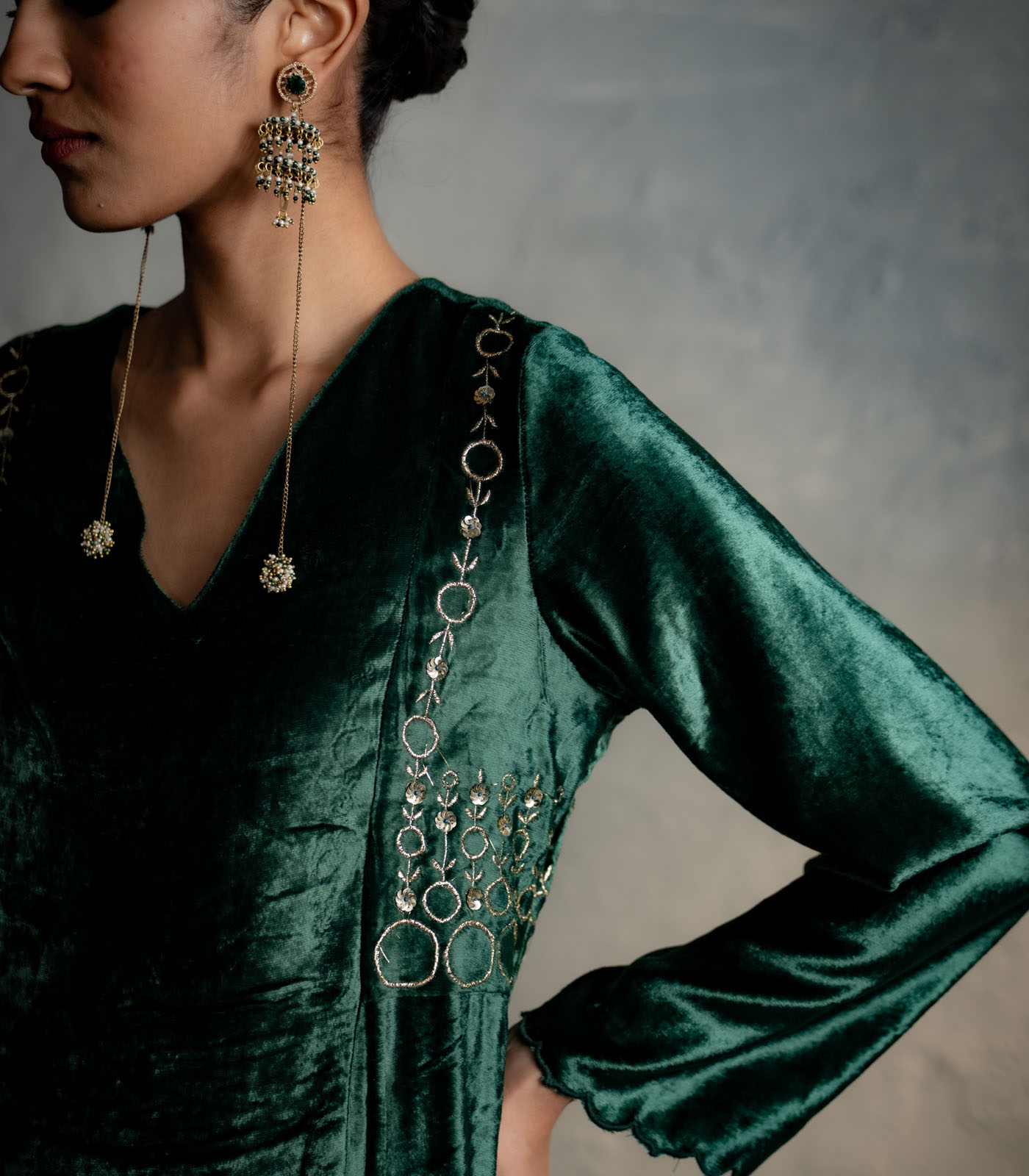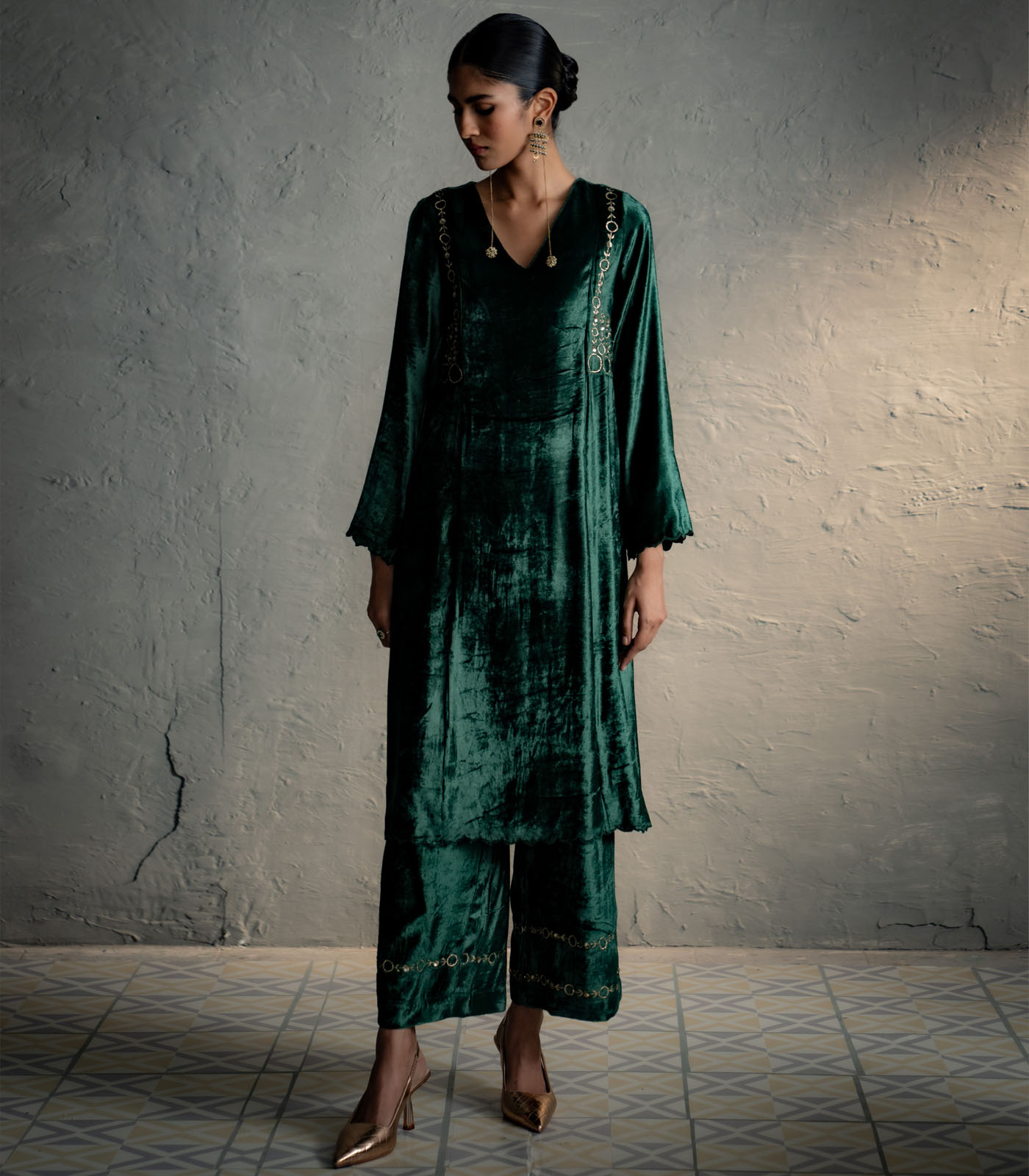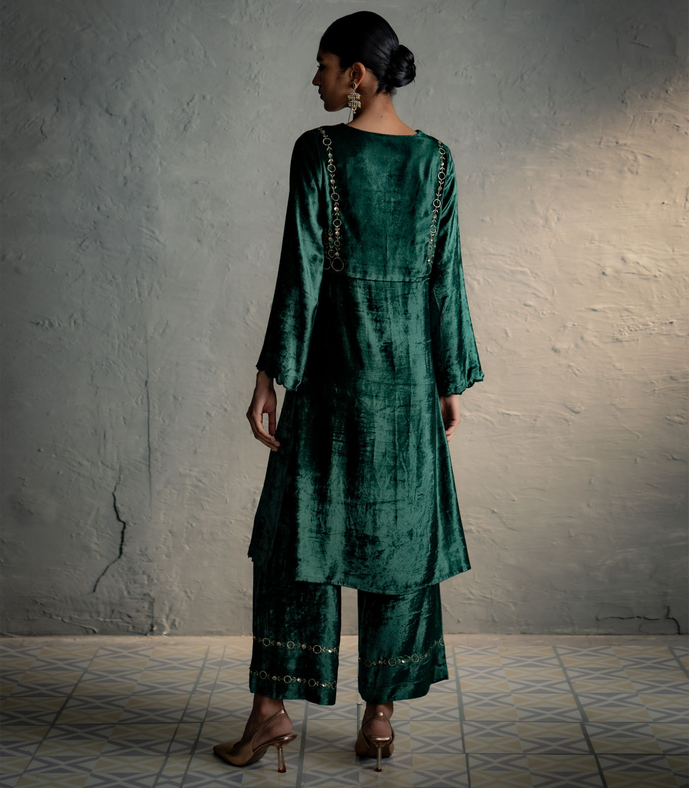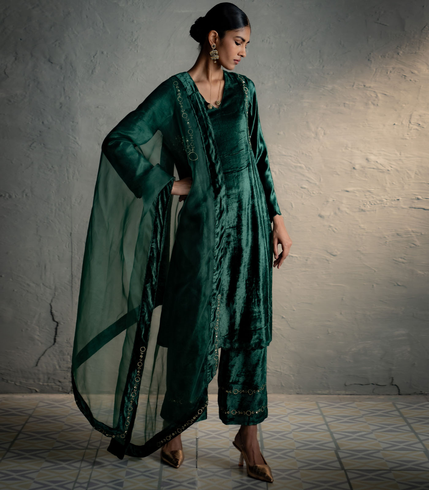 An elegant velvet suit adorned with circular embroidery along the front and back yoke, tracing the armhole in a jacket-style silhouette. It is paired with loose, embroidered palazzo pants that add graceful movement. Available in two rich colour options, one complemented by an embroidered velvet stole, and the other by an organza dupatta finished with a velvet border for a delicate flowy drape.