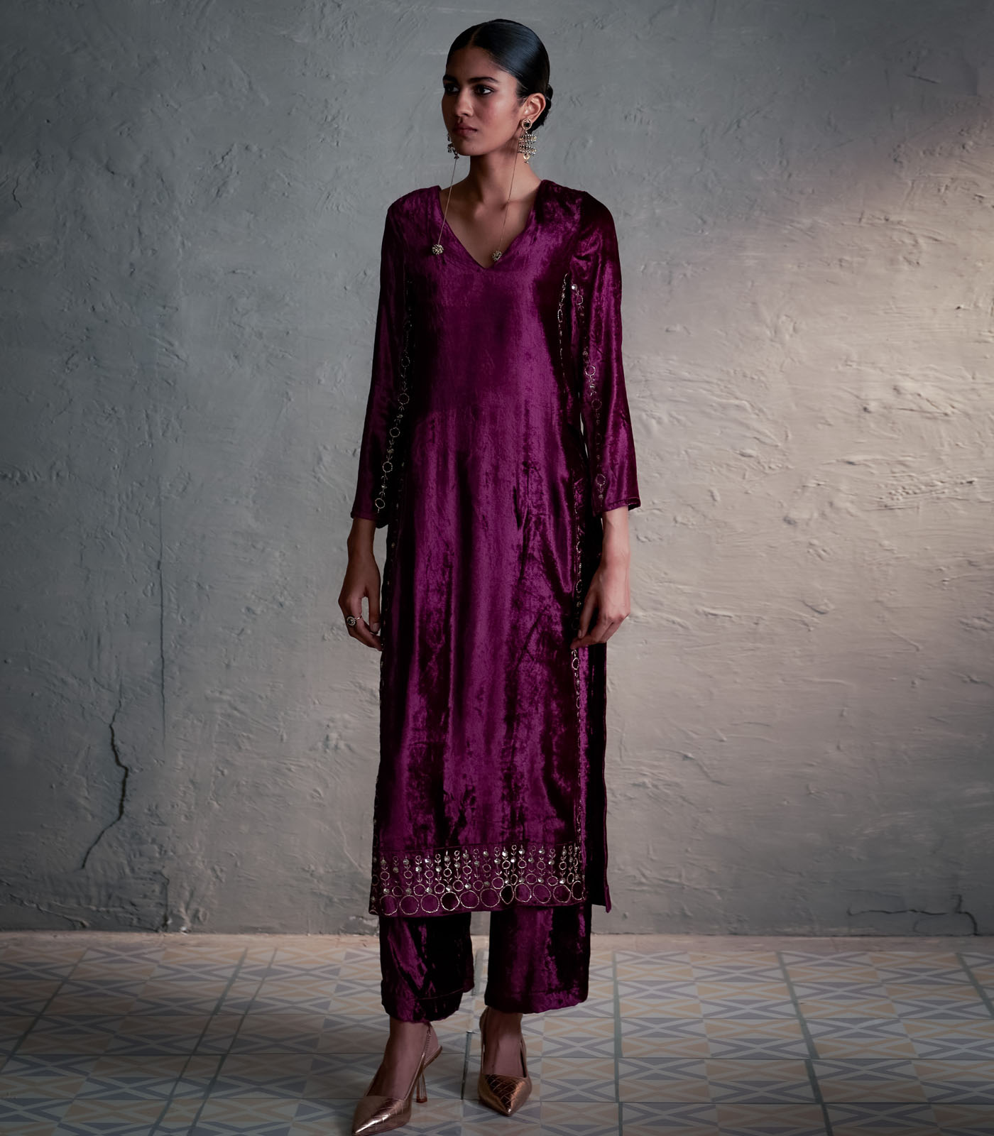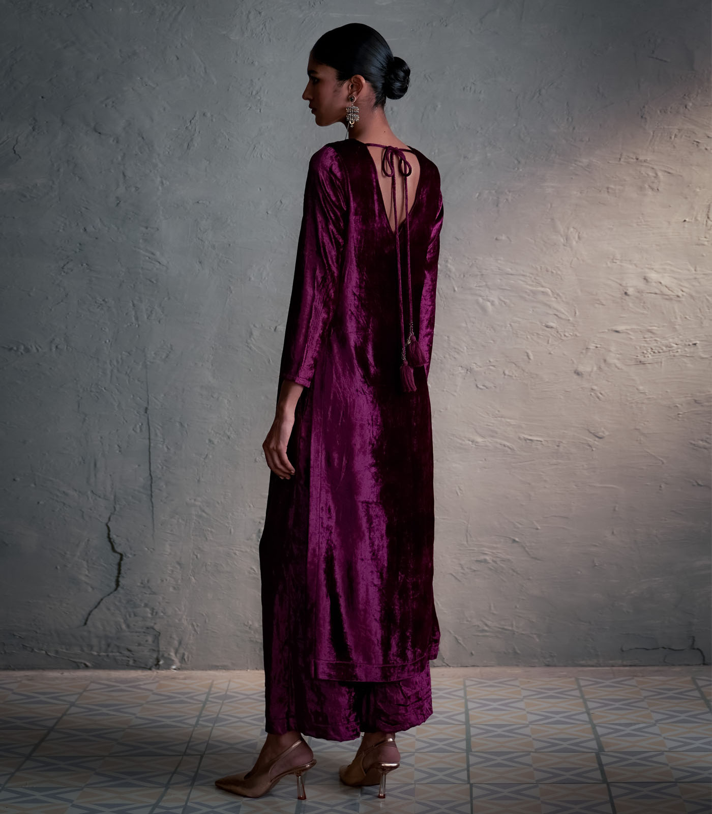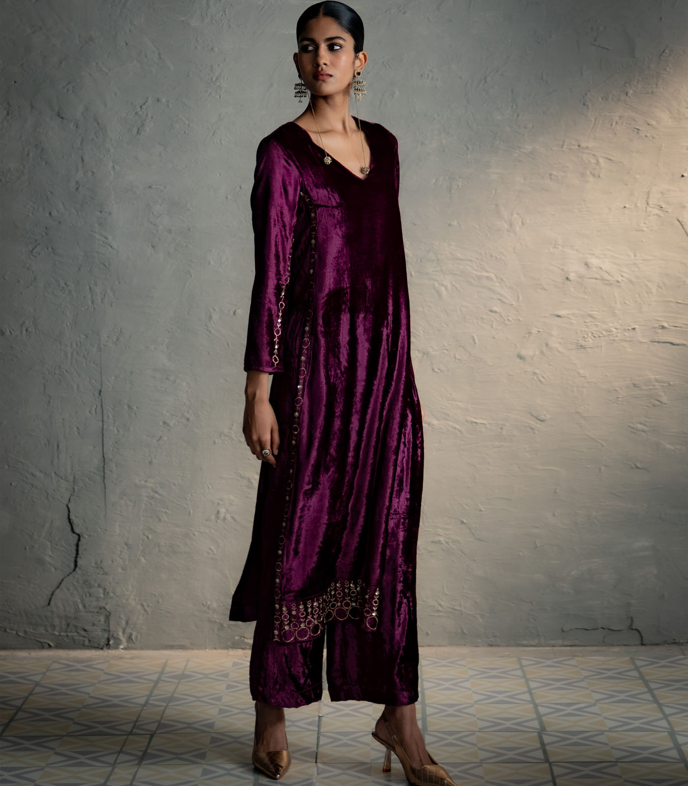 A velvet kurta set in a straight-fit silhouette, featuring an intriguing side-slit detail, a sleek side band on the bodice, and a back tie-up for a structured yet graceful look. Intricate embroidery adorns the long slits, sleeves, and the front hem, paired with loose palazzos for effortless ease. Available in two rich colour options, one styled with an embroidered velvet stole, and the other with an organza dupatta edged in velvet for a soft, flowing drape.