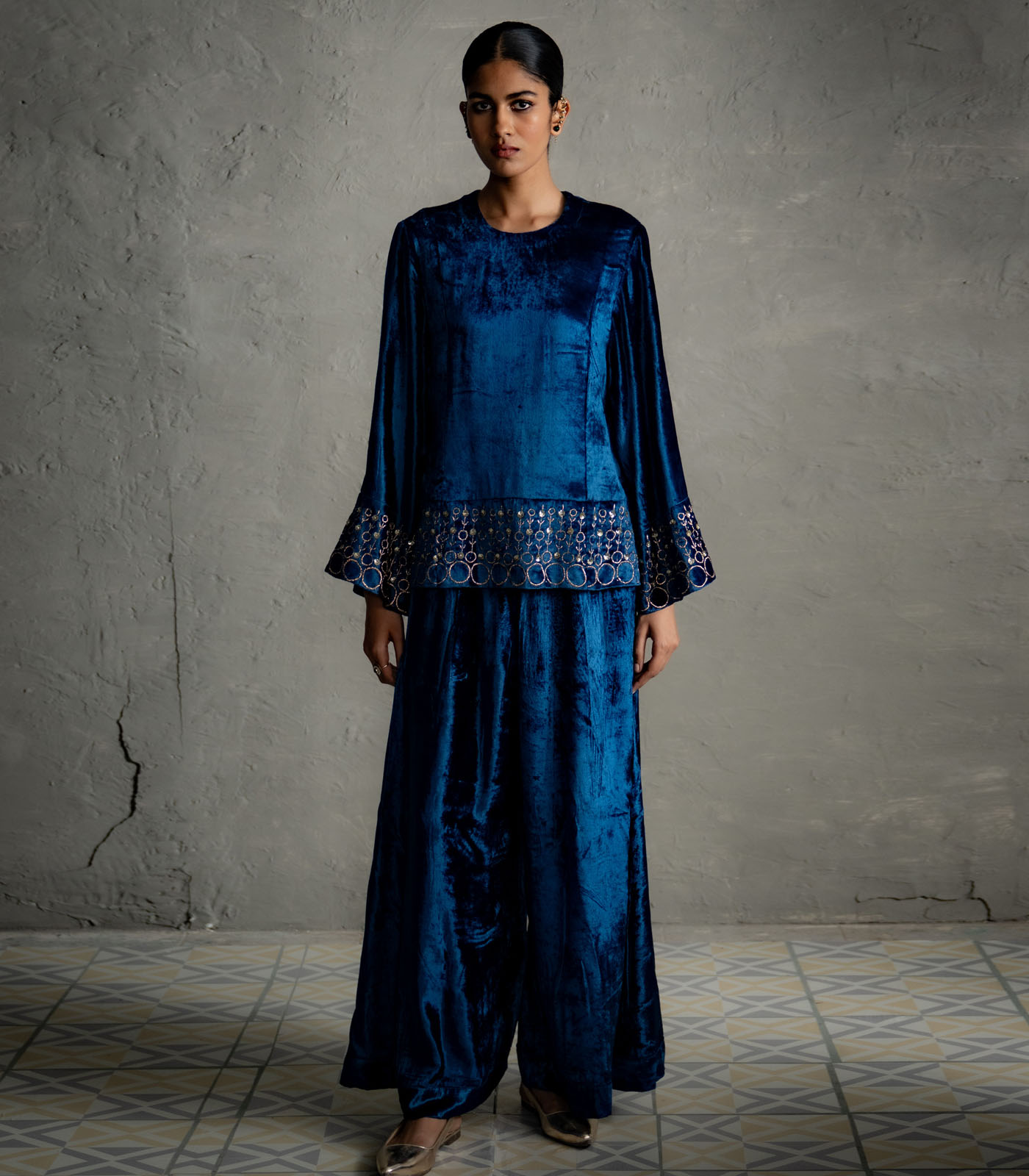 A contemporary two-piece cord set featuring a heavily embroidered top with detailed hem and sleeve cuffs, flared long sleeves, and paired with flared, ankle-length palazzos. Designed for modern formal occasions, this ensemble balances intricate craftsmanship with a sleek, contemporary silhouette.