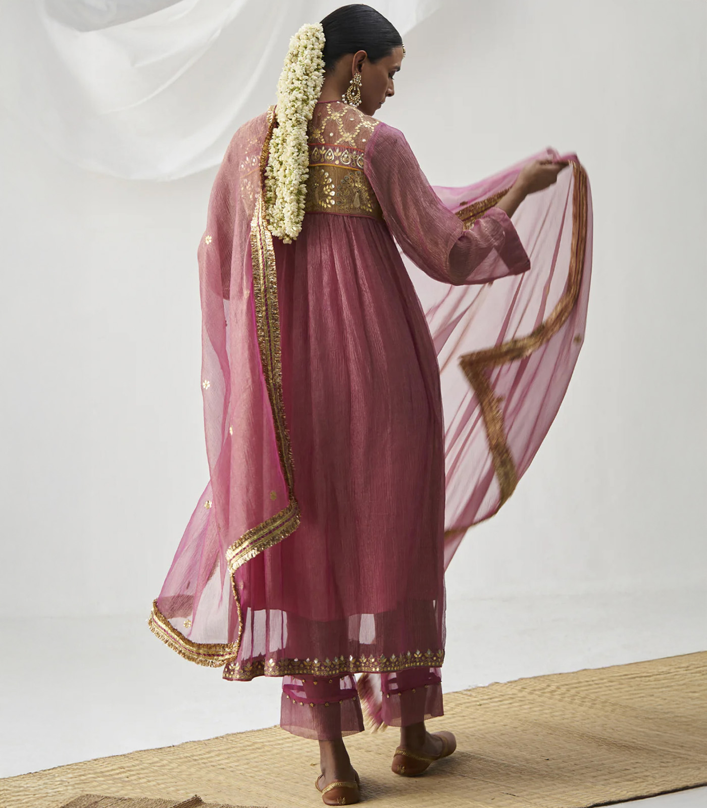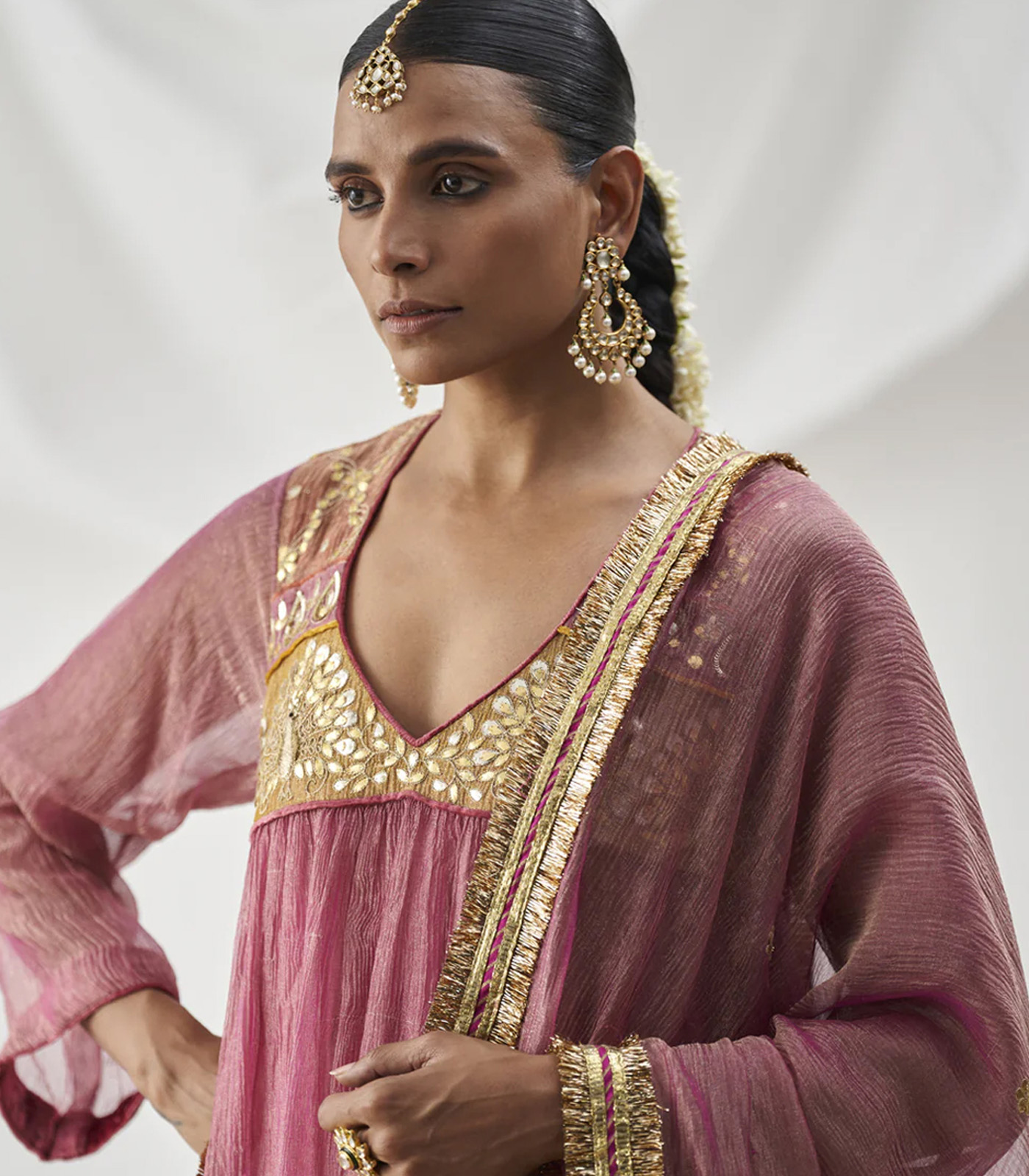 Pink gathered kurta with color blocked gotta patti work on bodice paired with culottes pants and kiran edged dupatta