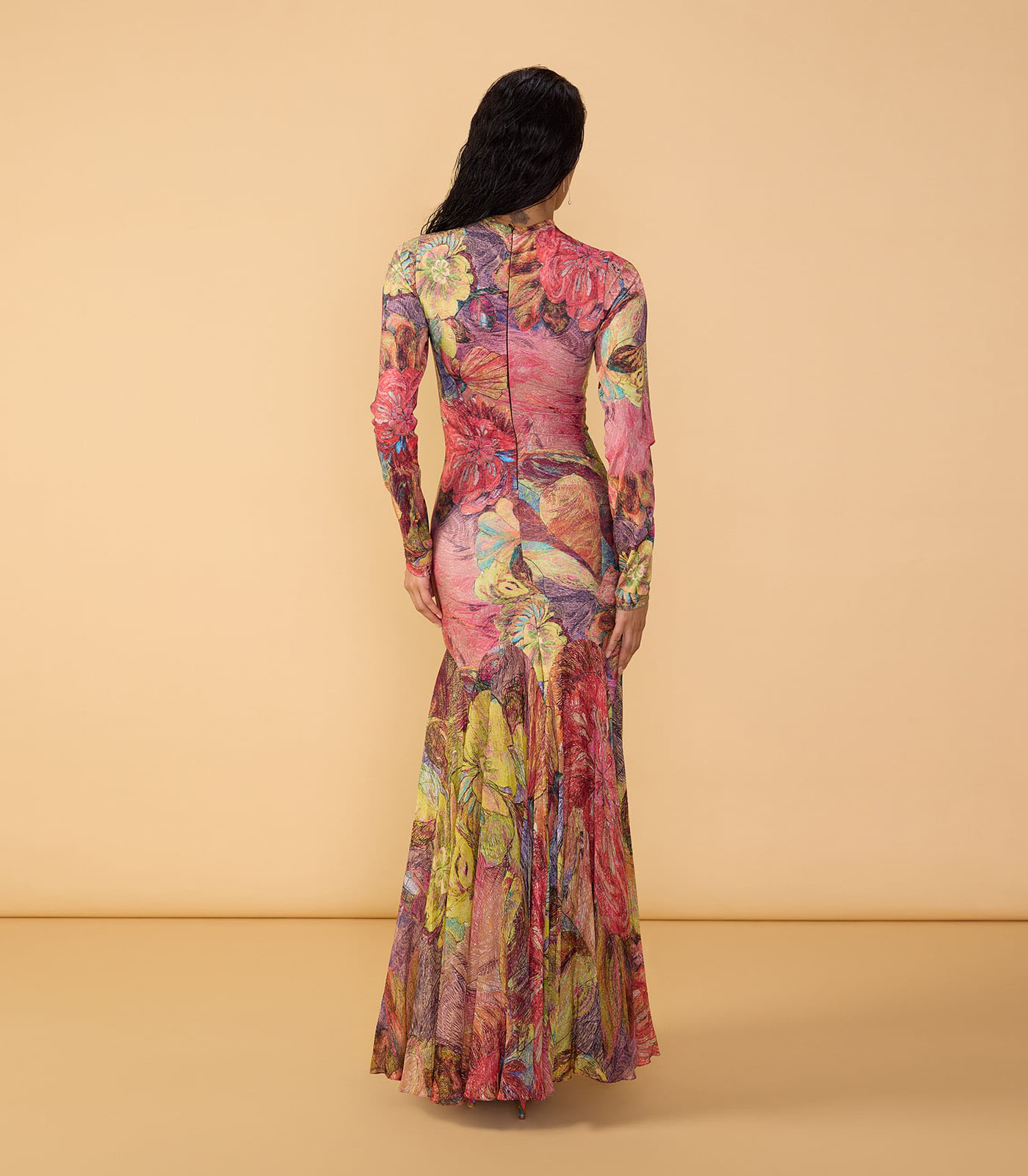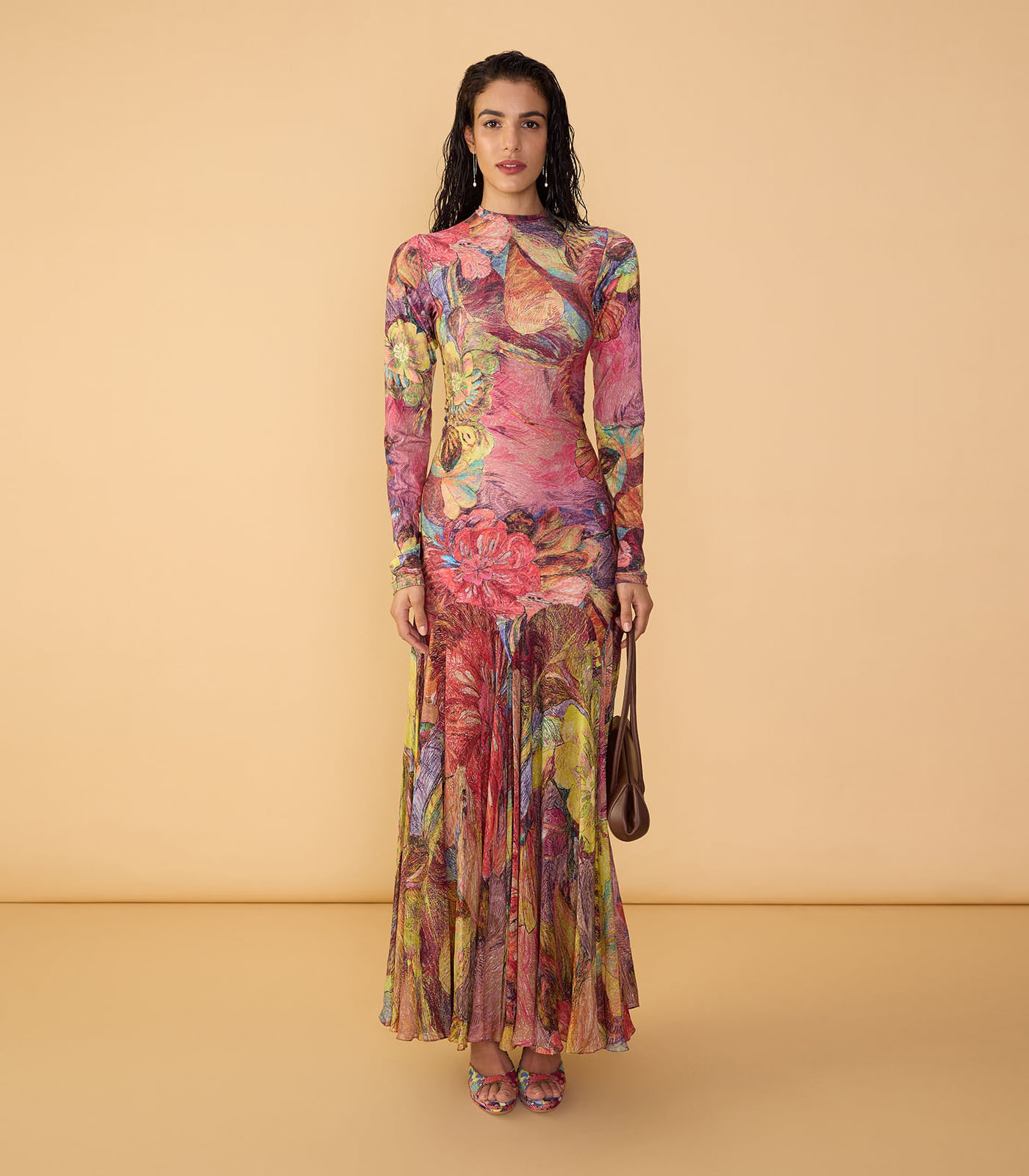 Abstract floral print closed neck maxi dress with long sleeves and fitted bodice