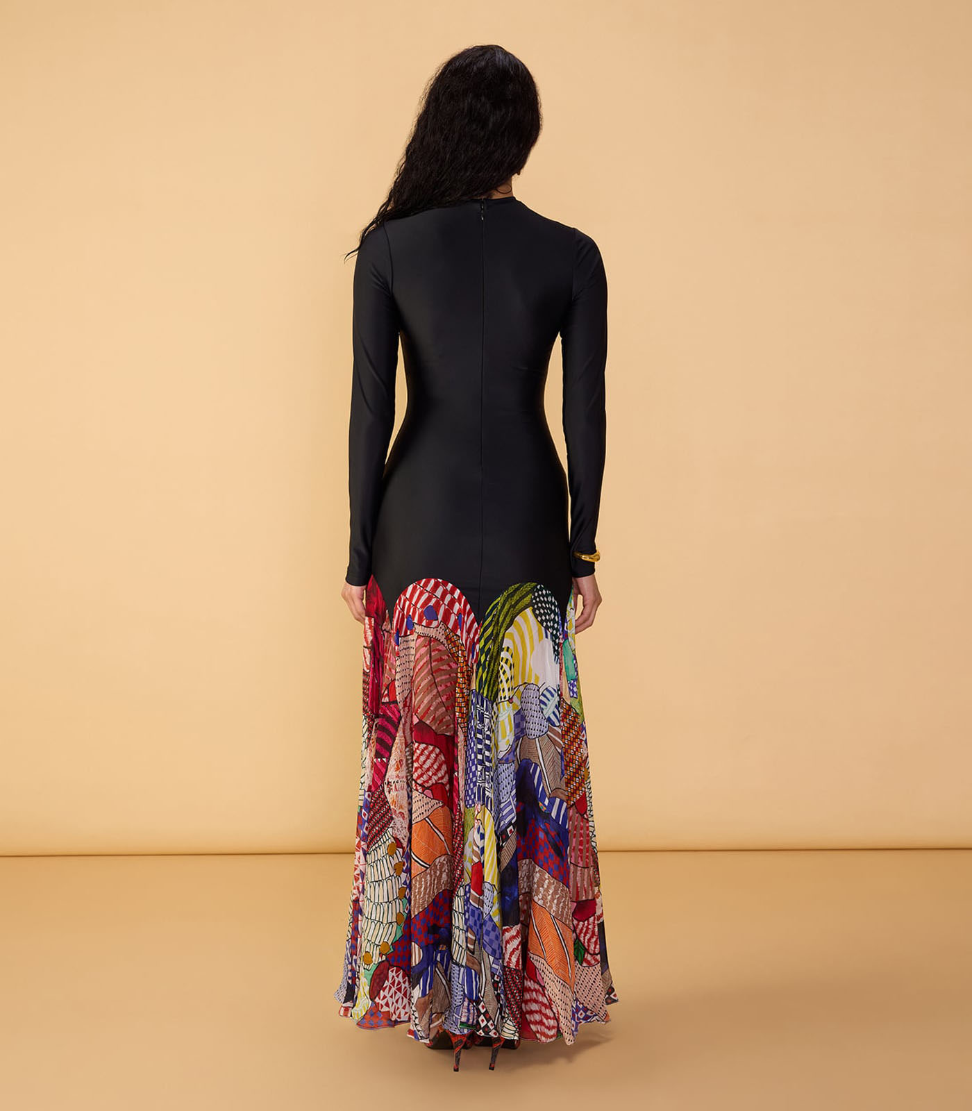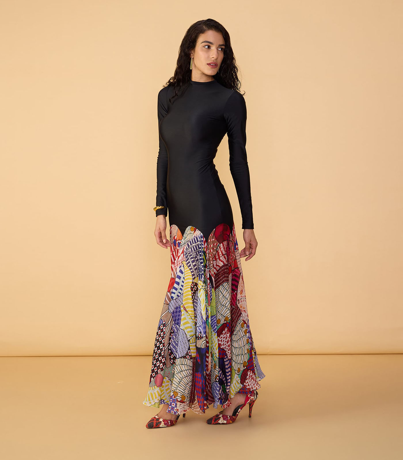 Abstract floral print closed neck maxi dress with long sleeves and fitted bodice