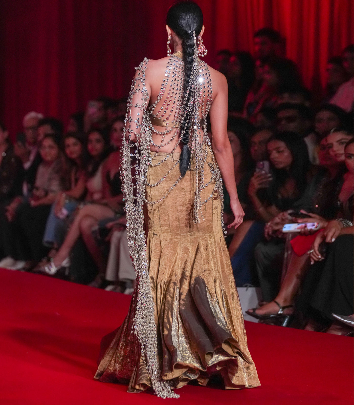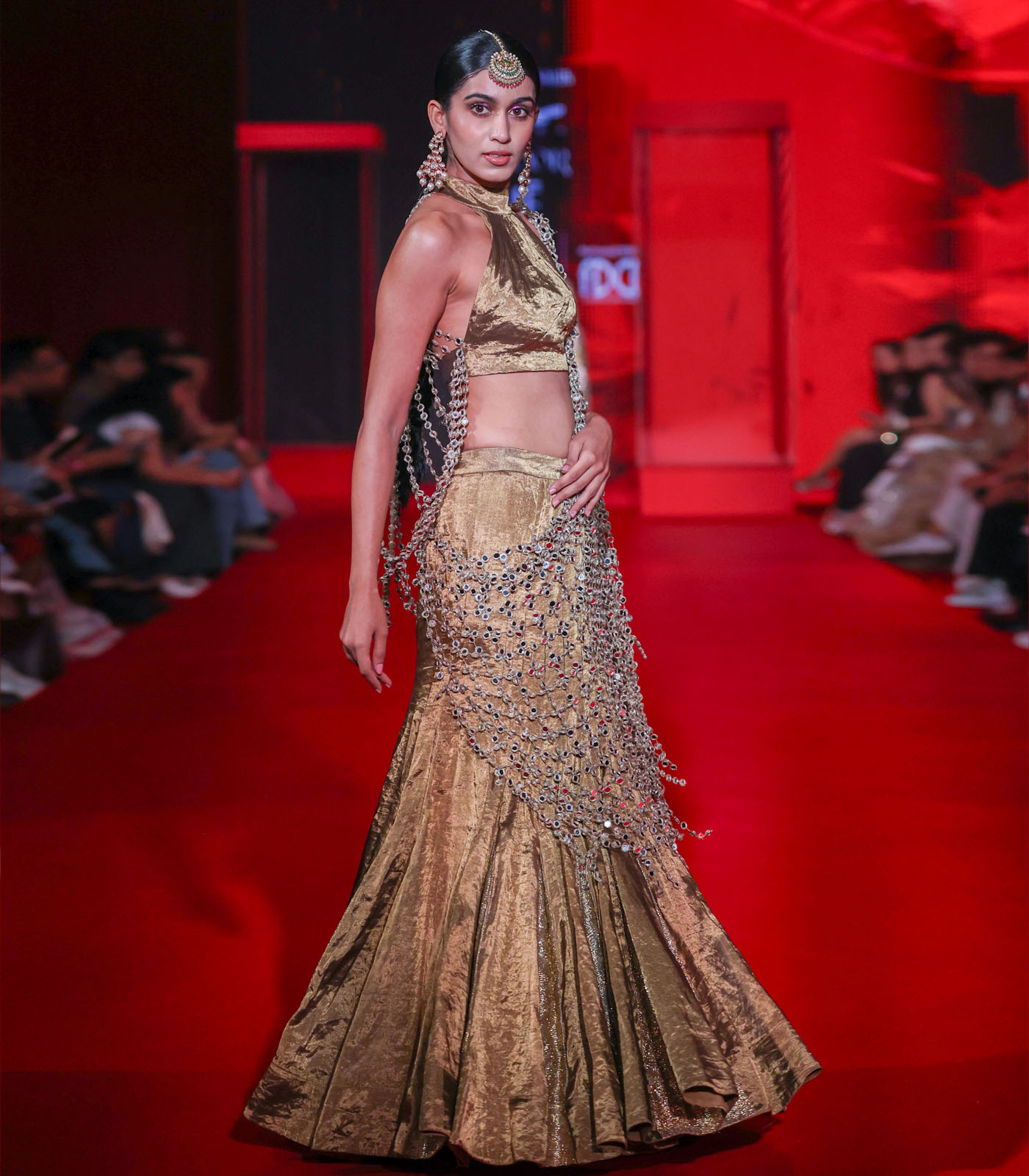 This fishtail lehenga is in bronze tissue with gold Gota detailing. It’s paired with a matching halter neck blouse with mirror jhalar detailing in the back. A mirror jaal attached palla completes the look.
