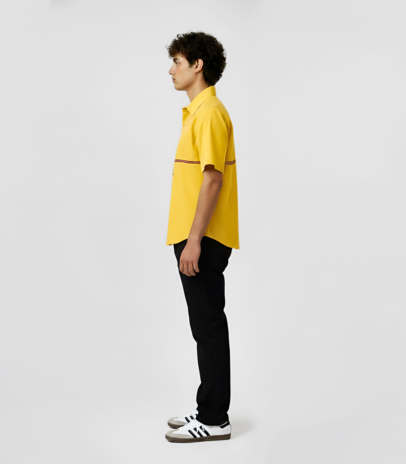 This mango yellow and tuscan red shirt is designed with a clean, structured silhouette and tuscan red horizontal stripe accent on the front. It features basic half sleeves with a horizontal stripe in the back and is finished with a classic collar. Easy to style for both work and everyday wear, this shirt combines function with a polished look.