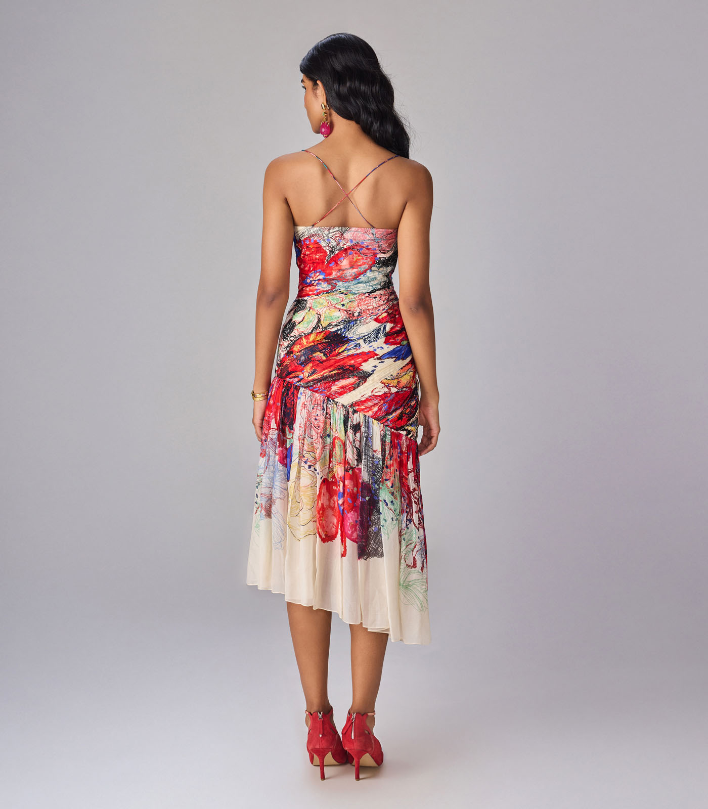 Abstract floral print asymettric midi dress with hand micro pleat bodice and noodle straps