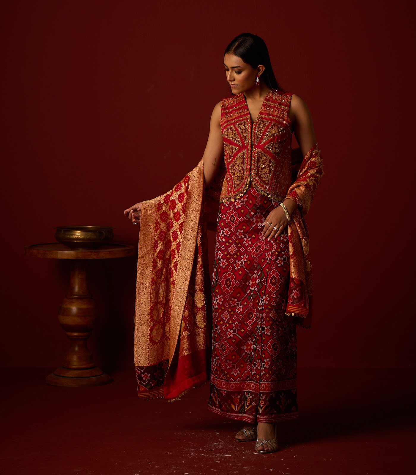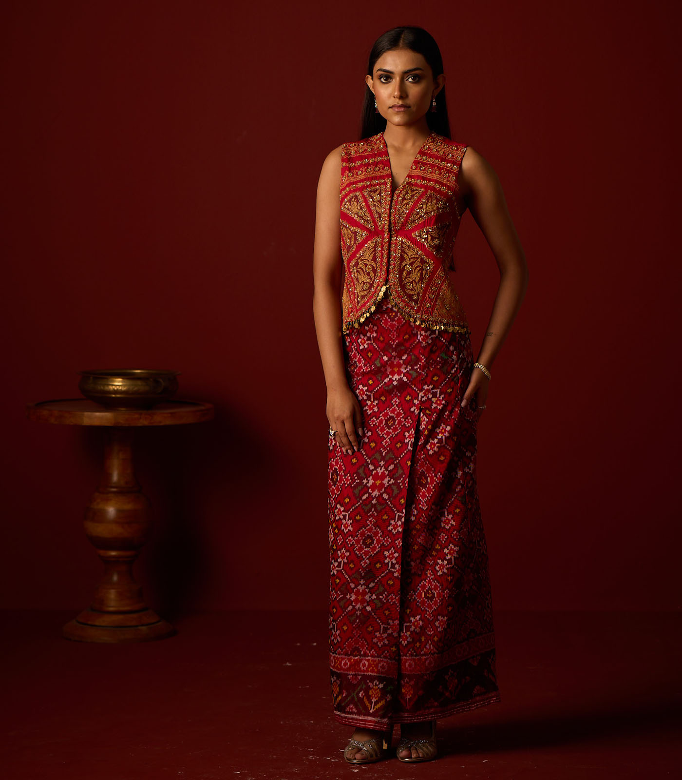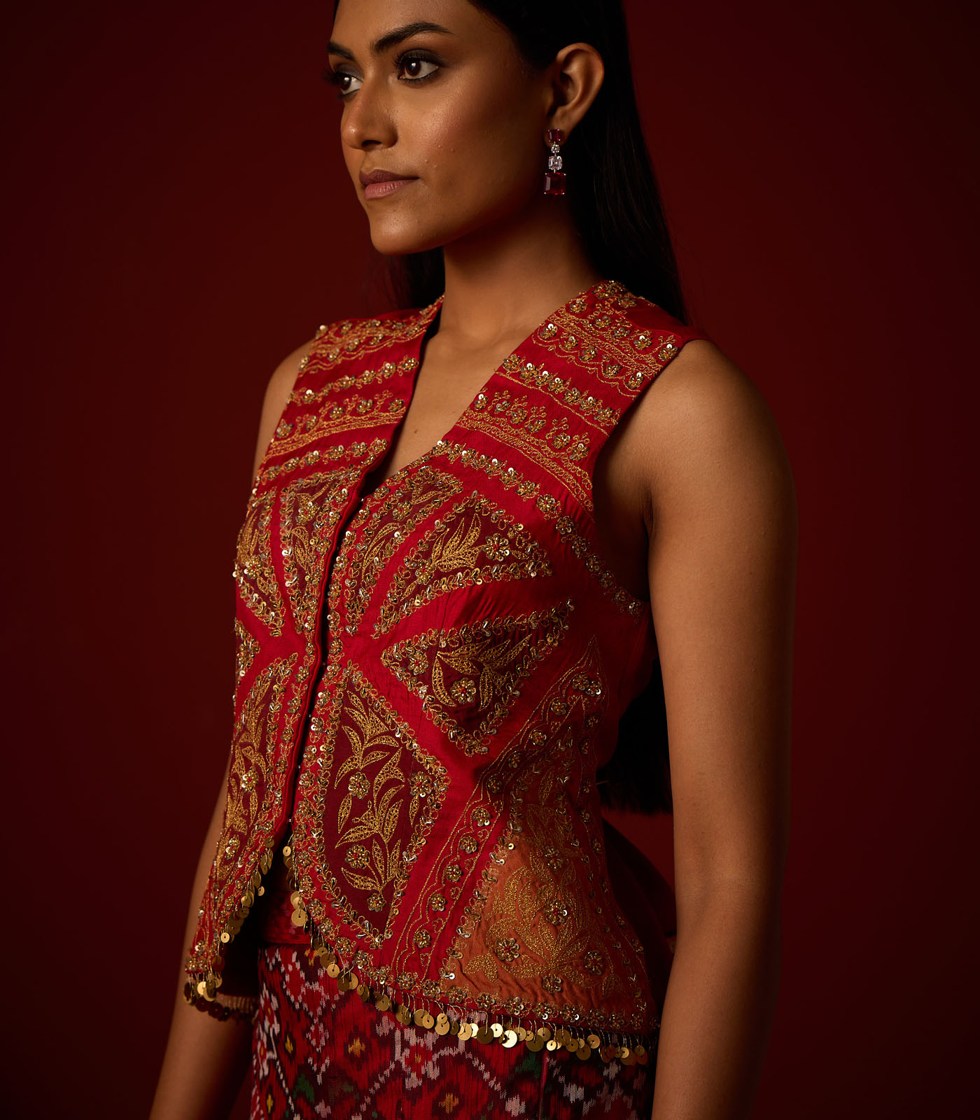 Satin Silk Gilet Embellished With Marodiwork On Appliqués And Enhanced With Tassel Details