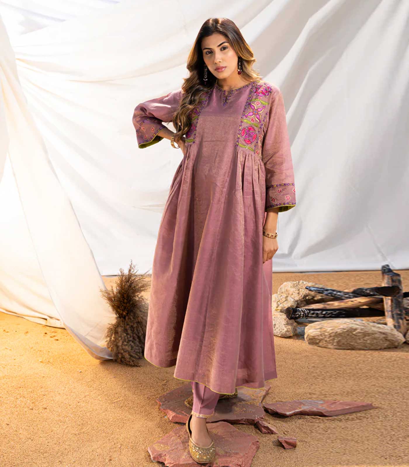 The highlight of this ensemble lies in the beautifully embroidered yoke, an exquisite tribute to Suzani motifs. Crafted with silk threads and gold zari, the yoke adds an element of opulence and cultural richness to the kurta.