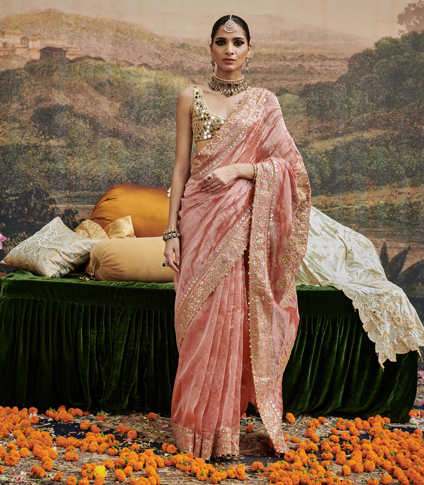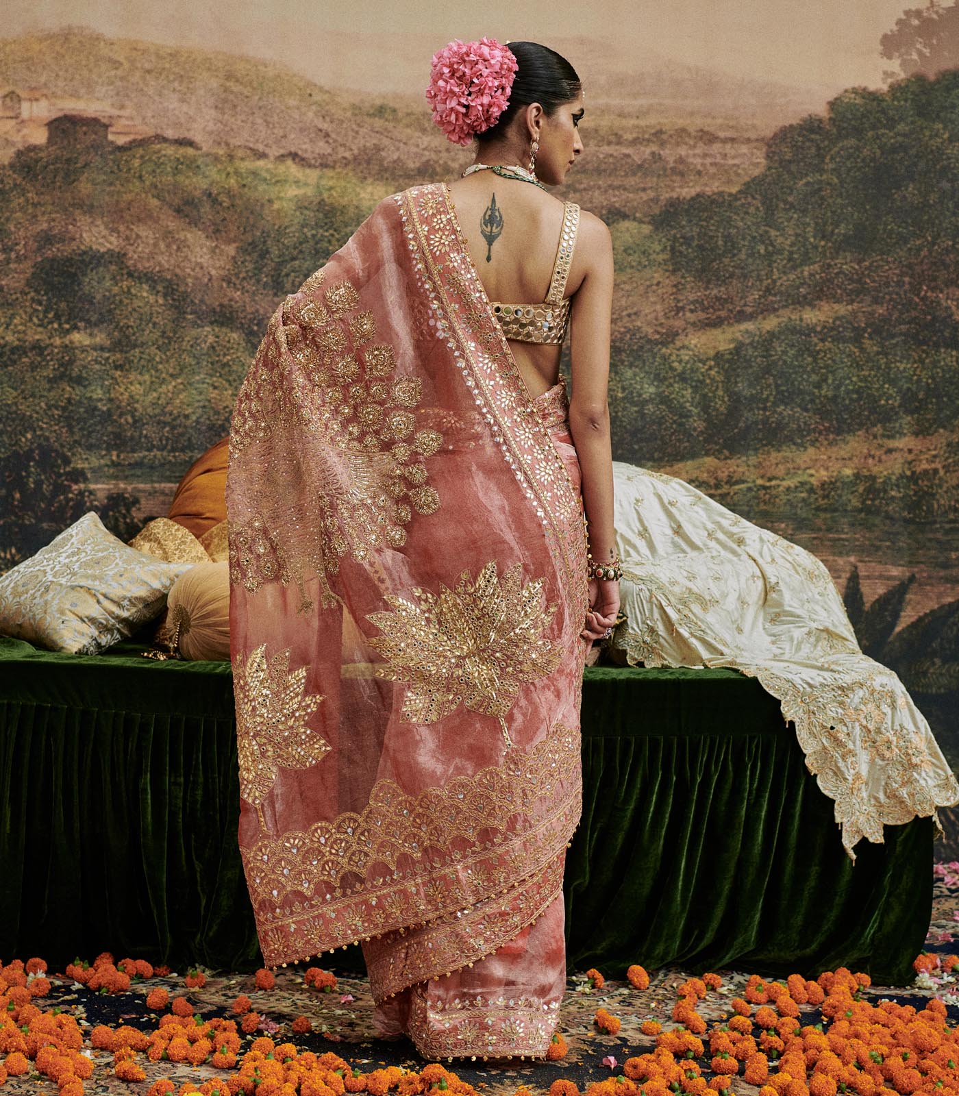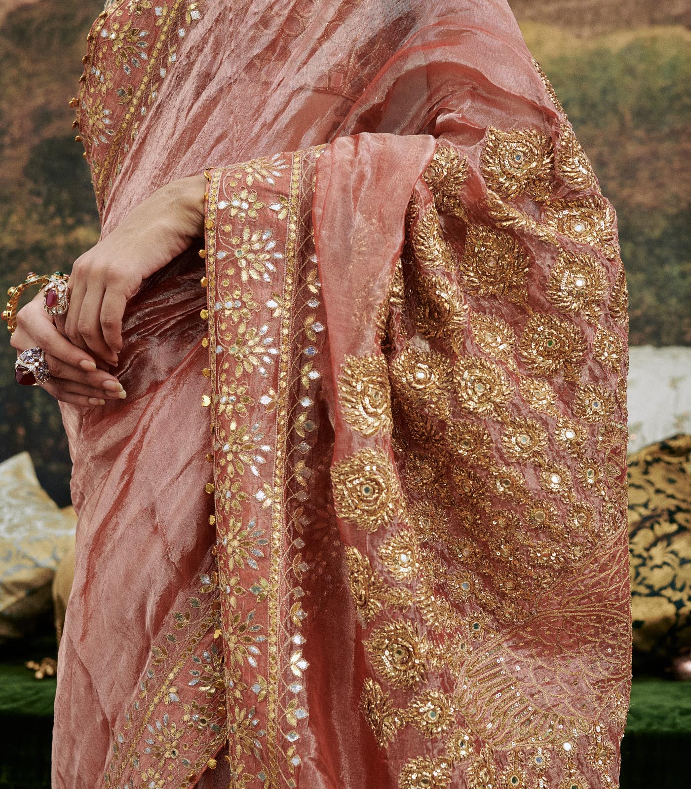 The saree is made in tissue fabric with mirror work blouse on gota lined with chanderi silk it features details on border and pallu with gota and ghungroos.