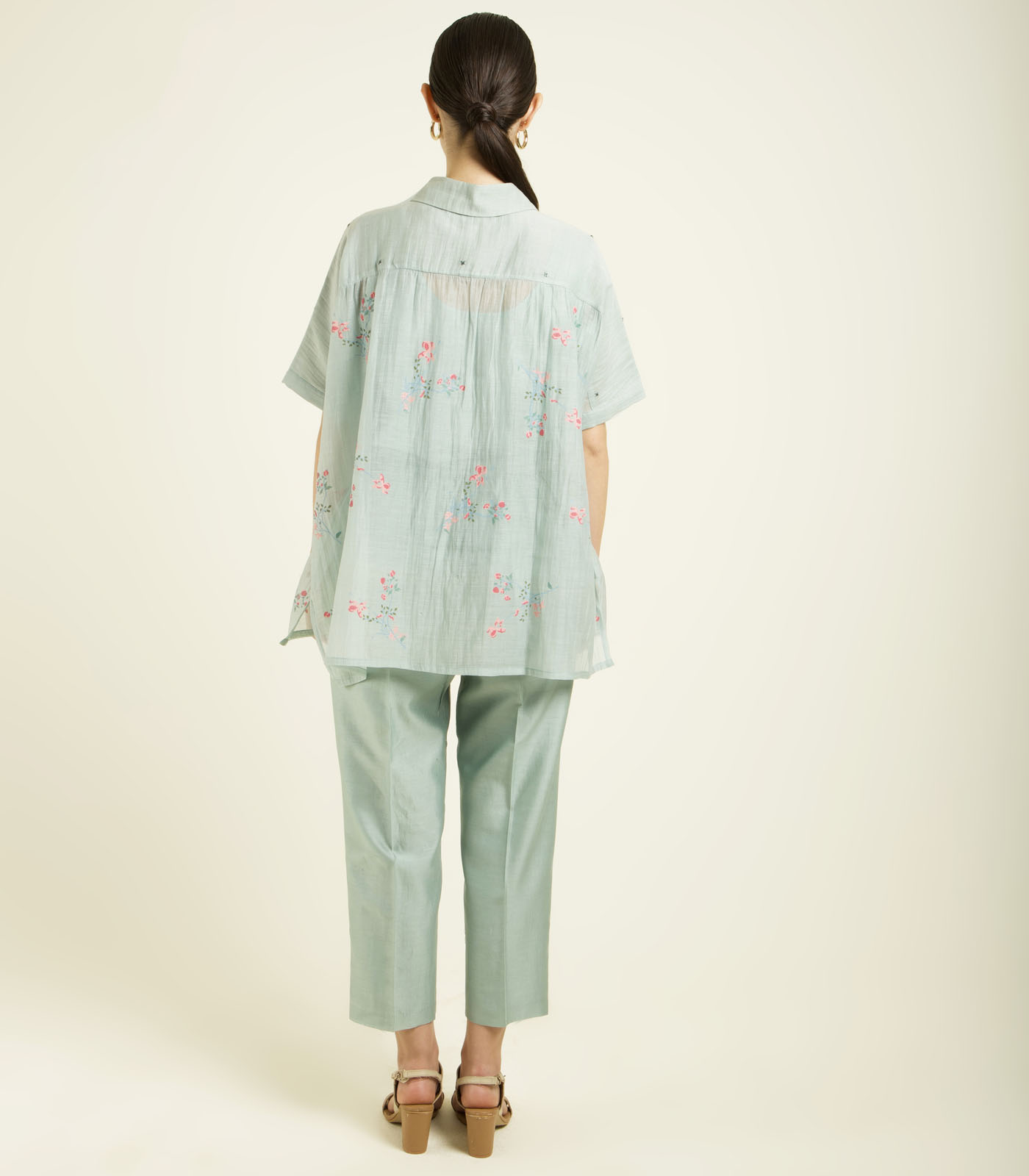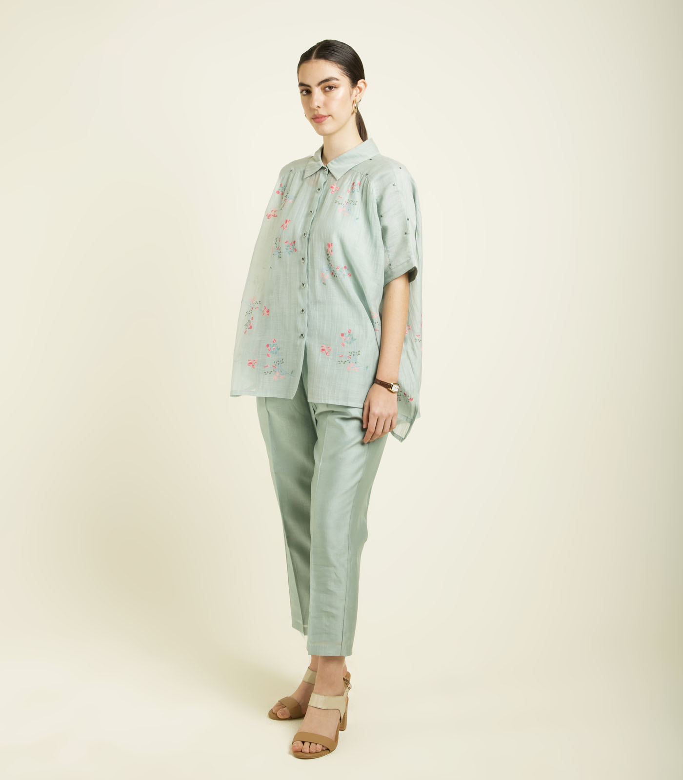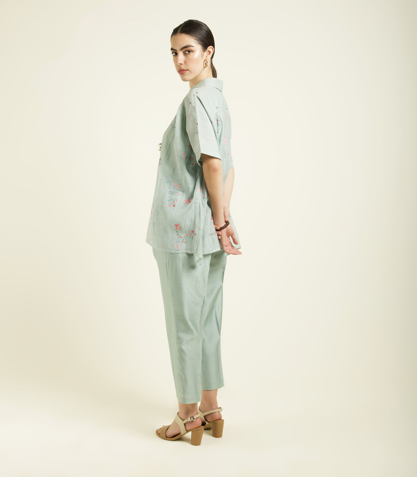 MINT KAFTAN SHIRT IN MUL CHANDERI WITH EMBROIDERY DETAILS AND STRAIGHT PANTS IN SILK CHANDERI