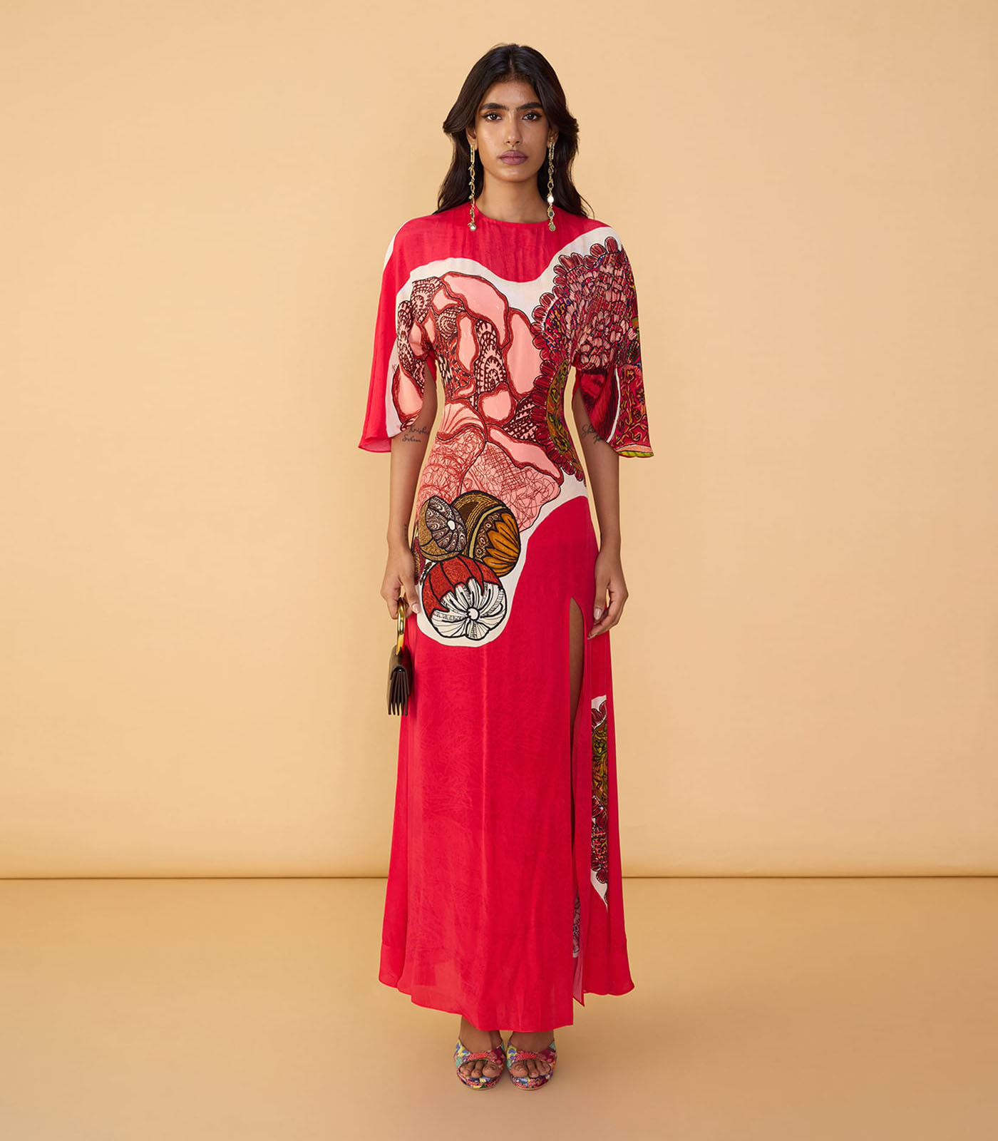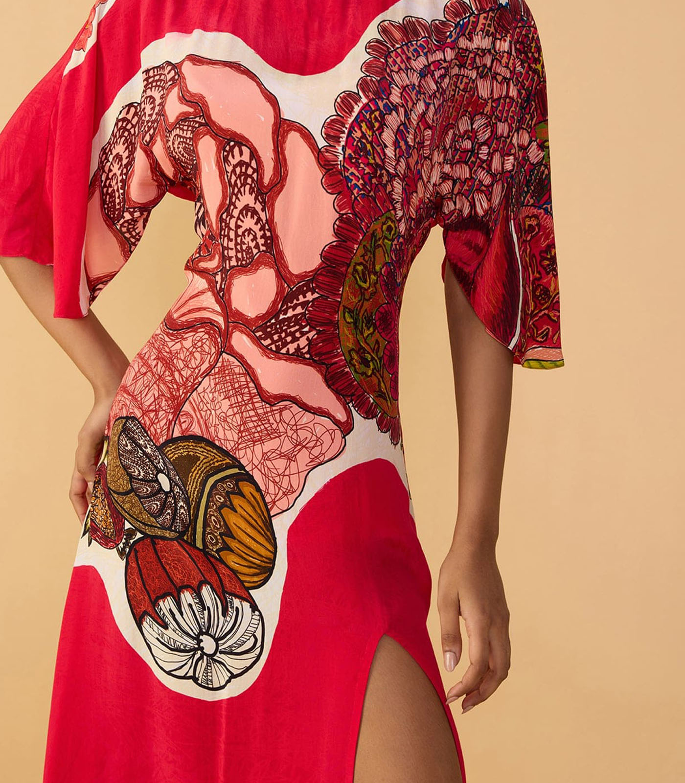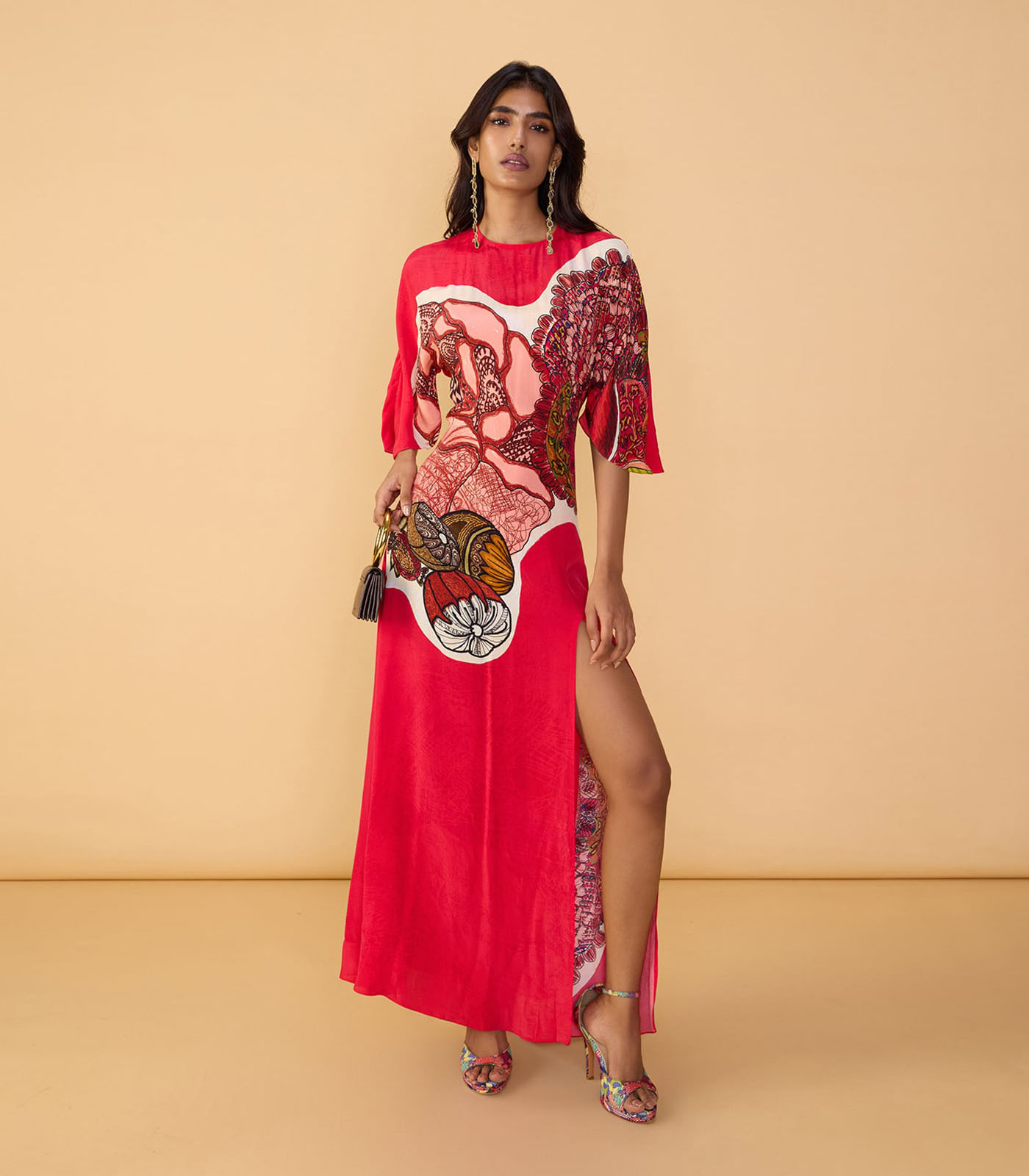 Abstract print kaftan style maxi dress with customisable side slit and 3/4 sleeves